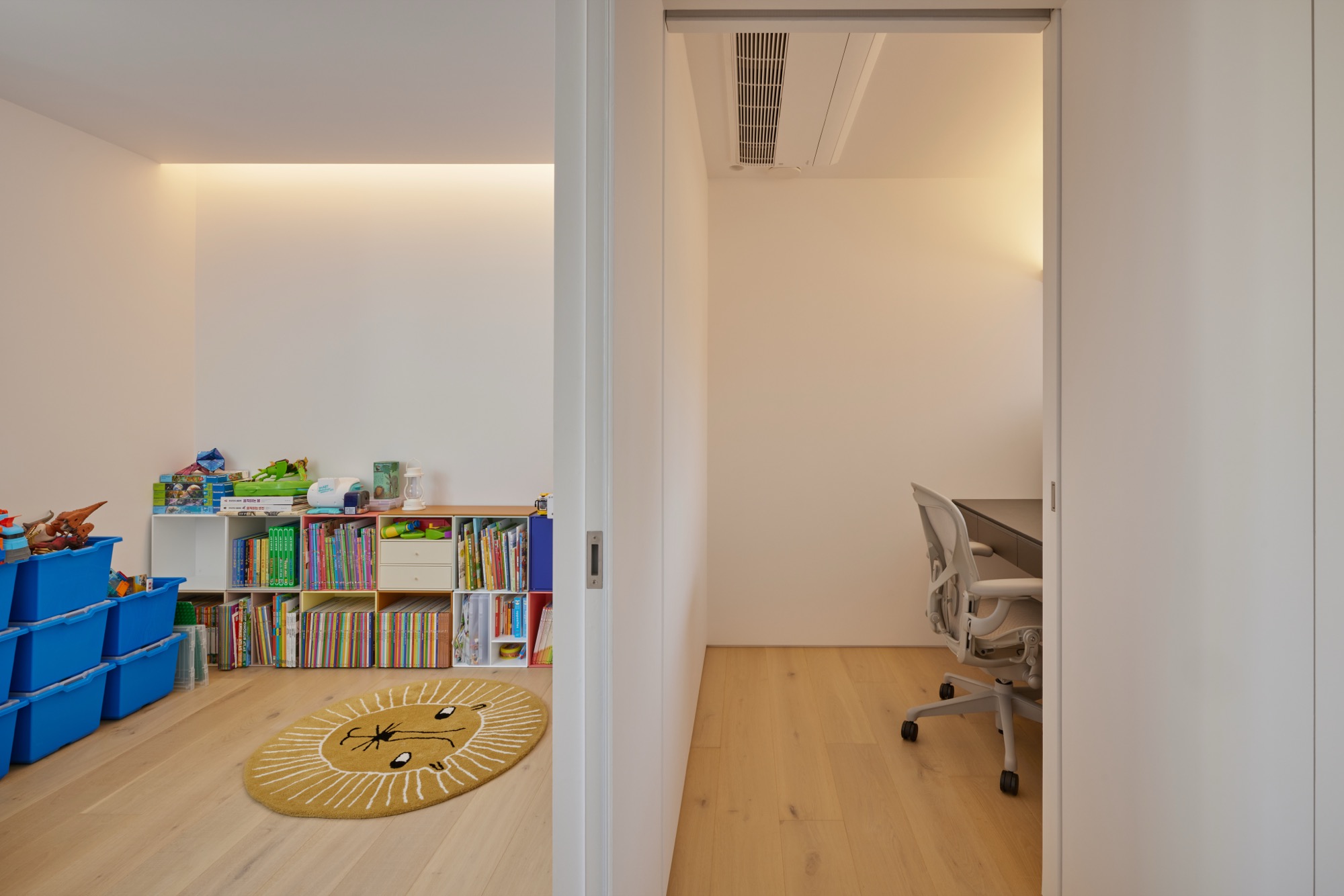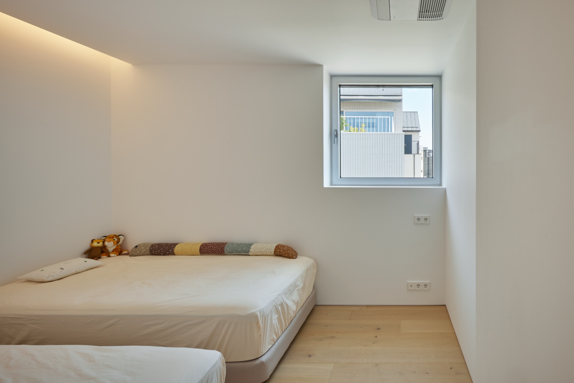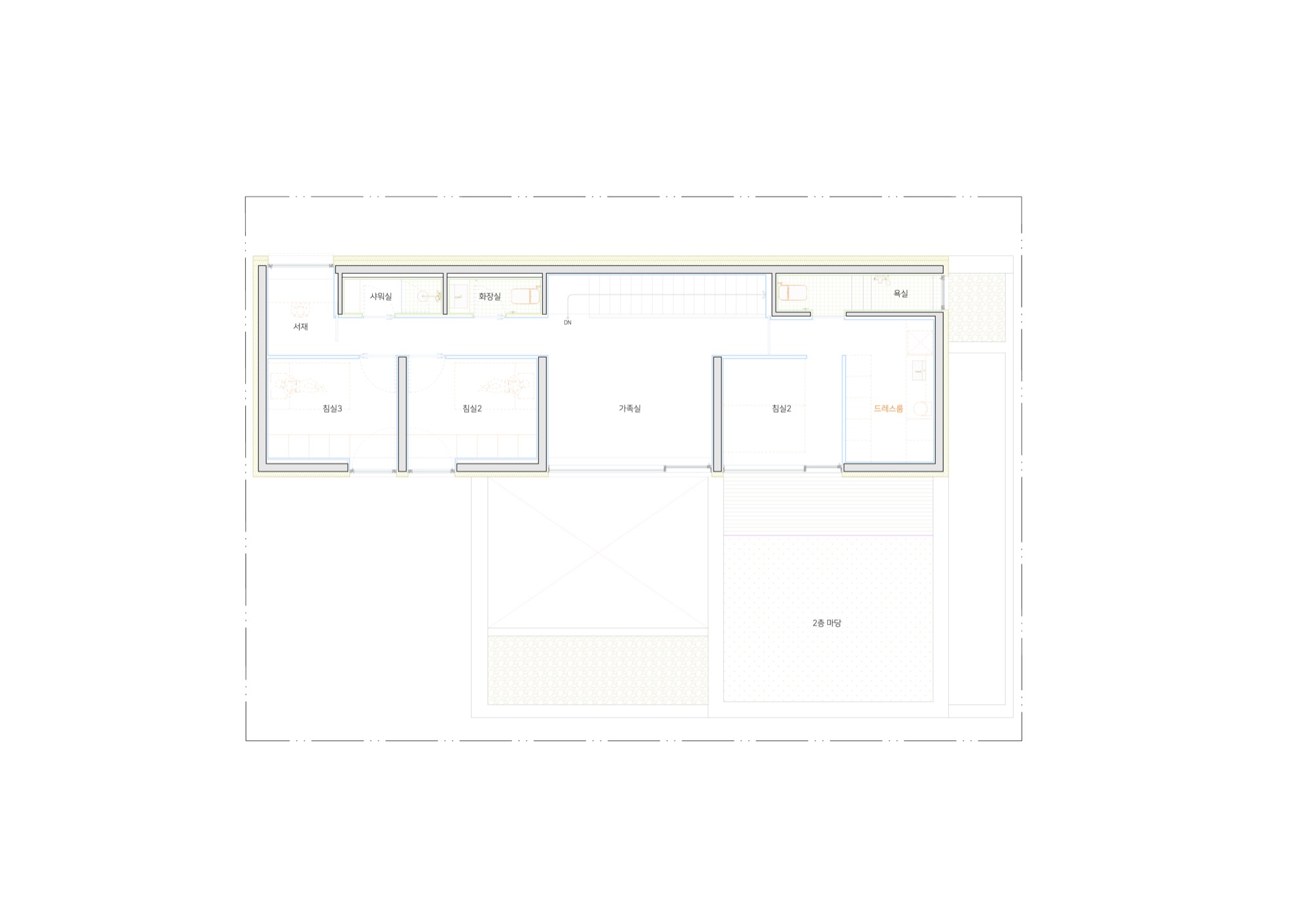 2층은 가족만의 공간으로 가족실과 부부침실, 아이방, 놀이방, 서재, 화장실, 샤워실 등이 있다. 계단을 통해 2층 가족실로 올라오면 통창으로 1층 중정에 심은 산딸나무가 보인다. 부부침실에는 외부로 나갈 수 있는 조경 공간을 두어 어디에 있어도 계절의 변화를 느낄 수 있도록 했다. ◼︎