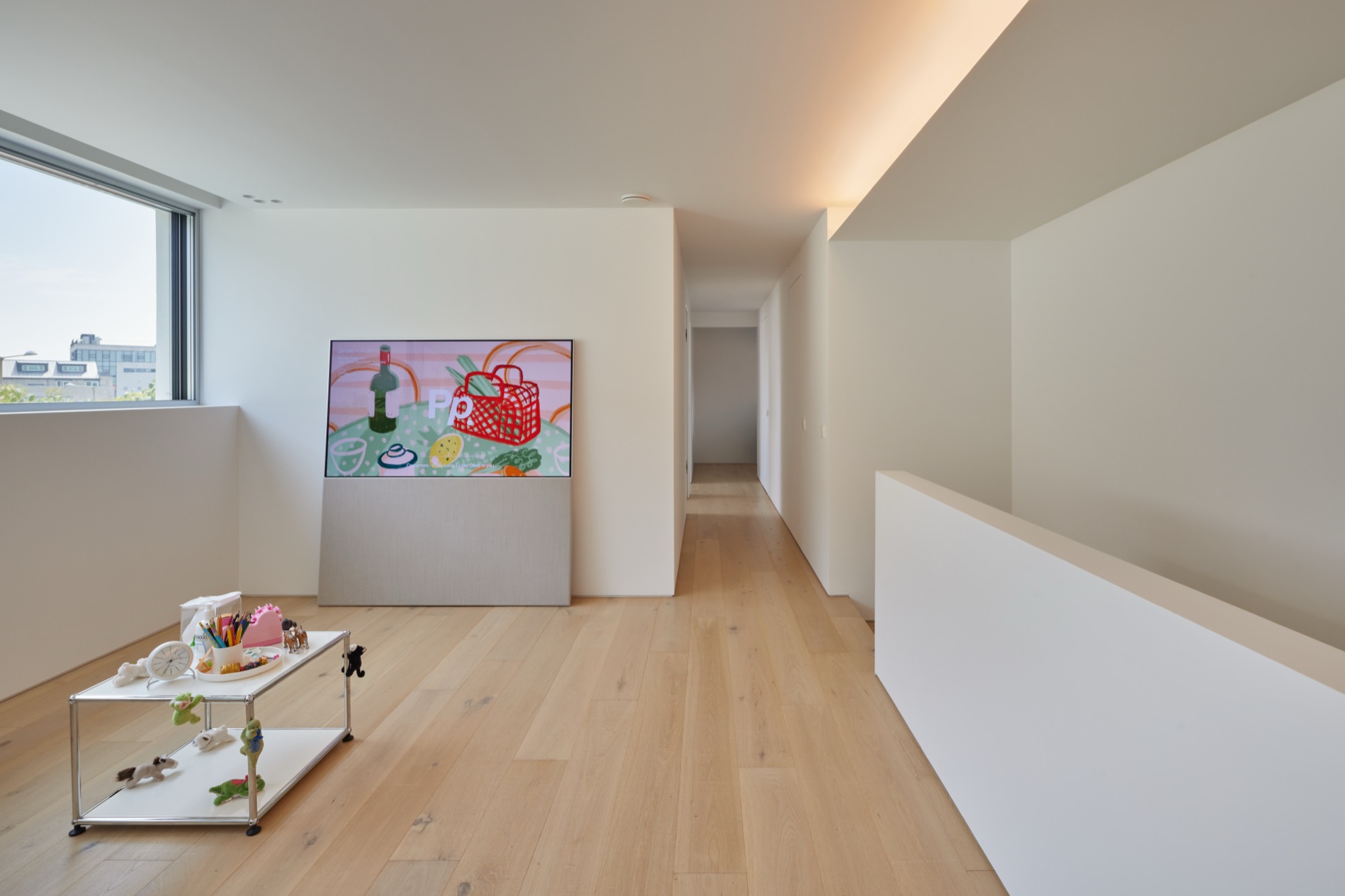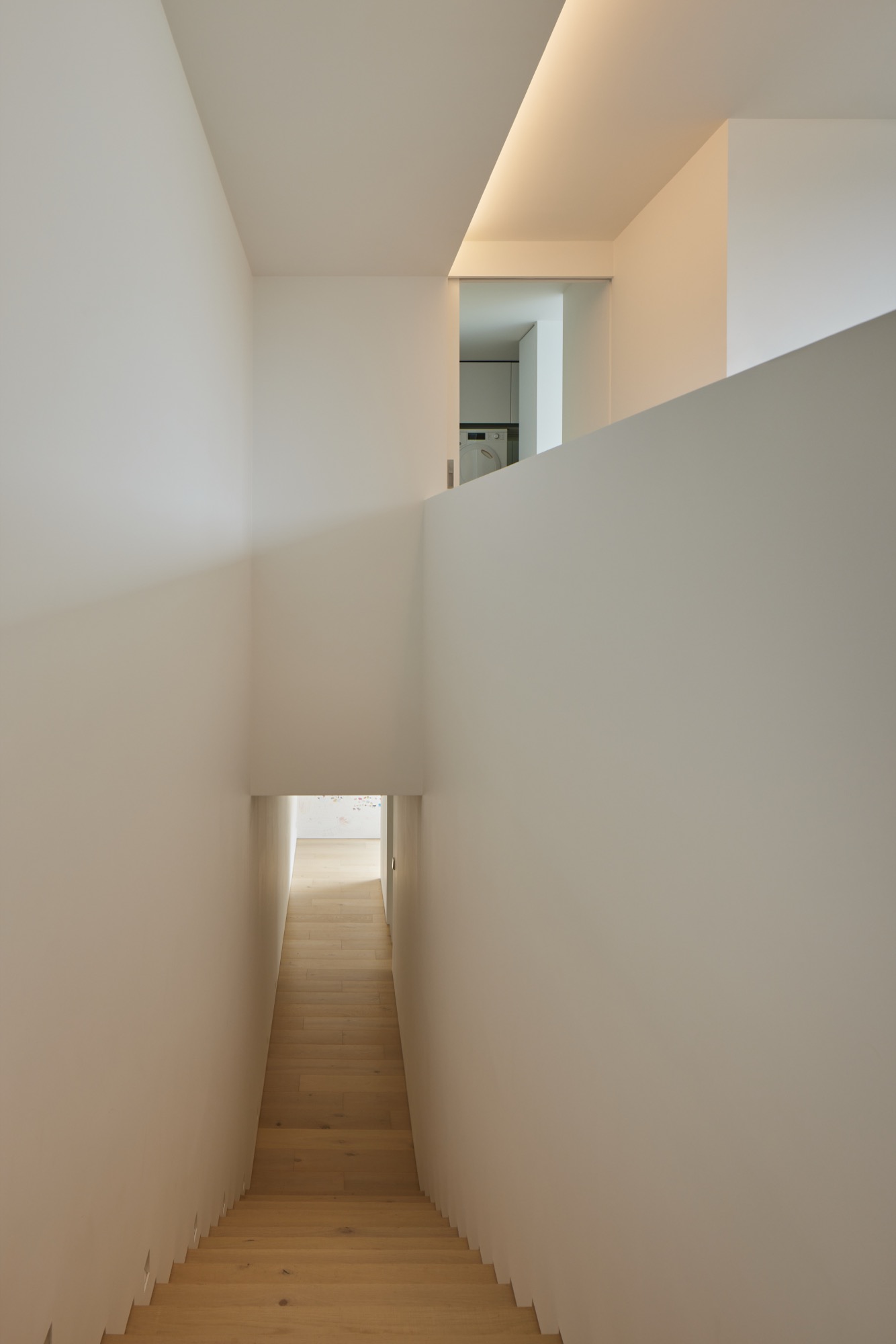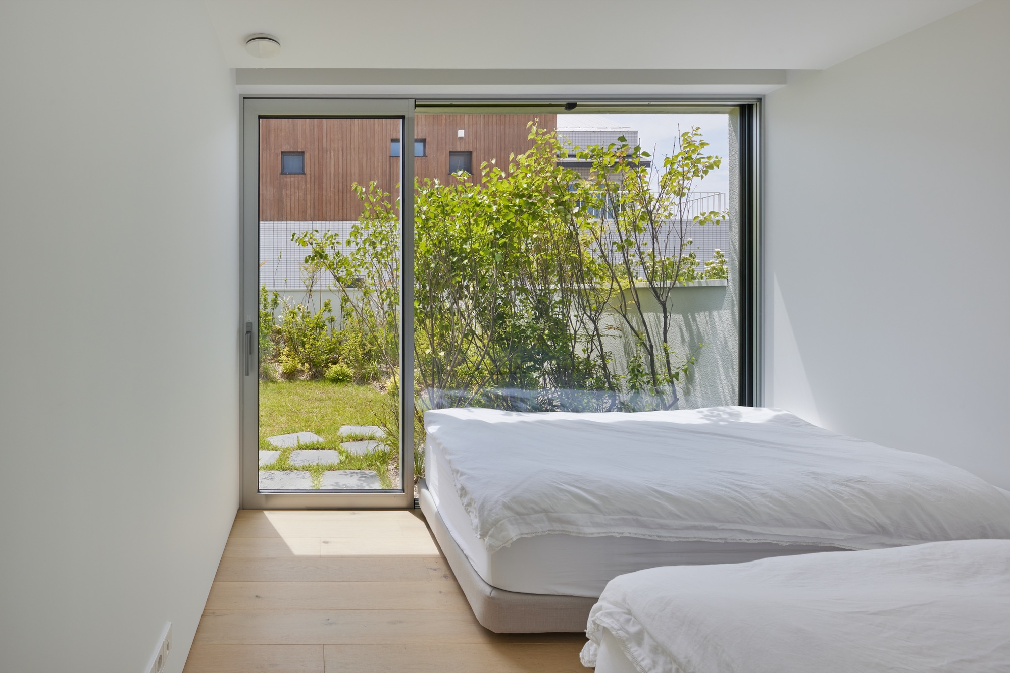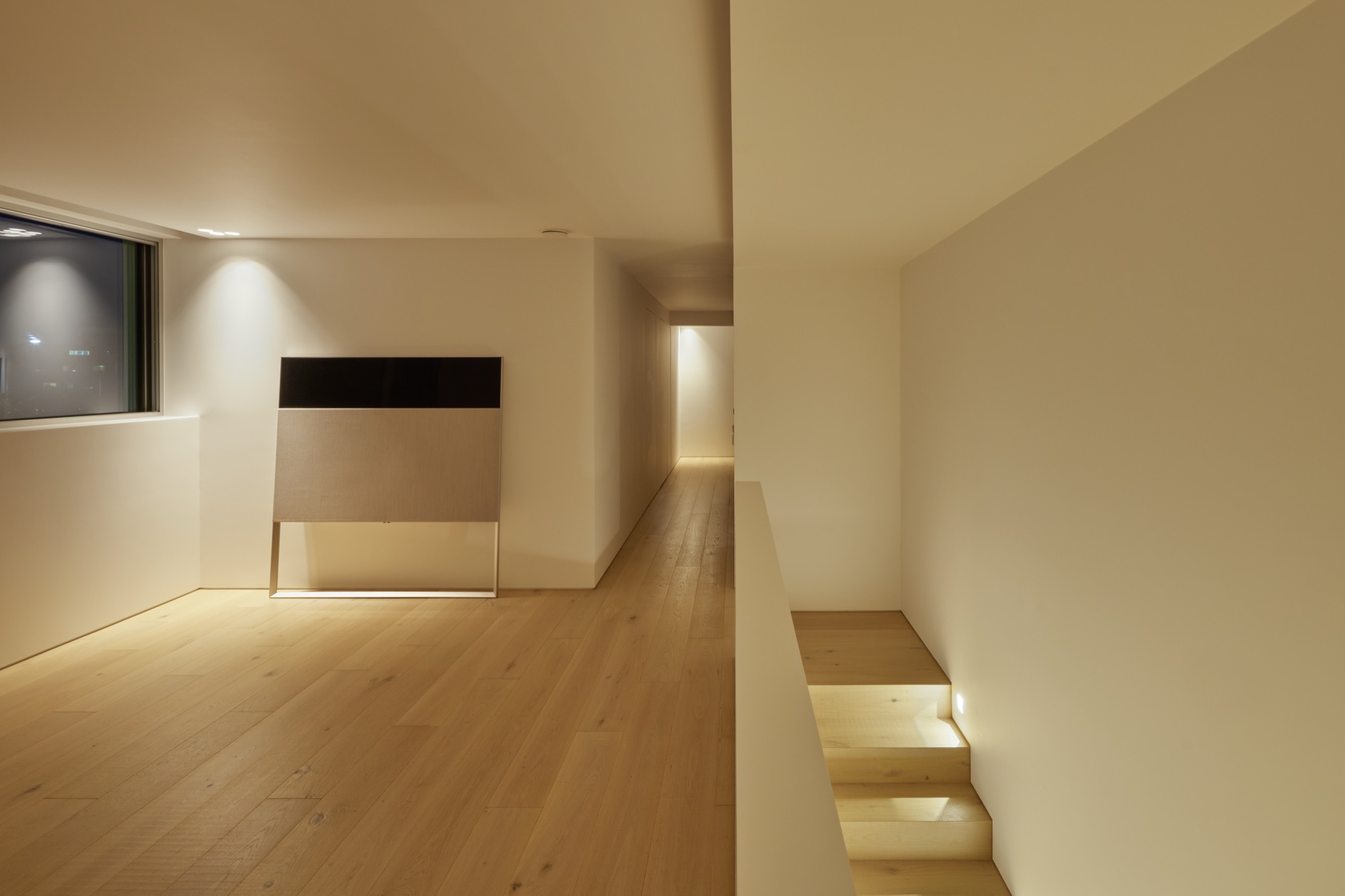 2층은 가족만의 공간으로 가족실과 부부침실, 아이방, 놀이방, 서재, 화장실, 샤워실 등이 있다. 계단을 통해 2층 가족실로 올라오면 통창으로 1층 중정에 심은 산딸나무가 보인다. 부부침실에는 외부로 나갈 수 있는 조경 공간을 두어 어디에 있어도 계절의 변화를 느낄 수 있도록 했다. ◼︎