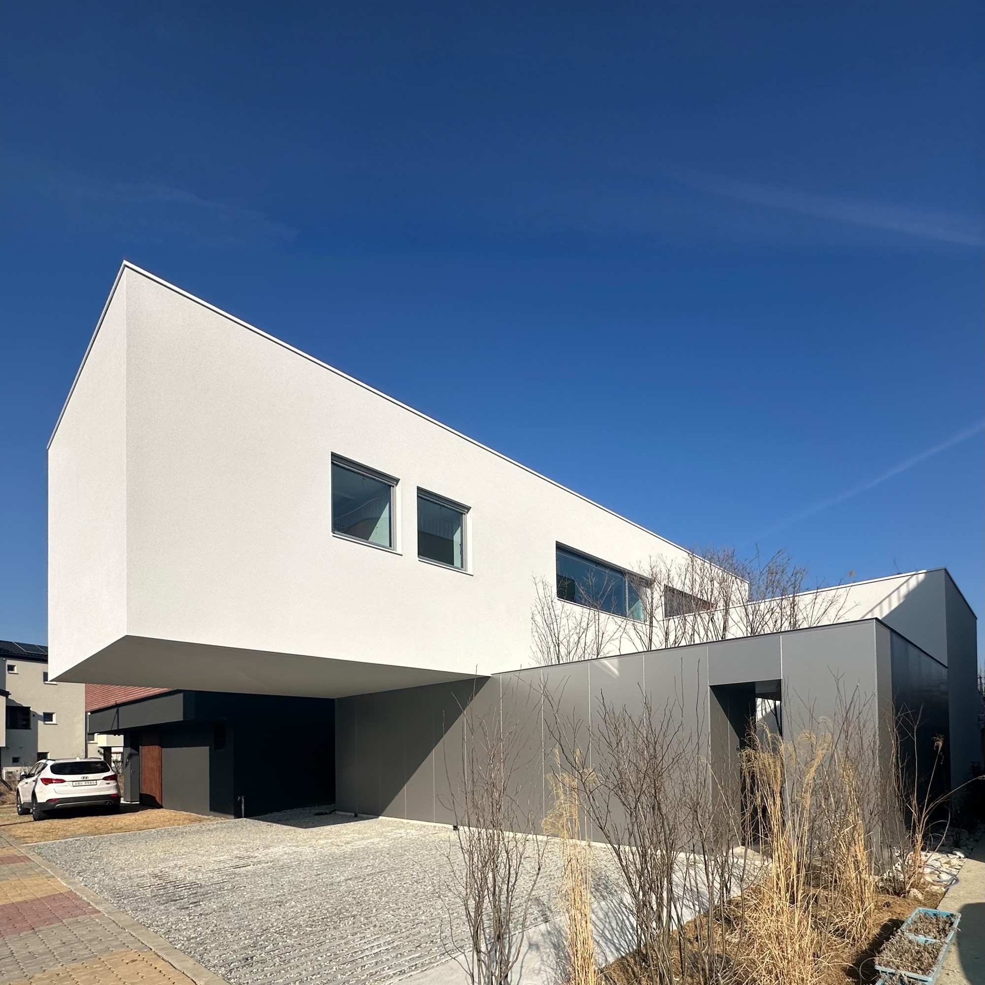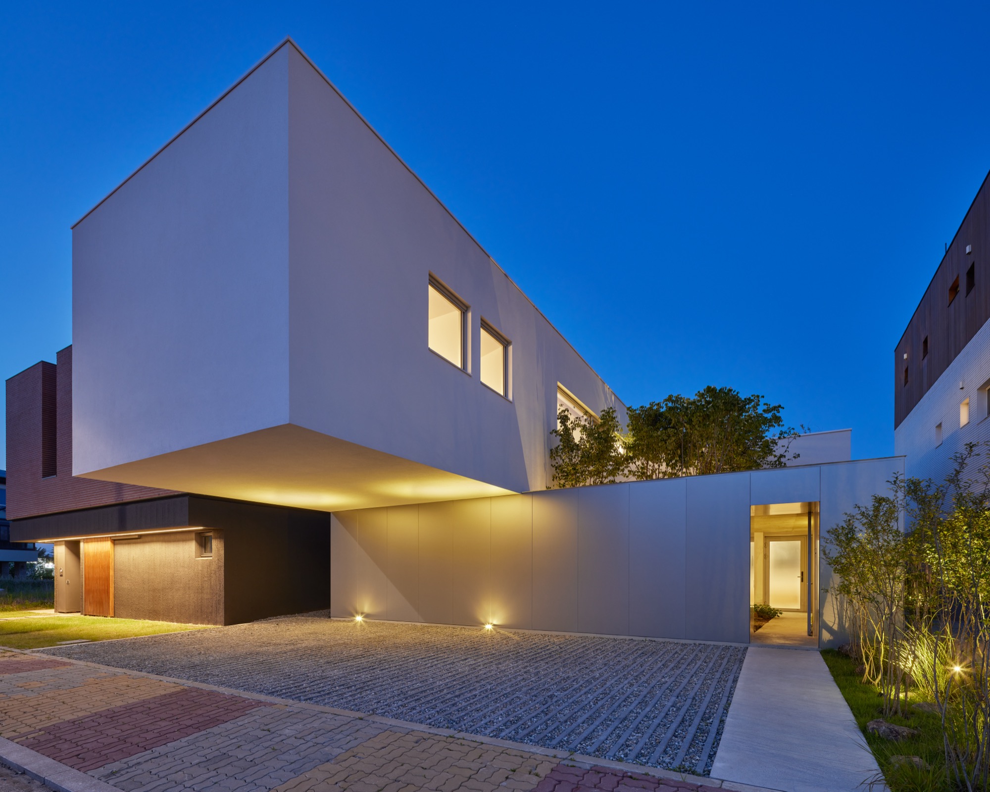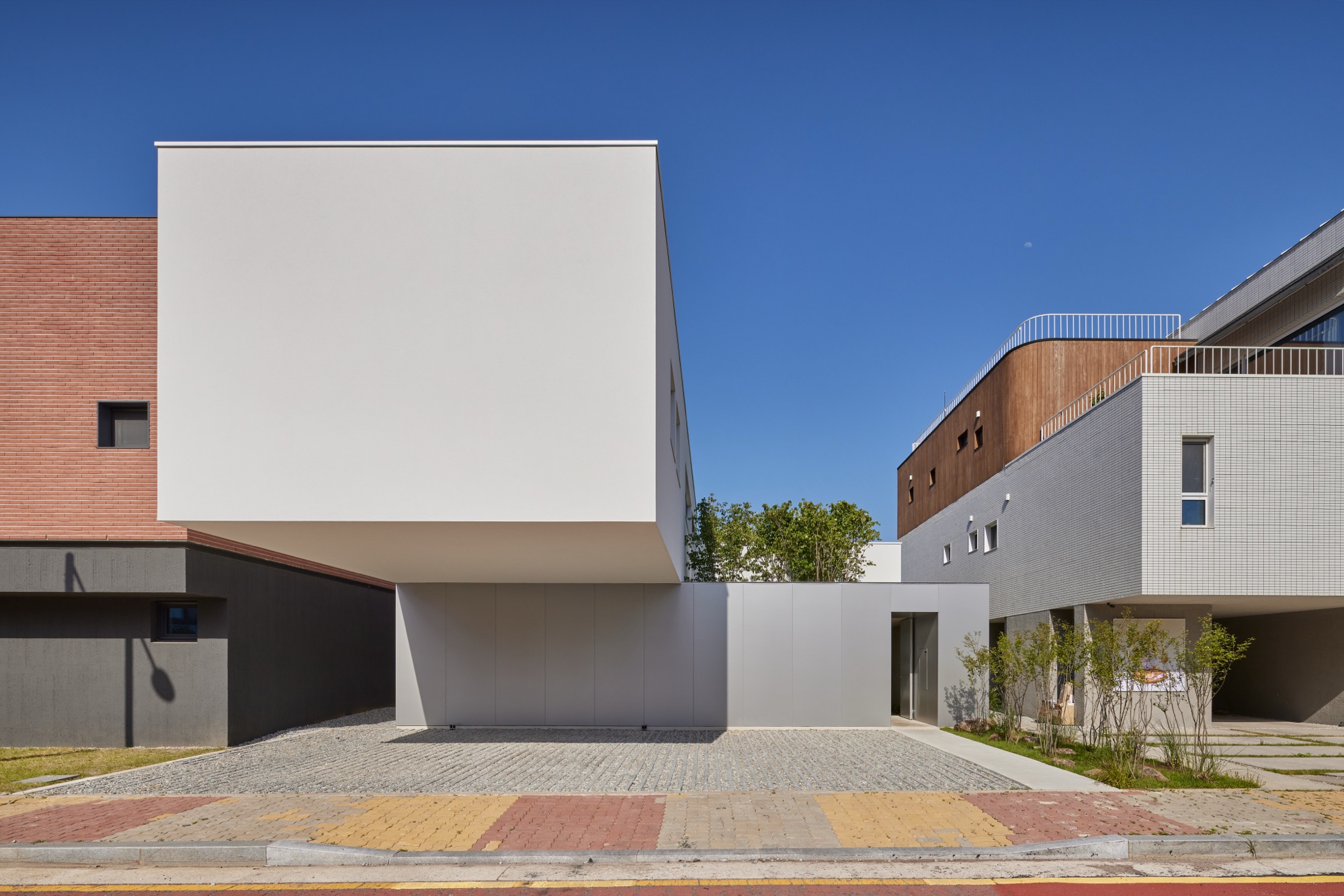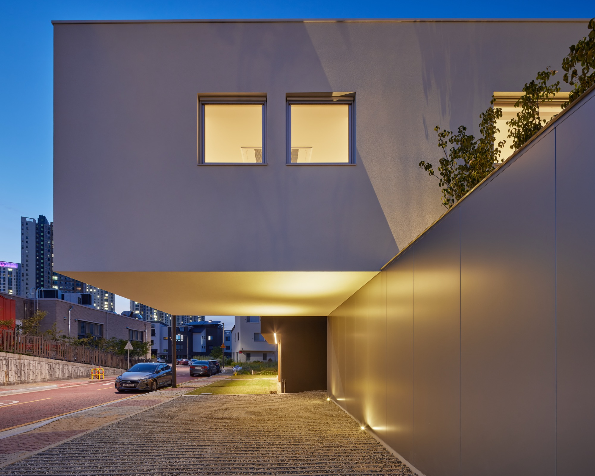 30대 중후반의 부부와 두 명의 아들을 위한 이 집은 2층으로 계획했다. 주변 집은 모두 3층으로 구성돼 왜소해 보이지 않을까 우려하면서도 건축주는 이층집을 원했다. 이를 해결하기 위해 형태적 긴장감을 주어 주변 집보다 먼저 시선을 끌도록 했다. 2층 매스가 6m 떠 있는 캔틸레버 주택은 당당함을 드러낸다.