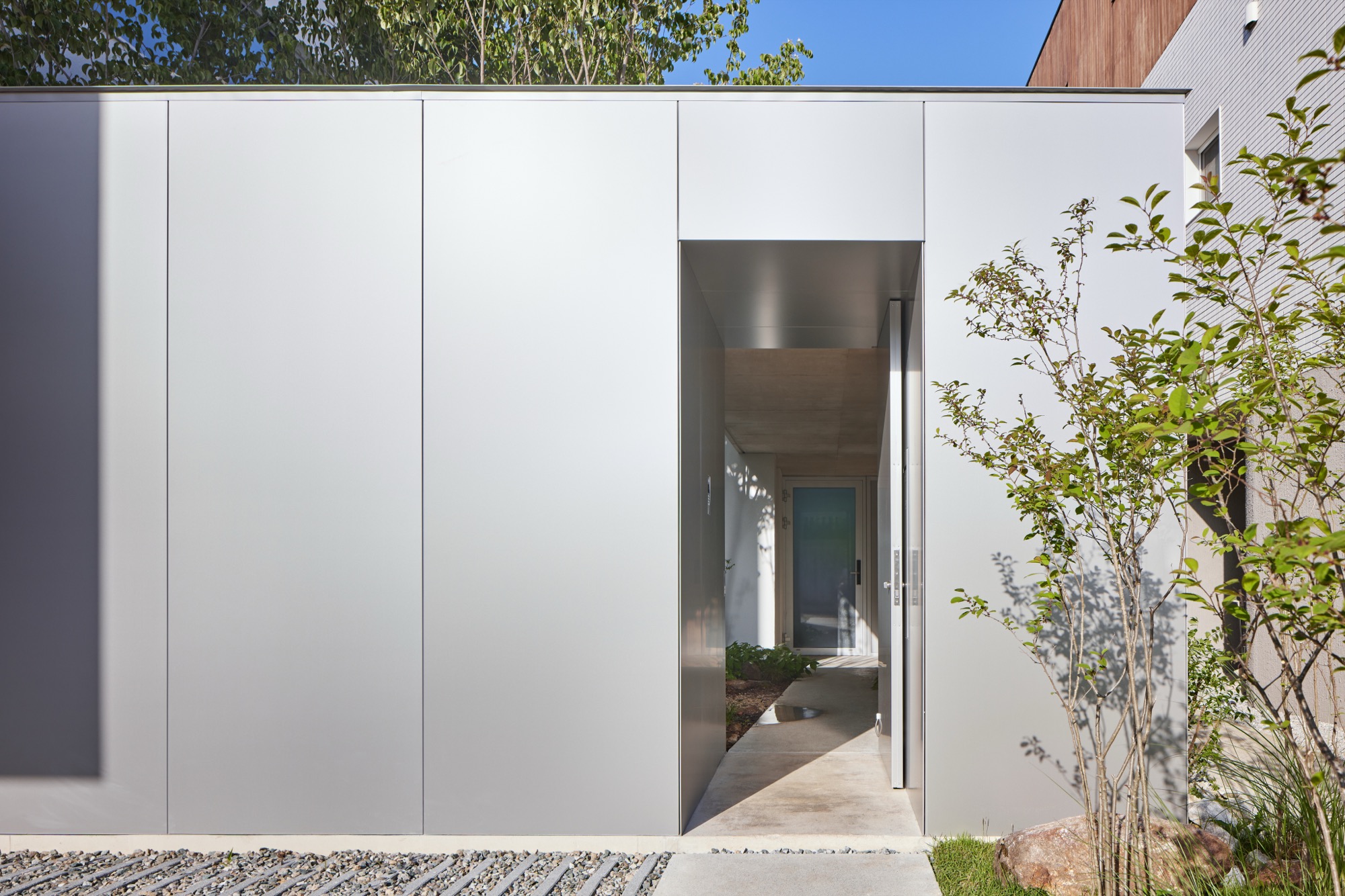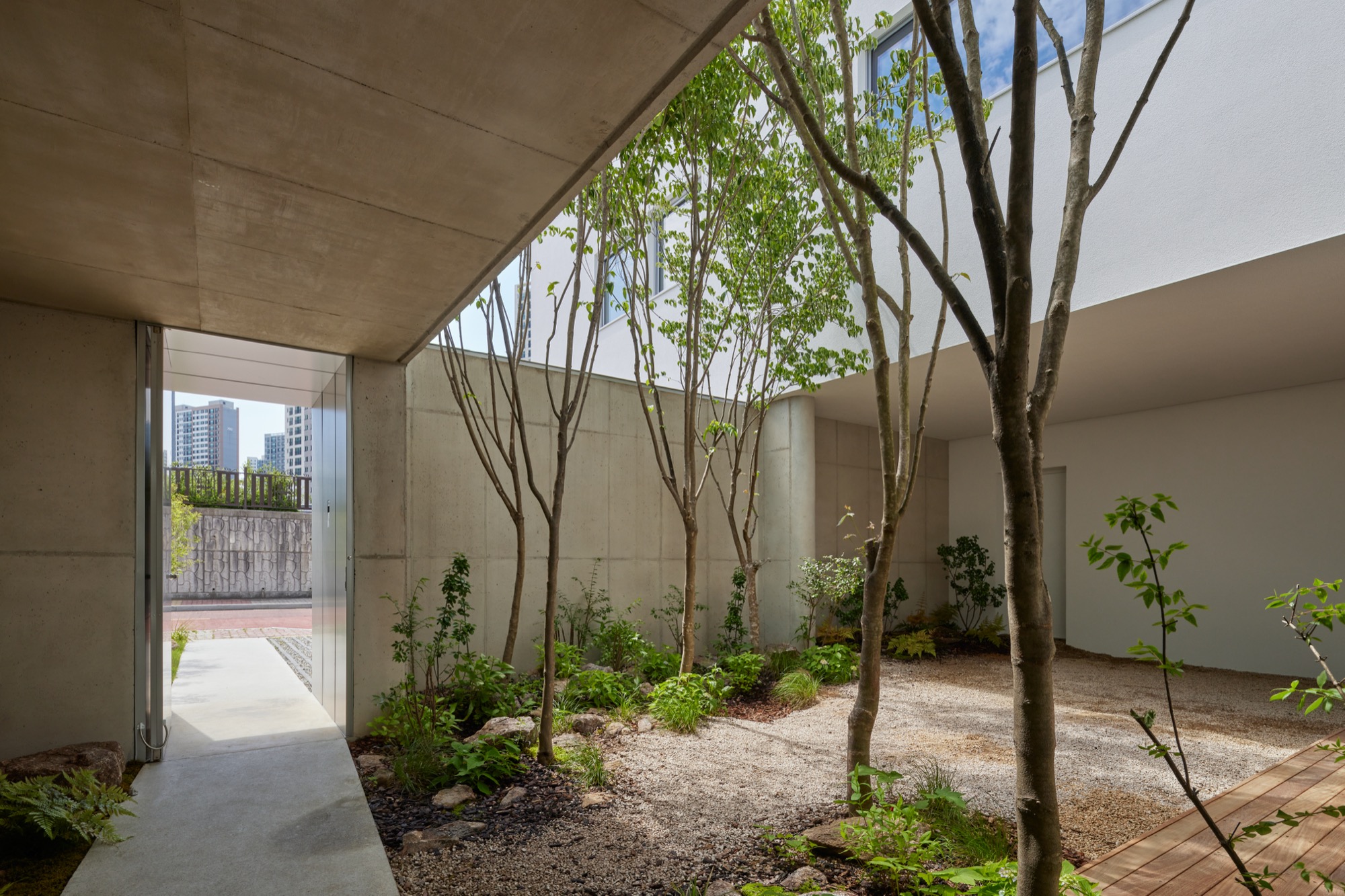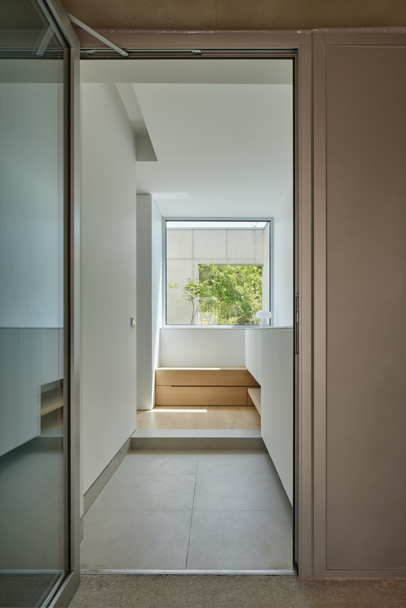 집으로 들어가는 동선을 가능한 한 길게 계획했다. 주차하고, 집안에 들어가 가족을 만나기 전에 긴 동선을 걸으며 밖에서 겪은 이런저런 이들을 조금이라도 정리하고, 조금 더 온화한 마음으로 만날 수 있길 바랐다. 그래서 사이집은 대지의 끝에서 끝까지를 진입 동선으로 사용한다. 대문을 열고 들어서면 비를 맞지 않고 진입할 수 있는 동선이 나온다. 마당을 지나 현관문을 열고, 후정의 푸른 식재까지 바라보는 일련의 진입 과정을 거친다.