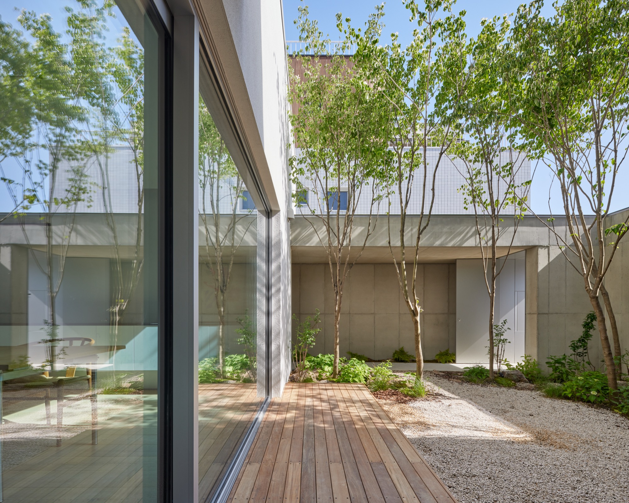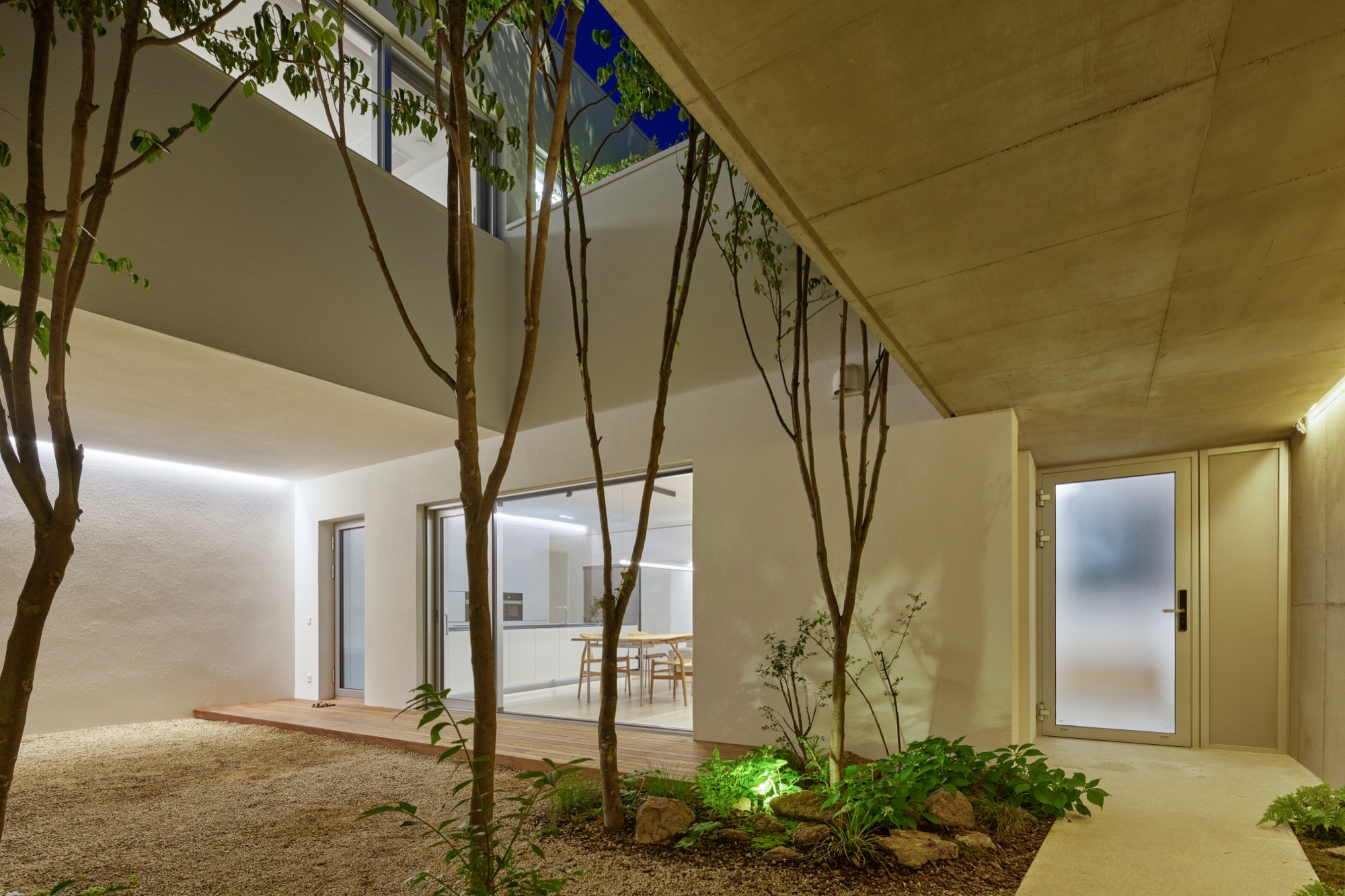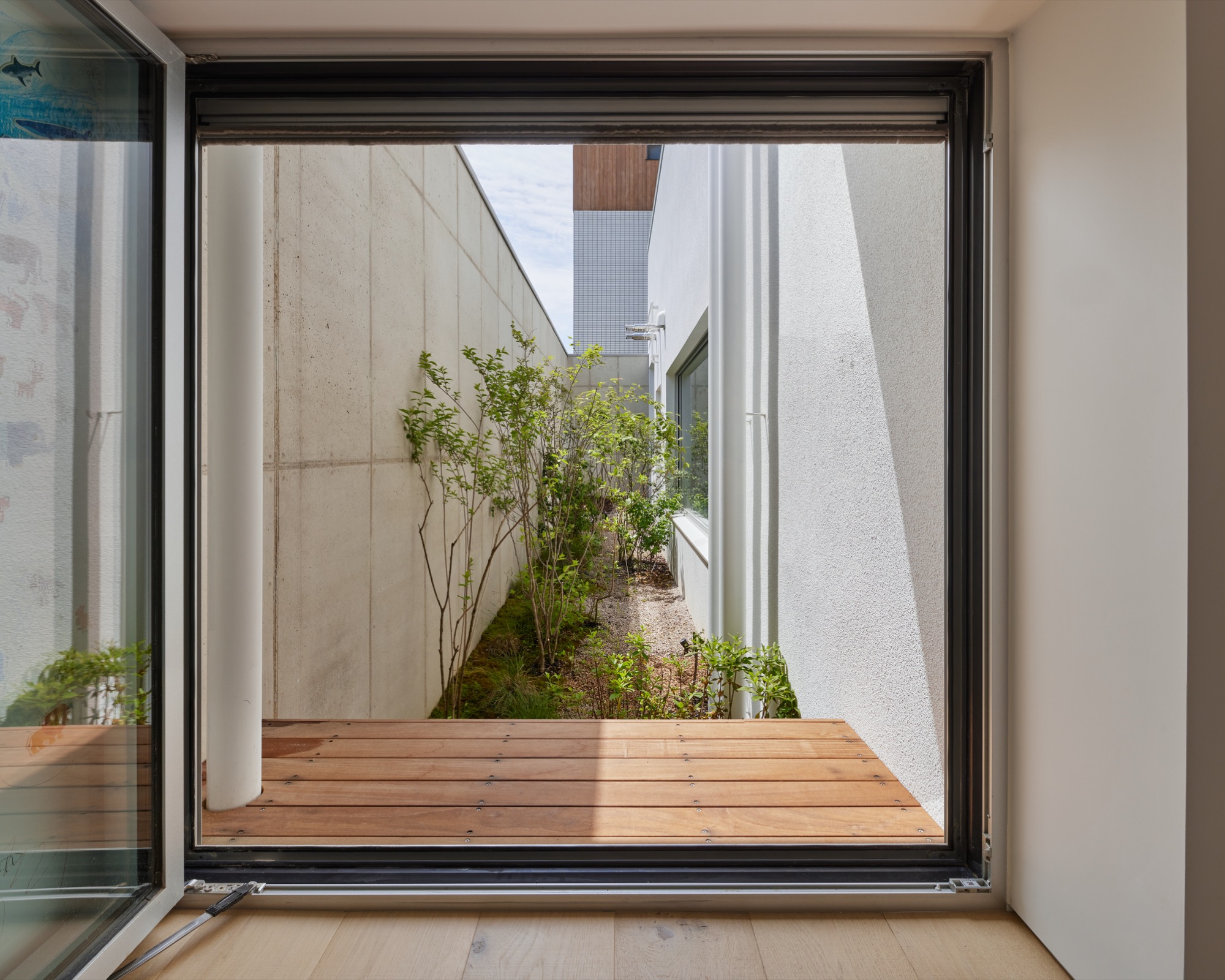 집으로 들어가는 동선을 가능한 한 길게 계획했다. 주차하고, 집안에 들어가 가족을 만나기 전에 긴 동선을 걸으며 밖에서 겪은 이런저런 이들을 조금이라도 정리하고, 조금 더 온화한 마음으로 만날 수 있길 바랐다. 그래서 사이집은 대지의 끝에서 끝까지를 진입 동선으로 사용한다. 대문을 열고 들어서면 비를 맞지 않고 진입할 수 있는 동선이 나온다. 마당을 지나 현관문을 열고, 후정의 푸른 식재까지 바라보는 일련의 진입 과정을 거친다.