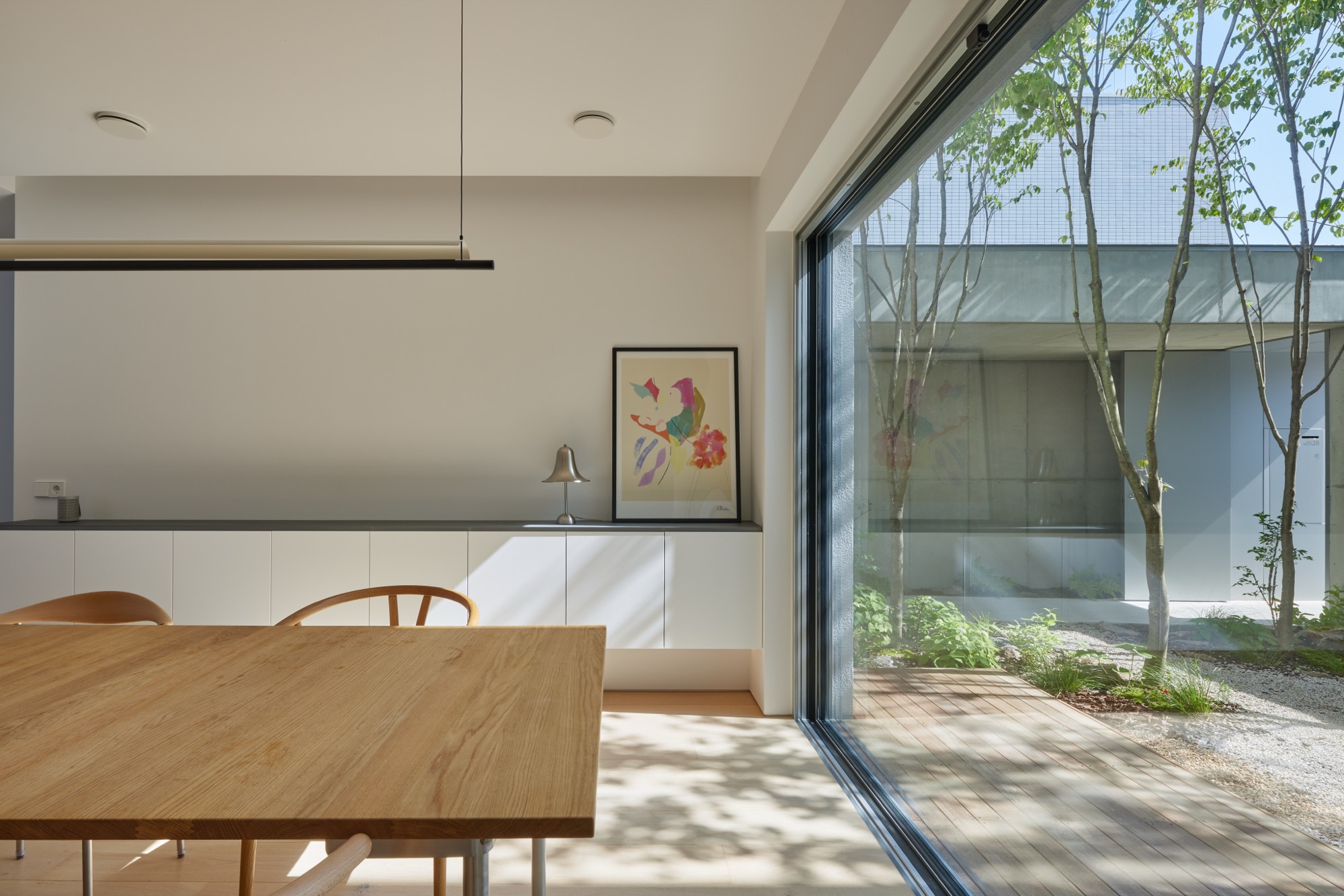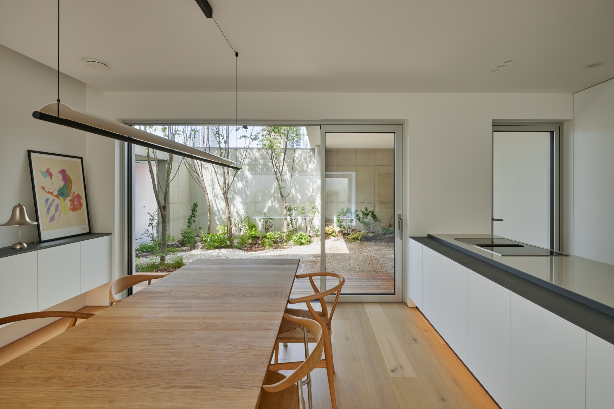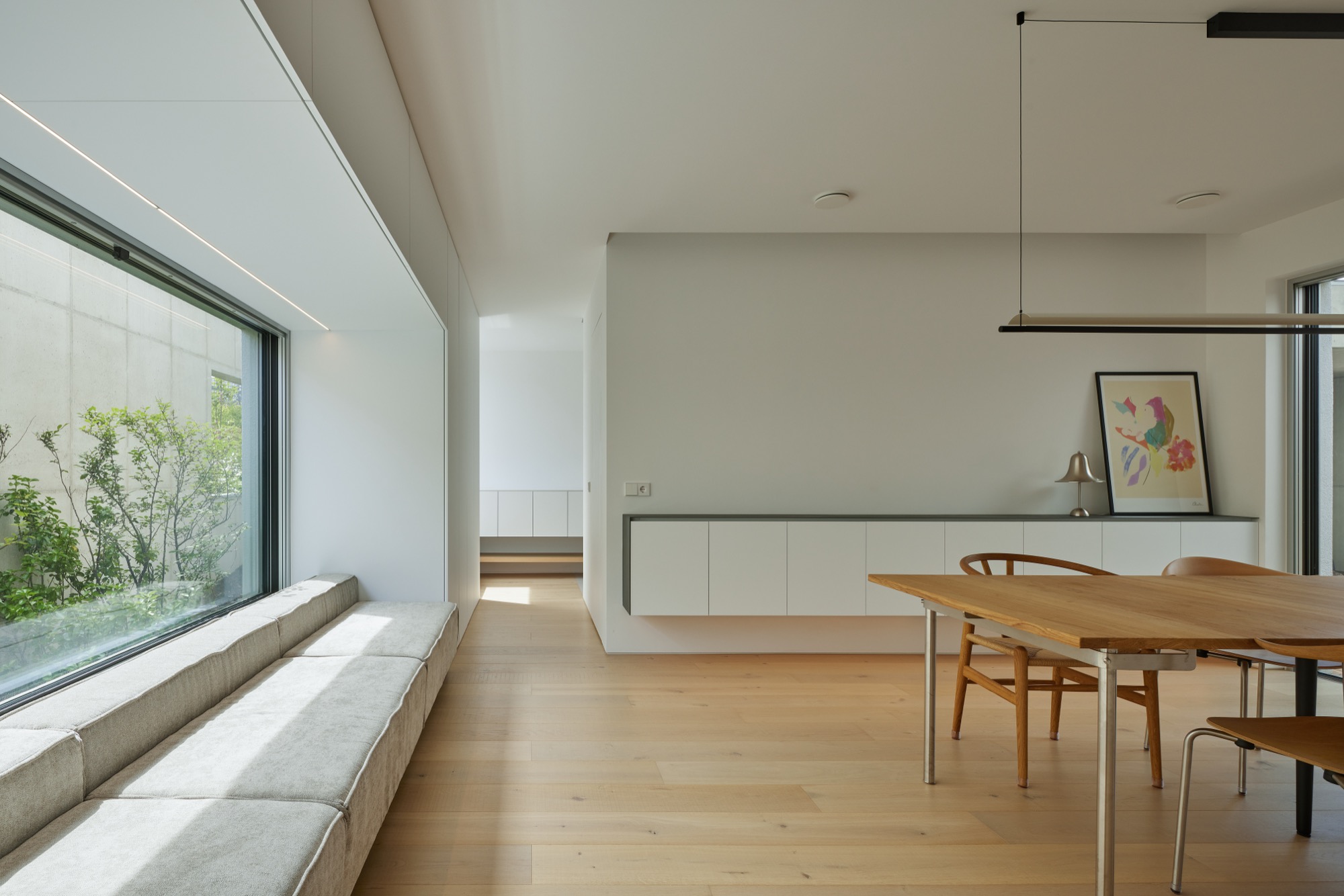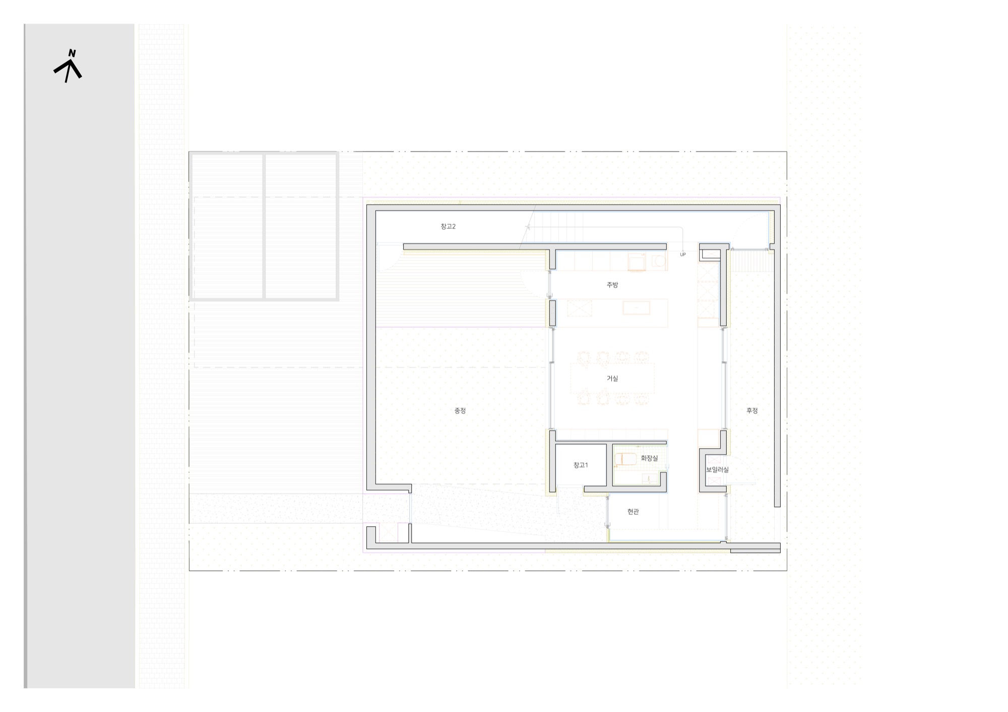 1층의 외부에는 중정과 후정이 있고, 실내에는 주방과 다이닝, 공용화장실이 있다. 건축주는 깔끔한 인테리어를 원했고, 그에 맞춰 최대한 눈에 거슬리는 것들이 없도록 했다. 조명, 에어컨도 돌출되지 않도록 astro사의 프레임리스 매입 등과 발목 등을 사용했고, 에어컨은 쇼파 위 상부장 속에 숨겼다. 여닫을 때 불편함을 없애기 위해 상부장의 도어를 살짝 누르면 자동으로 열리고, 또 자동으로 닫히는 버튼을 두어 편안하고 깔끔한 인테리어를 완성했다.