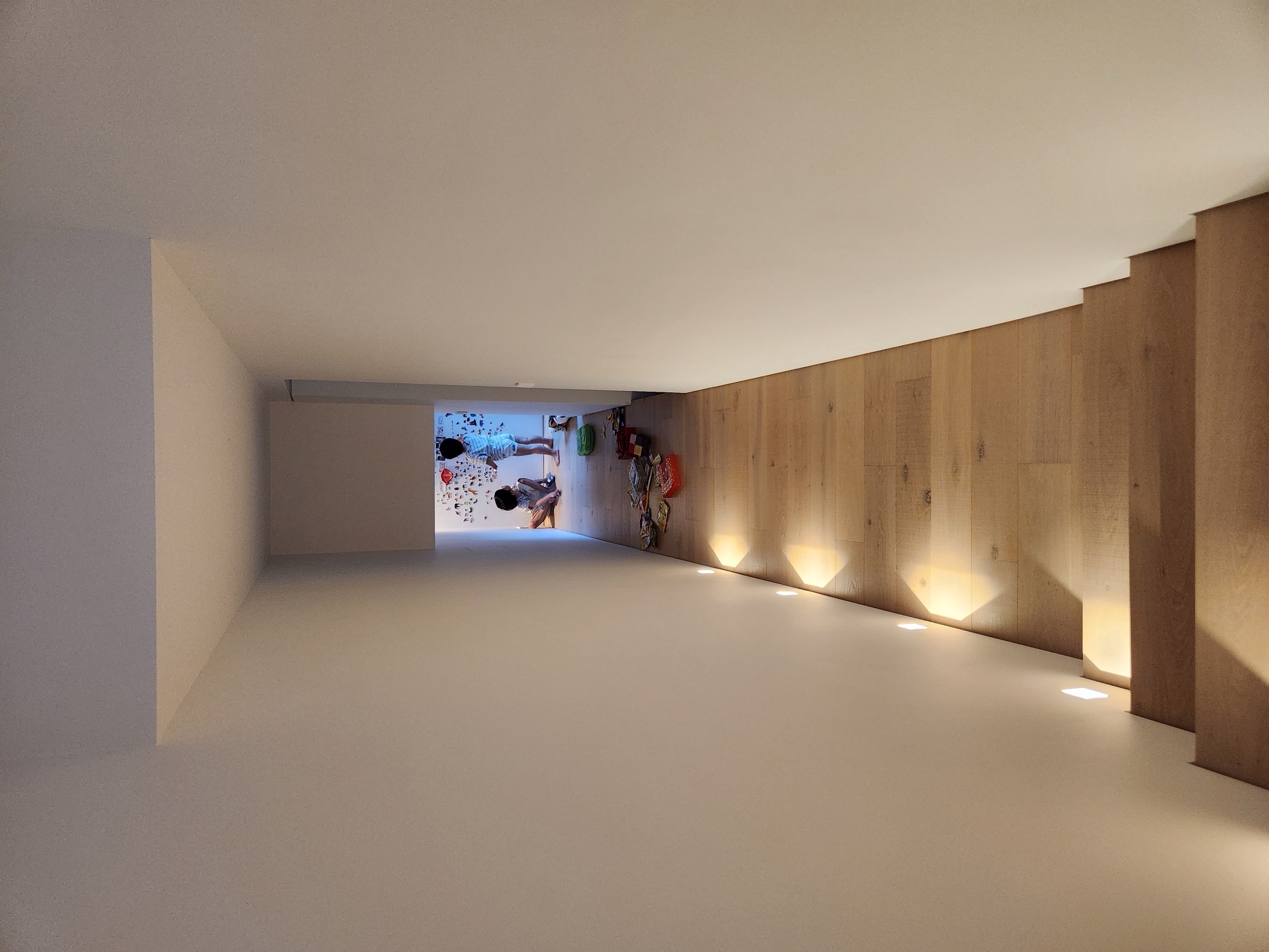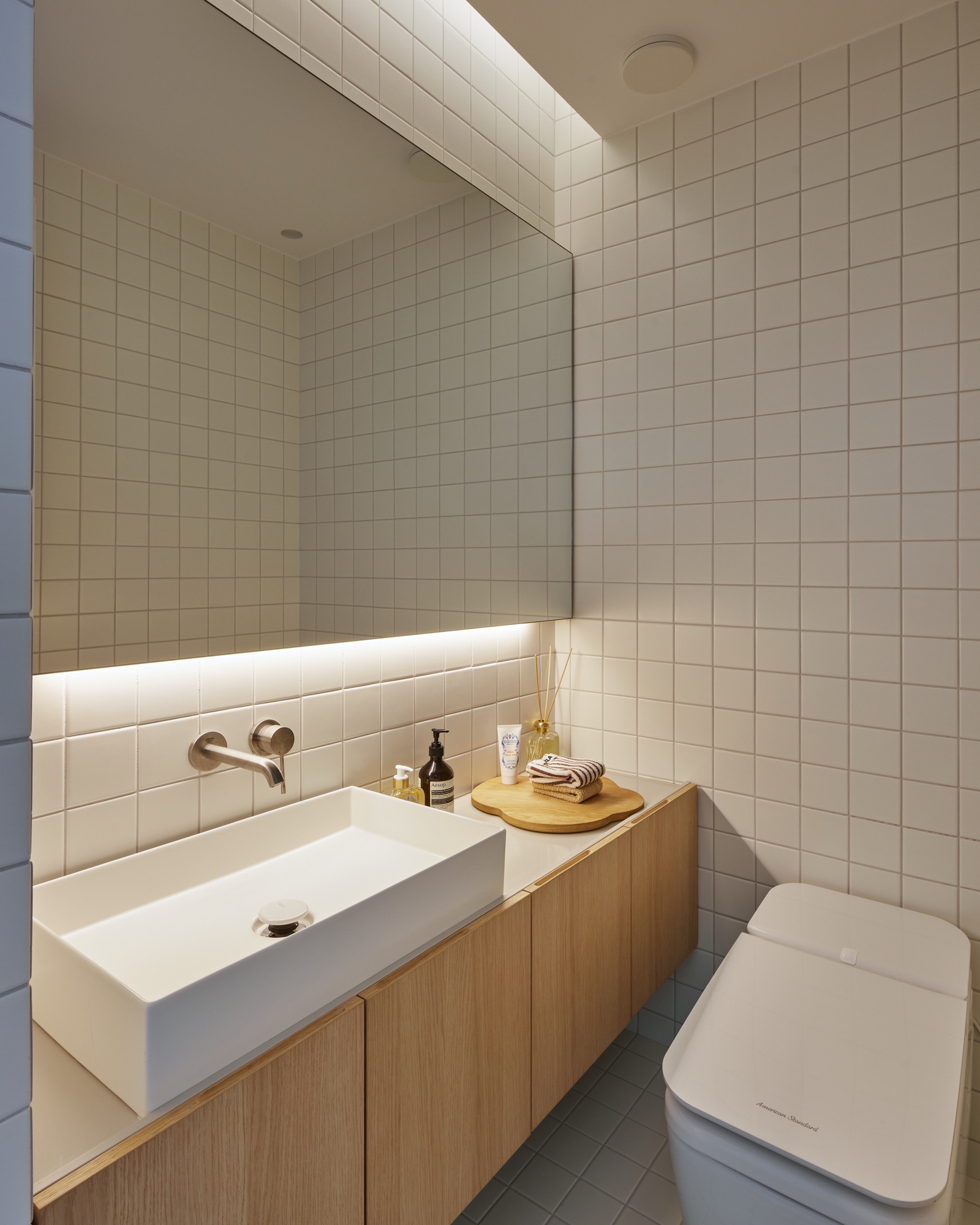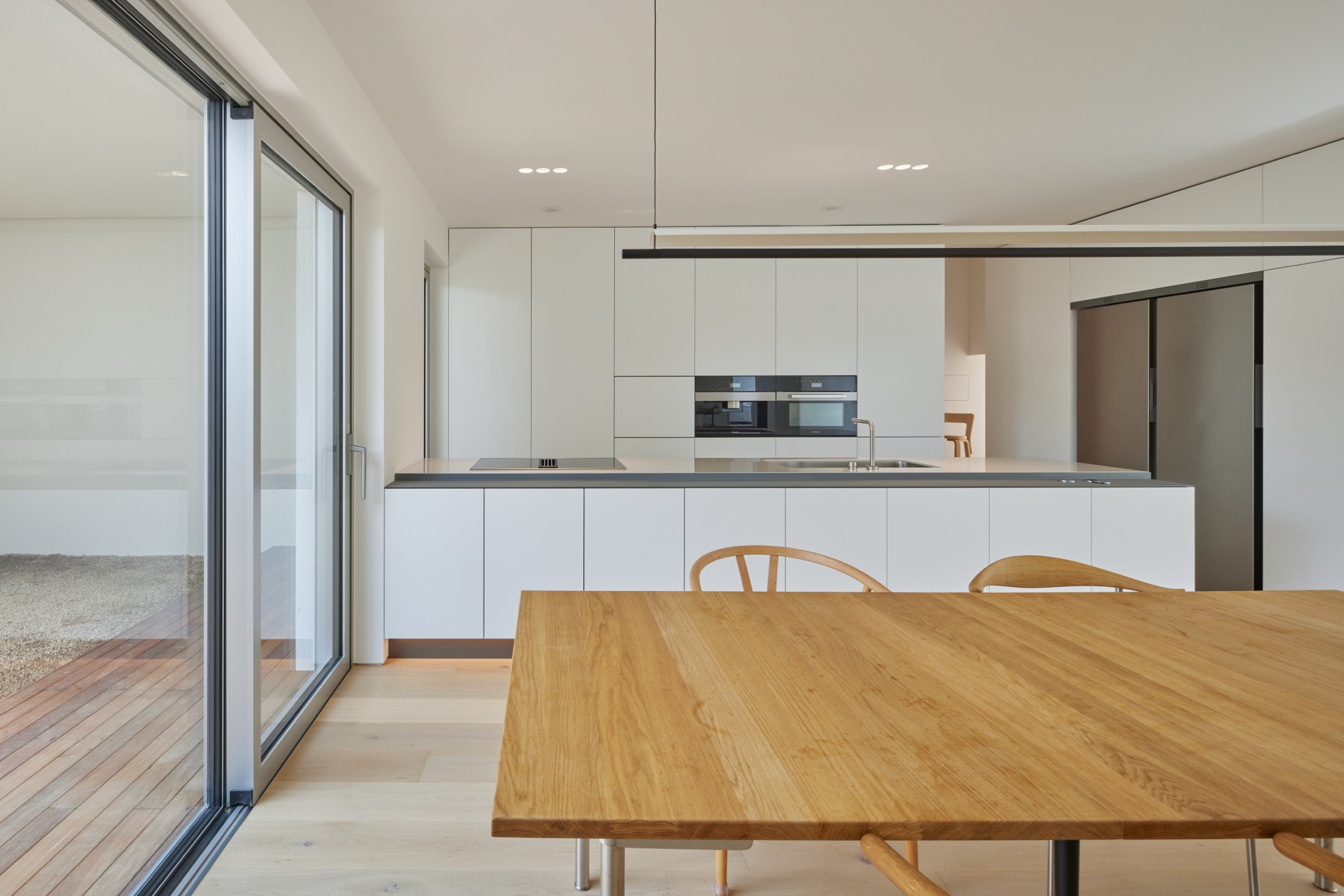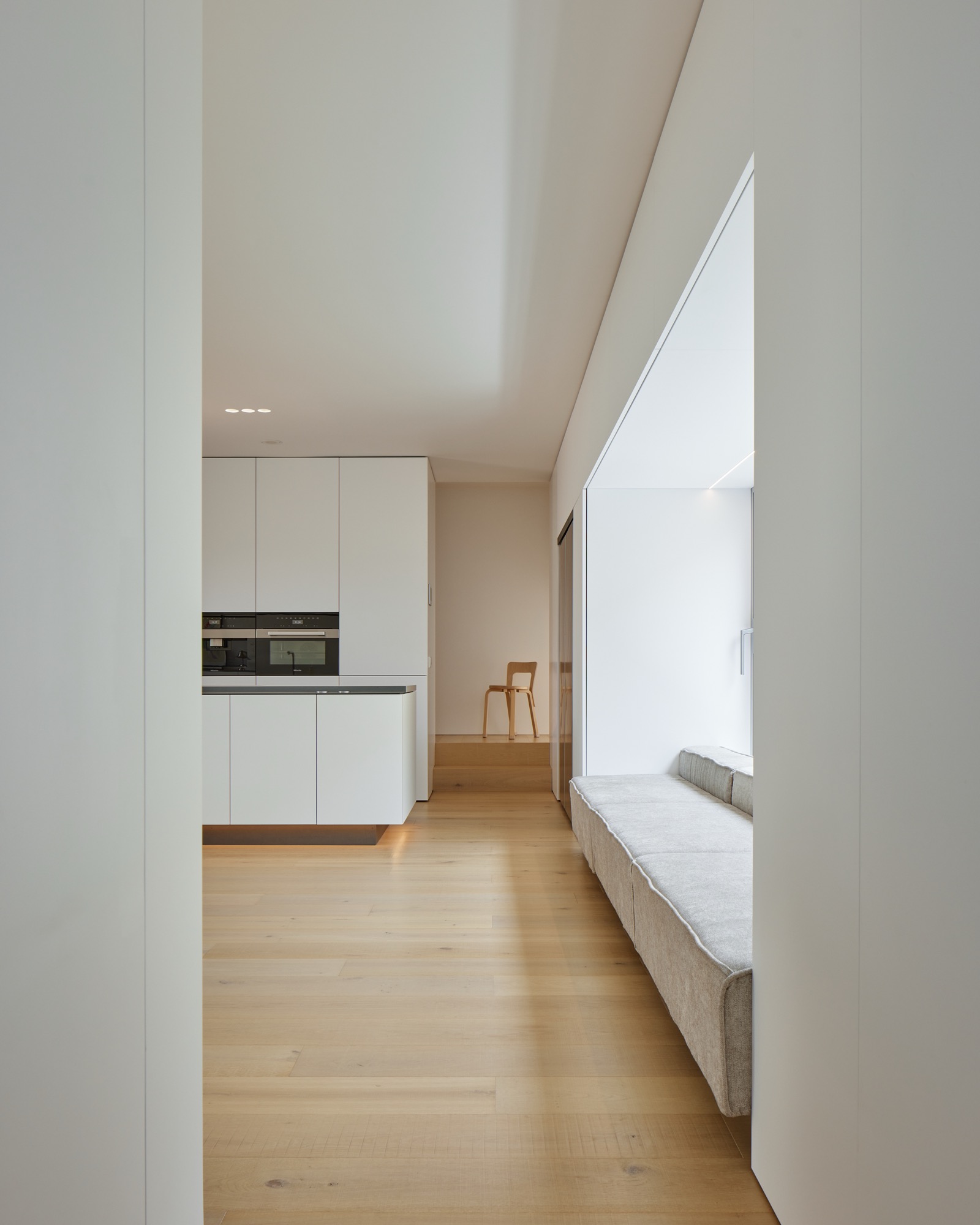 1층의 외부에는 중정과 후정이 있고, 실내에는 주방과 다이닝, 공용화장실이 있다. 건축주는 깔끔한 인테리어를 원했고, 그에 맞춰 최대한 눈에 거슬리는 것들이 없도록 했다. 조명, 에어컨도 돌출되지 않도록 astro사의 프레임리스 매입 등과 발목 등을 사용했고, 에어컨은 쇼파 위 상부장 속에 숨겼다. 여닫을 때 불편함을 없애기 위해 상부장의 도어를 살짝 누르면 자동으로 열리고, 또 자동으로 닫히는 버튼을 두어 편안하고 깔끔한 인테리어를 완성했다.