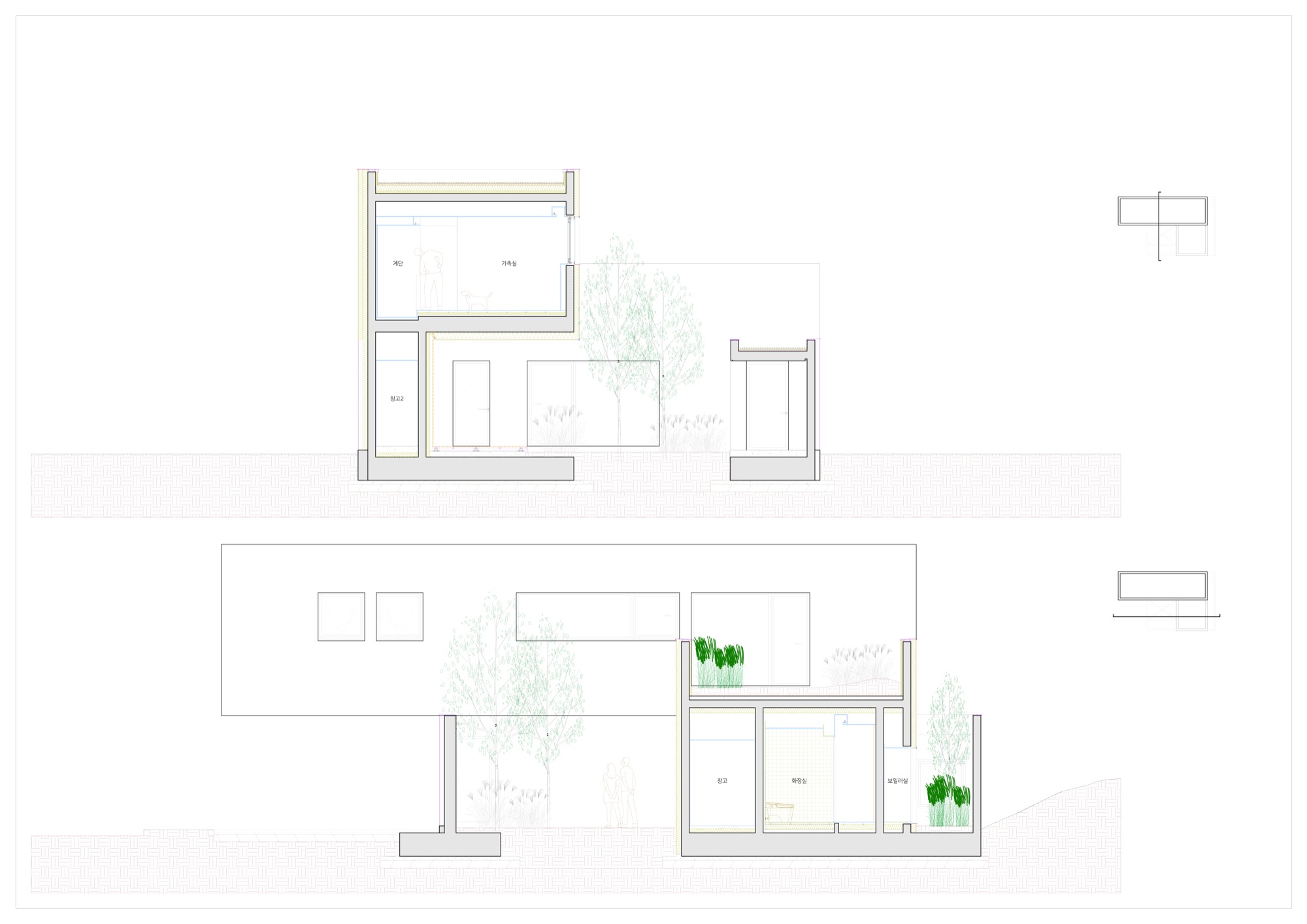 공사를 진행하며 6m 켄틸레버 때문에 구조 심의를 받아야 했다. 2층 매스를 철골 구조로도 검토했으나, 소규모 현장 특성상 1층 철근콘크리트와 2층 철골 접합부 시공 품질에 대한 우려가 있어 전체를 철근콘크리트로 계획했다. 캔틸레버를 견디기 위해 2층 슬래브에서 2층 창 하부까지 약 1.5m 높이의 역보를 계획했고, 시공자의 노력으로 완성할 수 있었다.