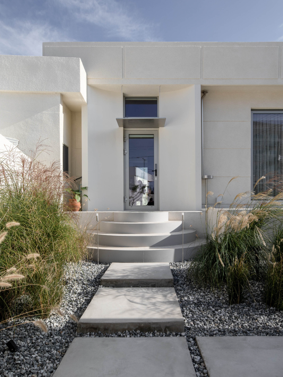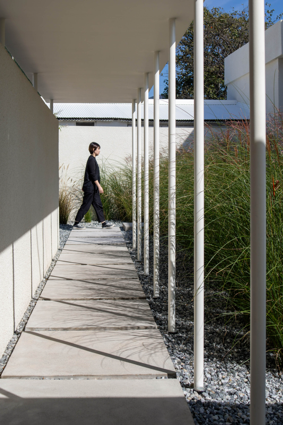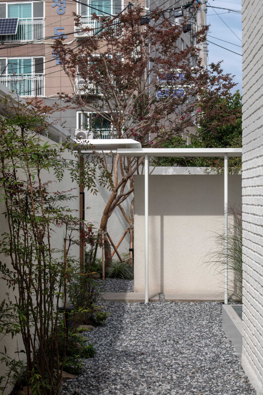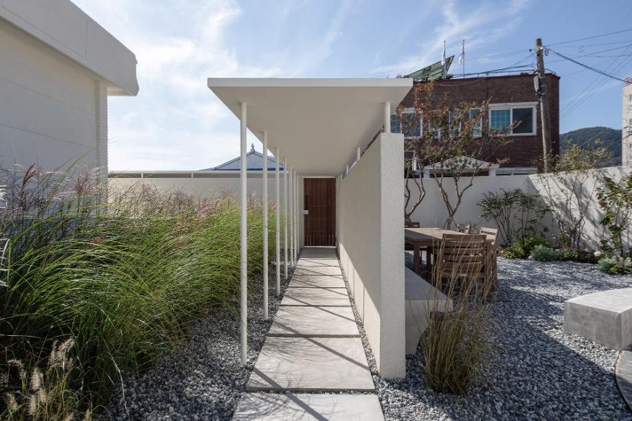 정원에 대한 건축주의 요구사항은 크게 두 가지였다. 오래된 외양간과 담장을 모두 털어낼 것, 대지 내에 2대의 주차공간을 둘 것. 대지와 도로가 길게 맞닿는 부분에 주차공간을 배치해 정원의 면적을 최대한 확보했다. 주차공간과 함께 정원으로 들어가는 주 출입구를 배치하고 큰 정원을 두 공간으로 나누는 벽과 기둥을 세워 진입로를 만들었다. 넓은 정원을 한눈에 보여주지 않고, 진입로와 여유를 즐길 수 있는 메인 정원의 공간을 분리했다. 진입로 벽을 따라 지붕을 지지하는 기둥을 열주 형태로 세워 기둥의 그림자가 시간에 따라 다르게 벽에 맺히도록 했다. 집에 걸어 들어가는 첫인상은 이 기둥의 움직임과 갈대의 움직임과 함께한다. 시간의 변화에 따라 계절에 따라 다르게 보일 인상이다.