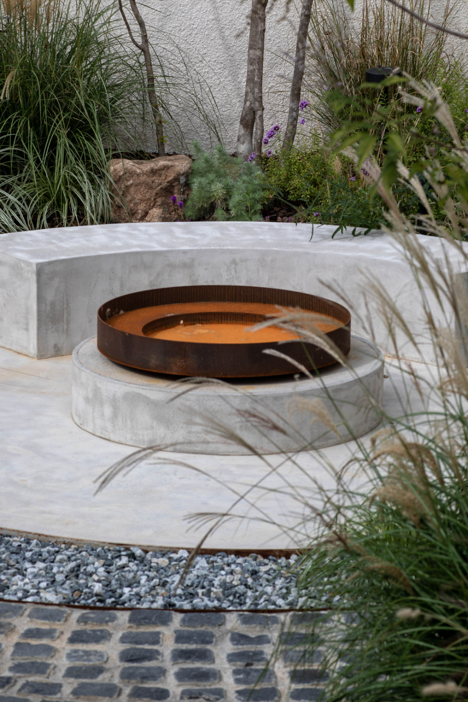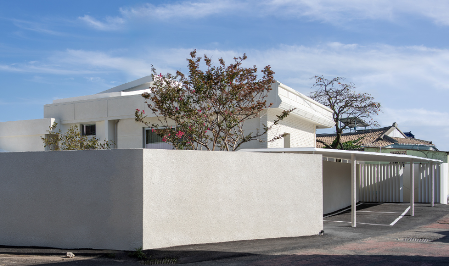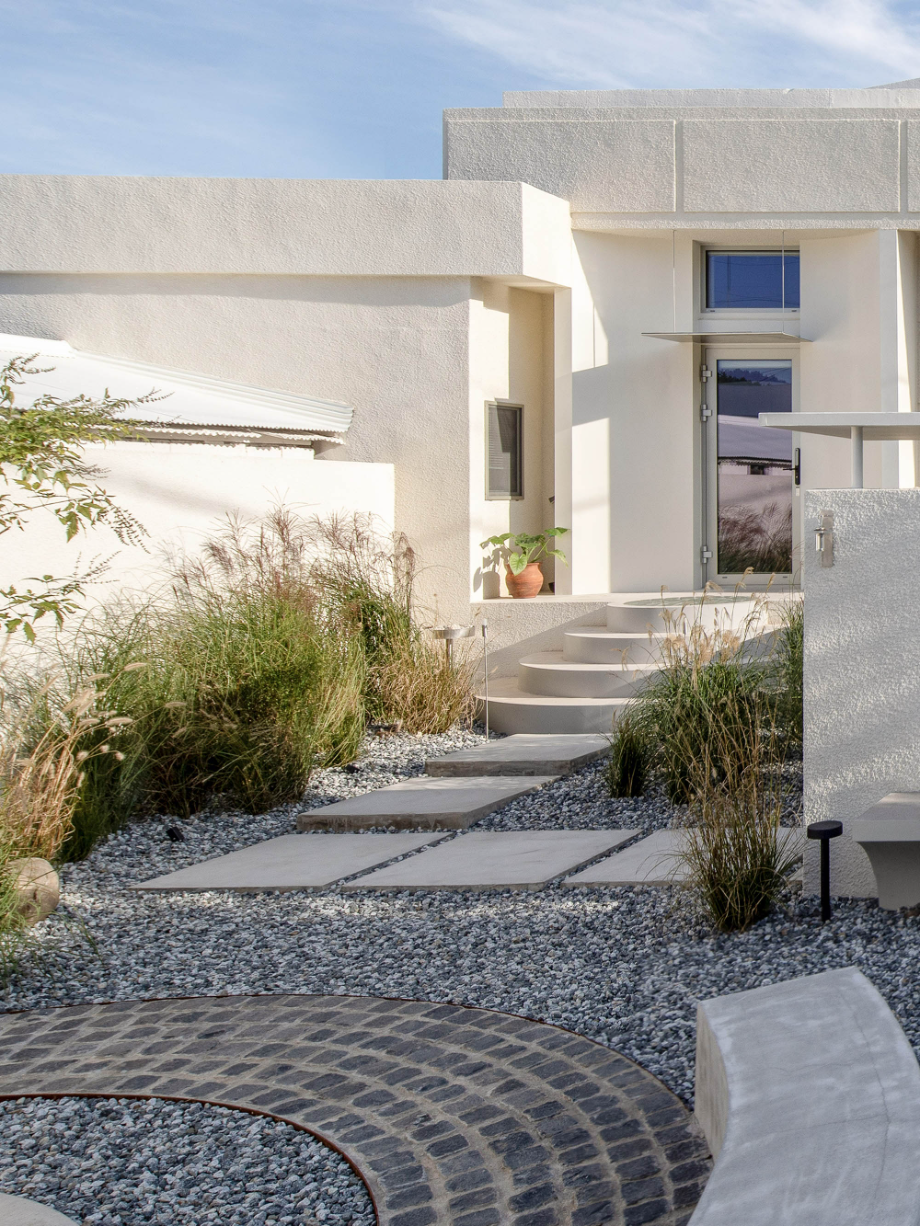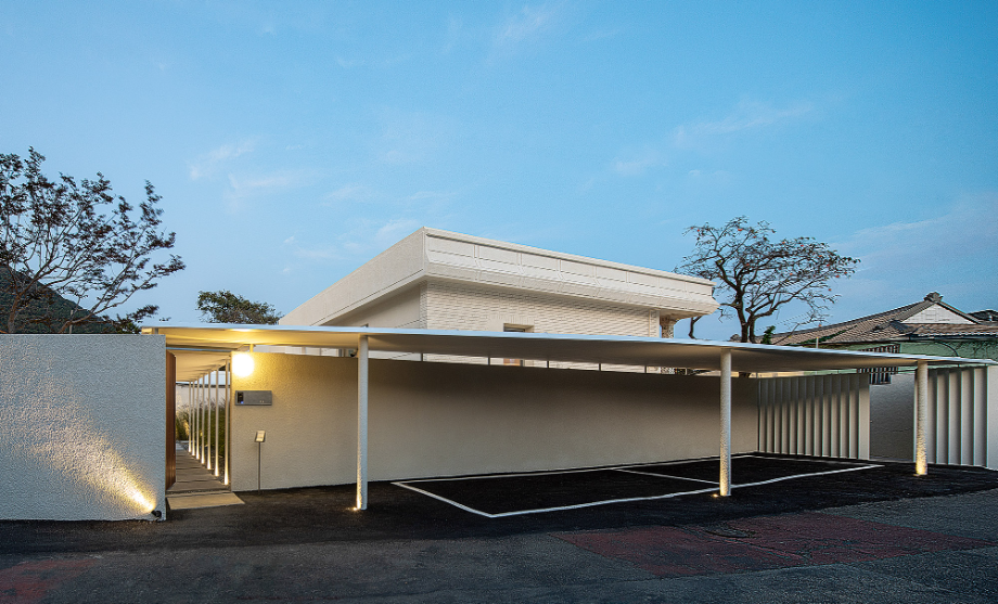 정원에 대한 건축주의 요구사항은 크게 두 가지였다. 오래된 외양간과 담장을 모두 털어낼 것, 대지 내에 2대의 주차공간을 둘 것. 대지와 도로가 길게 맞닿는 부분에 주차공간을 배치해 정원의 면적을 최대한 확보했다. 주차공간과 함께 정원으로 들어가는 주 출입구를 배치하고 큰 정원을 두 공간으로 나누는 벽과 기둥을 세워 진입로를 만들었다. 넓은 정원을 한눈에 보여주지 않고, 진입로와 여유를 즐길 수 있는 메인 정원의 공간을 분리했다. 진입로 벽을 따라 지붕을 지지하는 기둥을 열주 형태로 세워 기둥의 그림자가 시간에 따라 다르게 벽에 맺히도록 했다. 집에 걸어 들어가는 첫인상은 이 기둥의 움직임과 갈대의 움직임과 함께한다. 시간의 변화에 따라 계절에 따라 다르게 보일 인상이다.