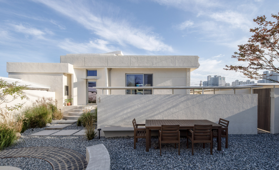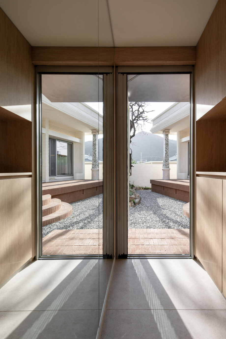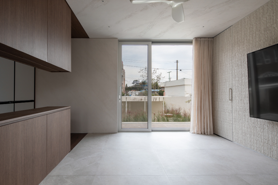 우리는 이 공간에서 느낄 수 있는 시간의 변화와 흐름에 집중하고자 했다. 여행지에서는 일상에선 잠들어 있던 감각들이 깨어난다. 그리고 평소에는 인지하지 못한 ‘지금’, ‘현재’에 집중하게 된다. 마당을 훑고 지나가는 빛과 그로 인해 움직이는 그림자의 변화, 거실을 가득 채우는 이른 아침의 빛이 저녁이 되면 노을져 거실을 물들이는 시간과 계절의 변화를 느낄 수 있는 공간으로 만들고자 했다. 공간을 훑고 지나가는 시간의 흐름을 좀 더 인지하고, 자연의 변화를 느끼는 것이 이 집에서 느낄 수 있는 치유이자 여행지로 떠나고 돌아왔을 때 이 공간이 거주자에게 제공하고자 하는 감각적 치유라 생각했다.