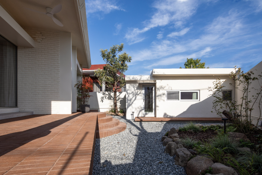부부가 생활하는 본채 공간은 남향의 작은 정원에서 드는 오전의 빛과 북향의 정원에서 드는 오후의 노을빛을 시시각각 골고루 담는 공간이다. 원래는 마당과 연결되는 창은 아니었다. 어느 부분은 출입구로 막혀 있기도, 창을 통해 정원으로 다다를 수 있는 것도 아니었다. 이들 부부의 여행은 주로 현지에 동화되는 것에 초점을 맞춘다. 현지에서 운동을 배우고, 현지 문화를 체험하는 수업을 듣기도, 동네 아무 카페에서 하루종일 책을 읽기도 하는 일상과 크게 다르지 않은 여행을 한다. 우리는 정원과 내부공간이 좀 더 자연스럽게 연결되고 이어지도록 하여 부부의 삶이 이와 다르지 않되, 좀 더 적극적으로 빛과 외부를 받아들이기를 바랬다. 여러 개의 공간으로 분리하던 벽을 모두 털고, 가족들이 자연스레 향유하는 거실과 주방 공간이 정원과 한데 어우러지길 바랬다. 이 공간에서는 그저 유유히 각자의 시간을 즐기기도, 모이기도 하는 일상이길 상상했다.