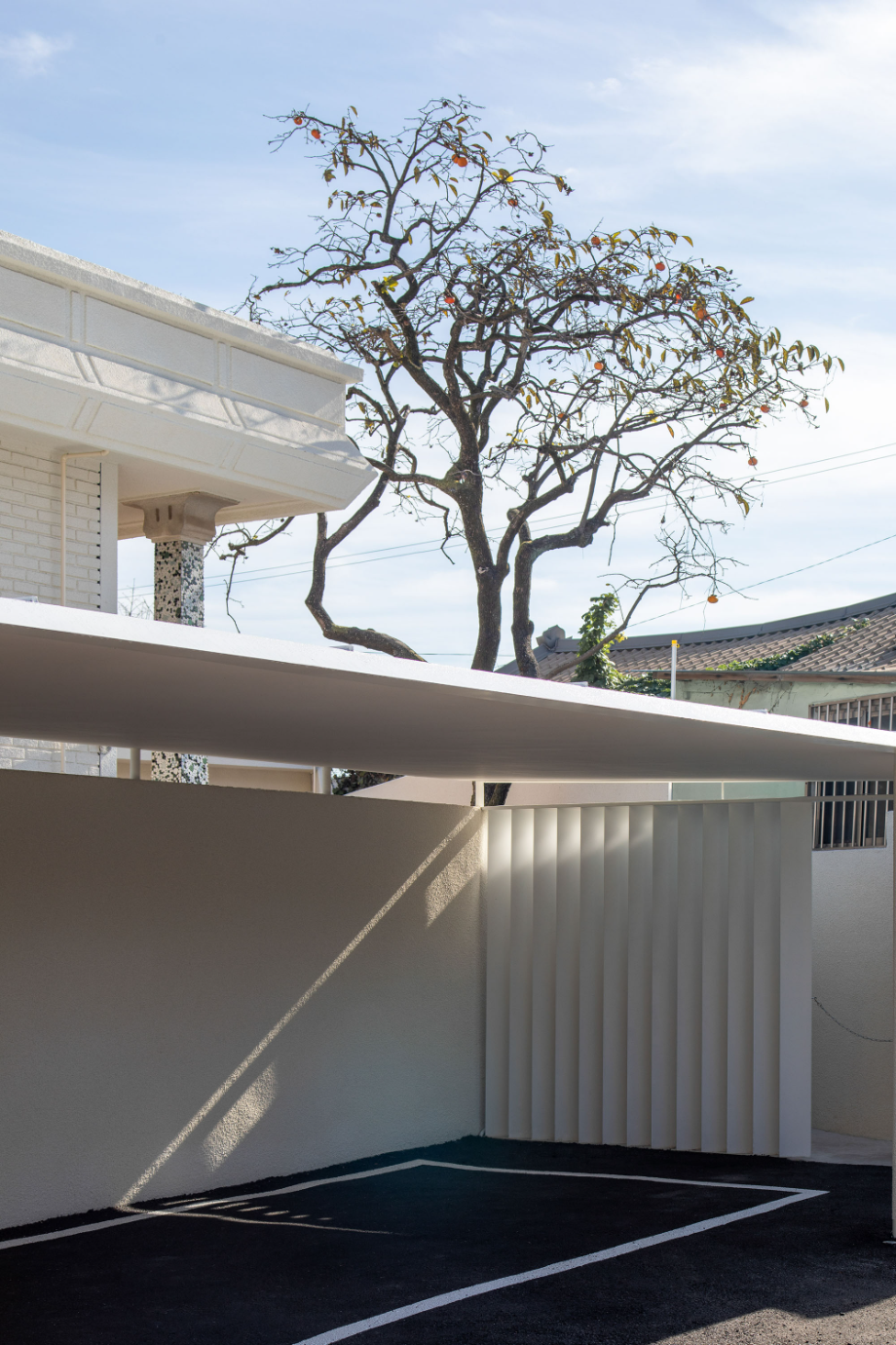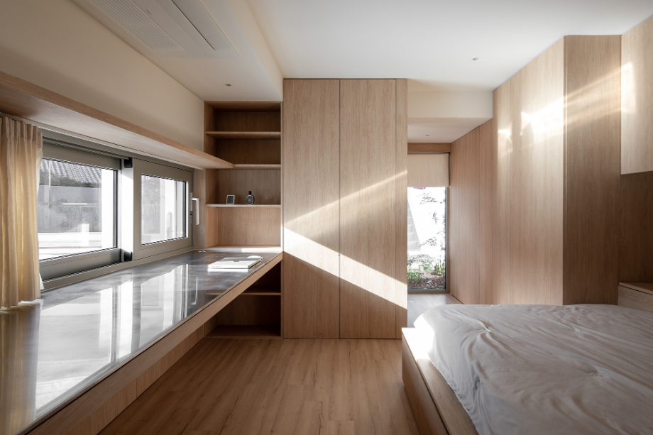 뒷 마당에 자리한 별채 공간은 부부의 딸이 독립적으로 머무르는 공간으로 계획했다. 주차장의 메인 출입구를 지나 본채와 주차공간 사이 작은 오솔길을 따라 걸으면 별채에 다다른다. 단 한 명이 사용할 이 곳에는 침실, 옷장, 책상과 욕실을 배치하되 그 이외의 생활공간(주방)은 본채에서 가족과 함께할 수 있도록 했다. 책상에서 보내는 시간이 가장 긴 거주자를 위해 마당이 보이는 가로로 긴 창을 두고, 그 앞으로 긴 책상을 두어 컴퓨터를 하기도 취미생활을 하기도 하는 공간을 구획했다.◼︎