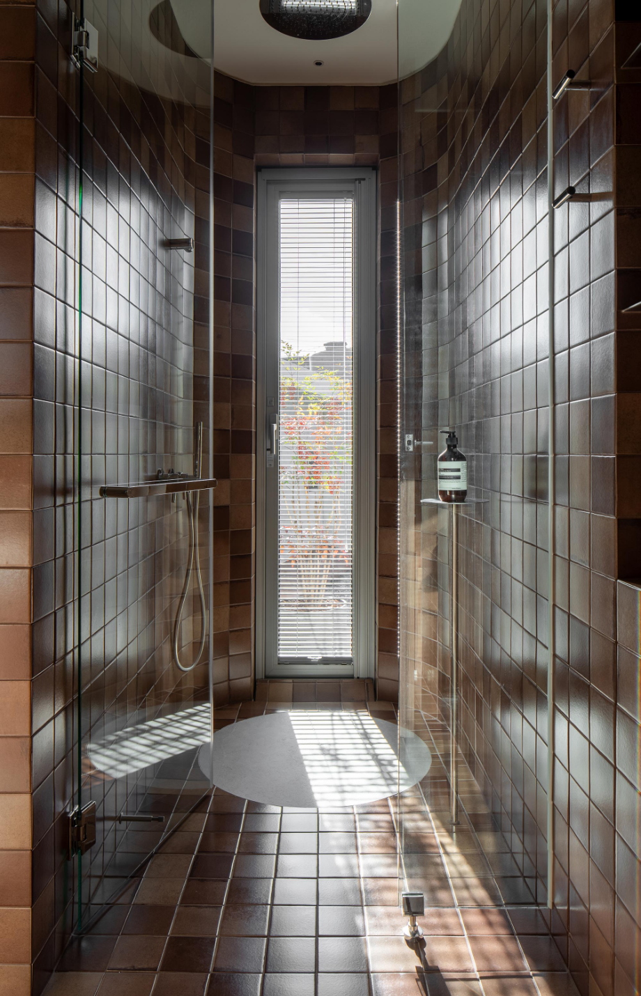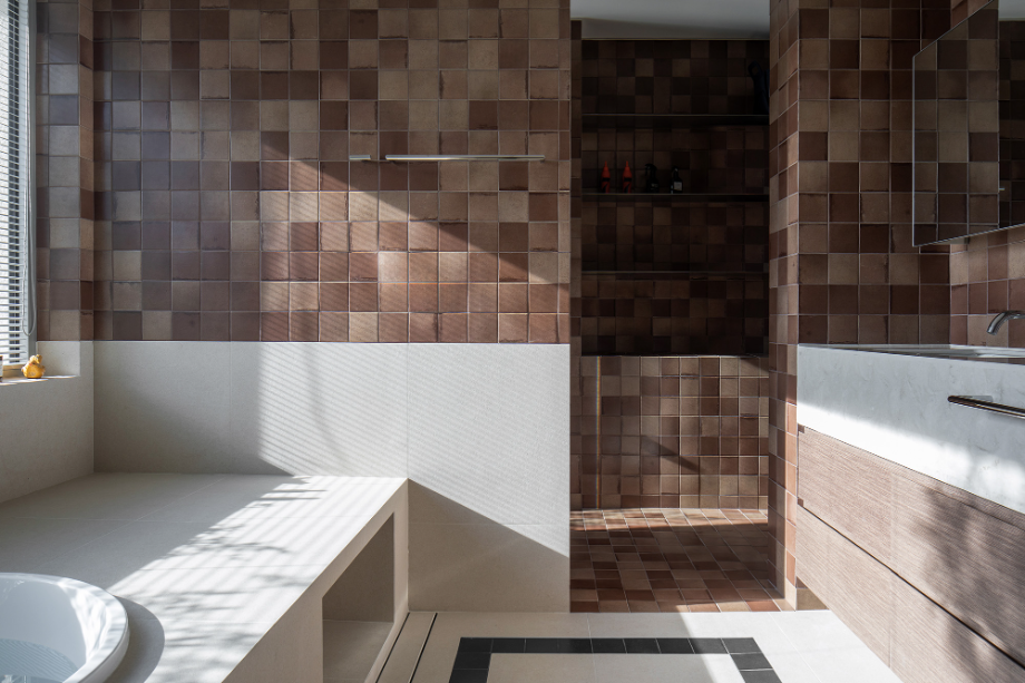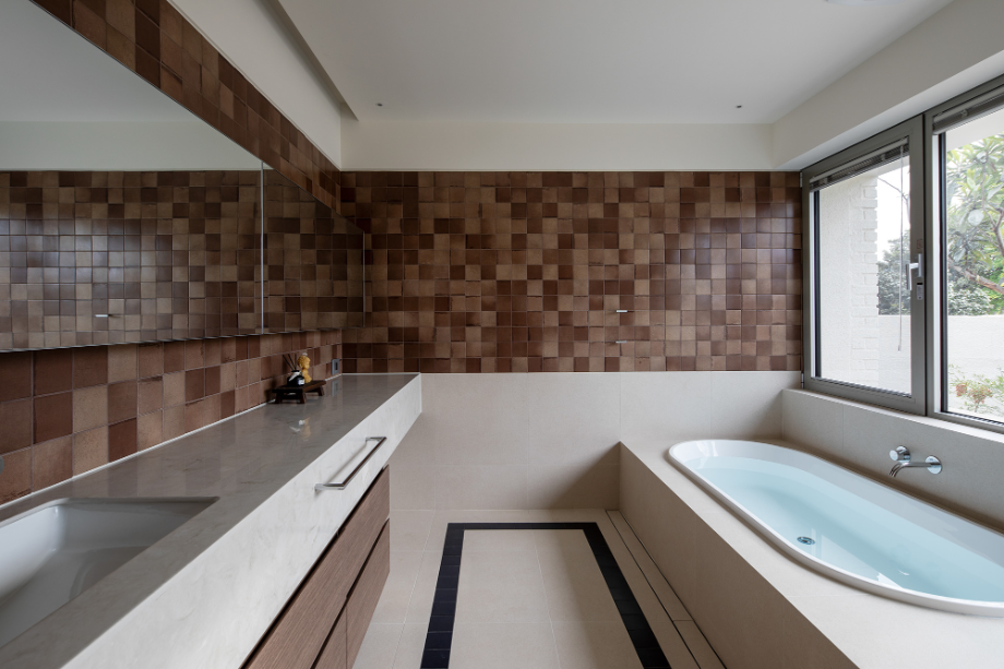 빛이 가장 잘 들지만, 마당과는 직접 연결되지 않는 곳에 외부의 빛을 충분히 들이는 욕실을 배치했다. 창 너머로 대나무 식재를 통해 빛과 시선이 걸러진다. 샤워공간은 별도로 구분하고, 넓게 열린 창 앞에 욕조 하나만을 배치하여 공간의 여유와 사치를 느낄 수 있도록 했다. 적갈색의 타일은 빛과 어우러져 이국적임을 더하면서도 식재와 자연스럽게 어우러진다.