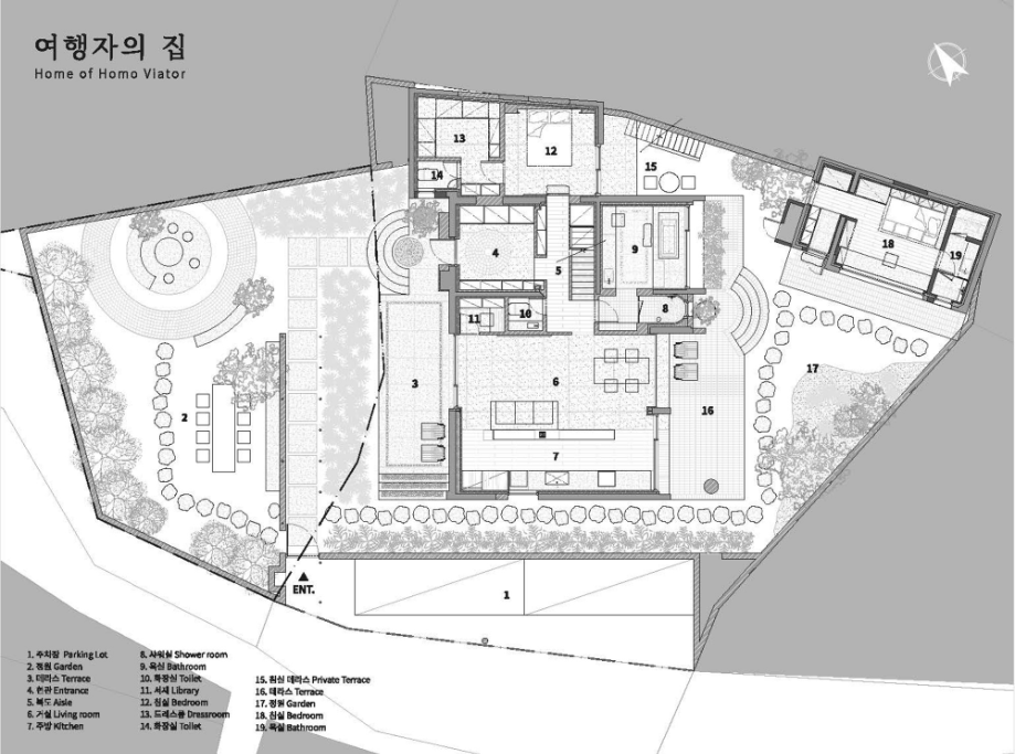 20세기 프랑스 철학자 가브리엘 오노레 마르셀(Gabriel Honore Marcel)은 인류를 ‘Homo Viator’, 즉 ‘여행하는 인간’으로 정의했다. 인간은 삶의 의미를 찾아 길을 떠나는 여행자, 스스로의 가치 있는 삶을 찾아 나서는 존재라는 것이다. 현실을 살아나가며 스스로의 삶의 의미를 돌아보는 시간은 많지 않다. 여행을 떠나며 소위 힐링의 시간을 갖는 것은 그러한 시간을 공간적, 환경적 변화를 통해 찾고자 함일 것이다. 경상남도 사천 시골 마을에 위치한 이 집은 여행을 떠나는 출발점이자 다시 돌아오게 되는 회귀의 공간이자, 삶이 흐르는 순간의 시간을 있는 그대로 담아 삶의 여유와 안정감을 줄 수 있는 부부의 근원적인 ‘돌아갈 곳’이 되길 바랐다.