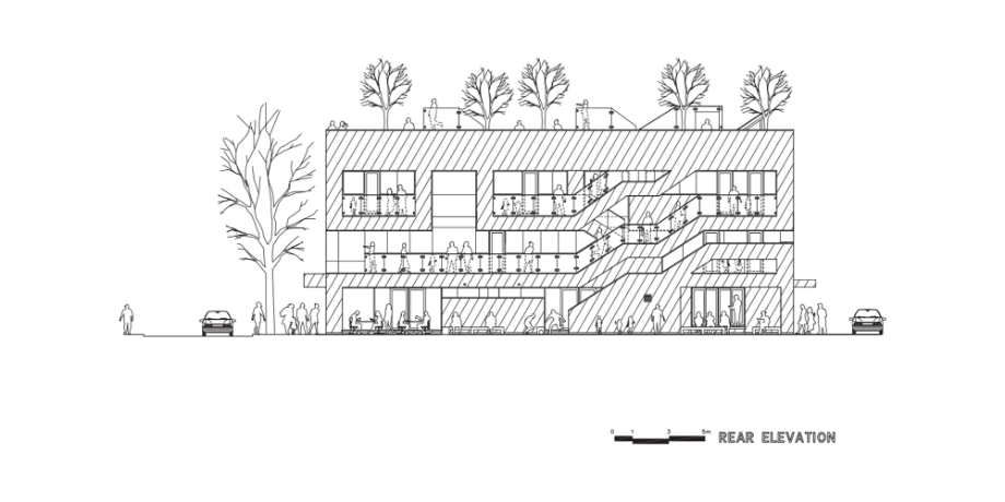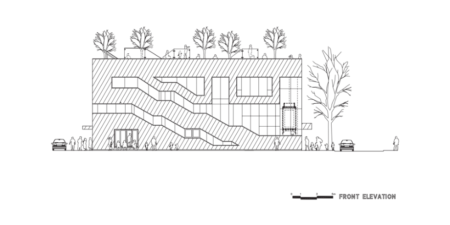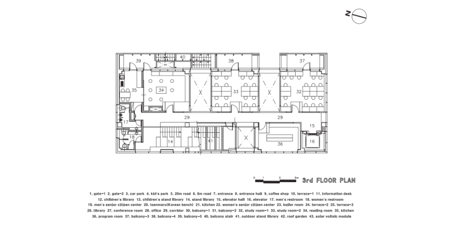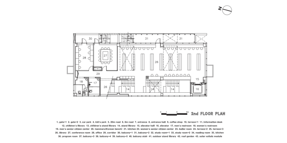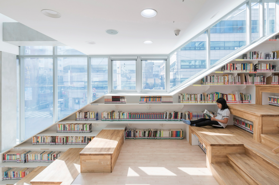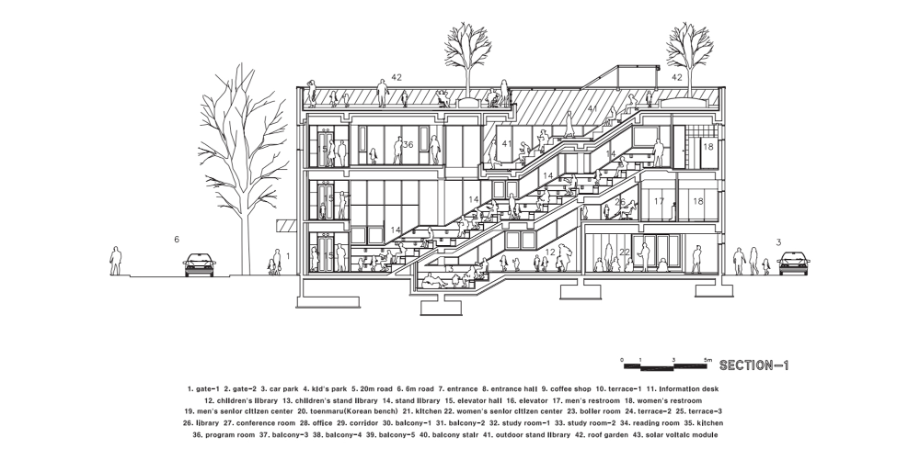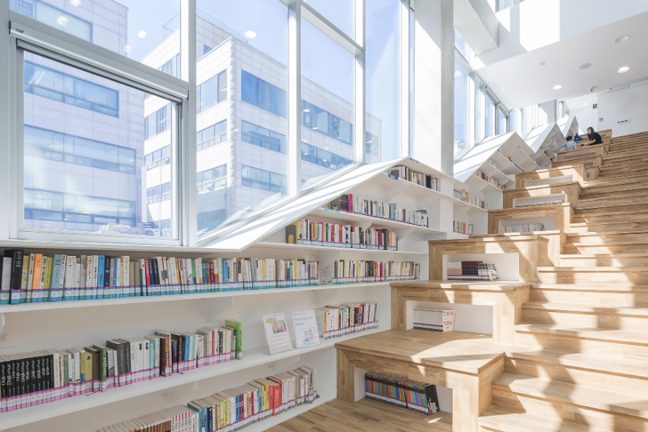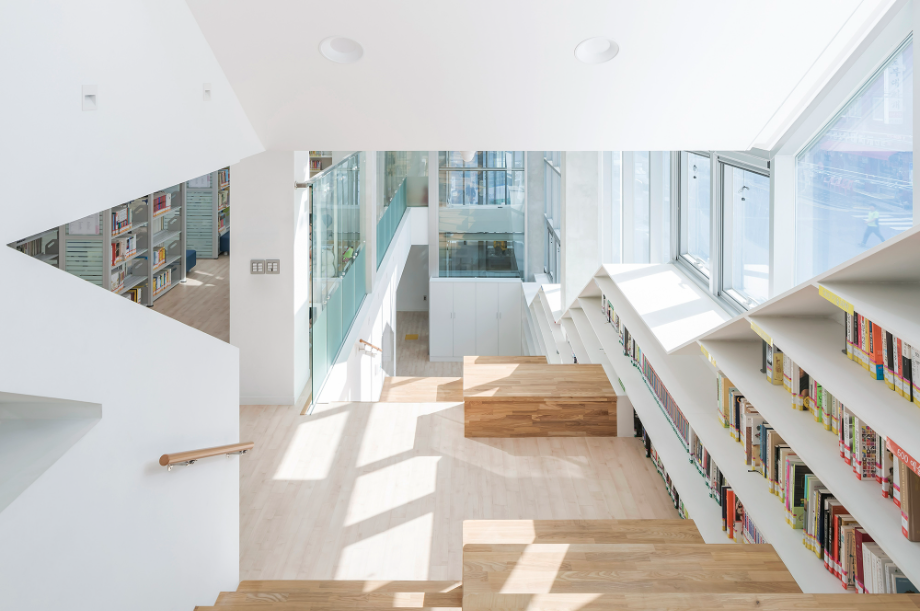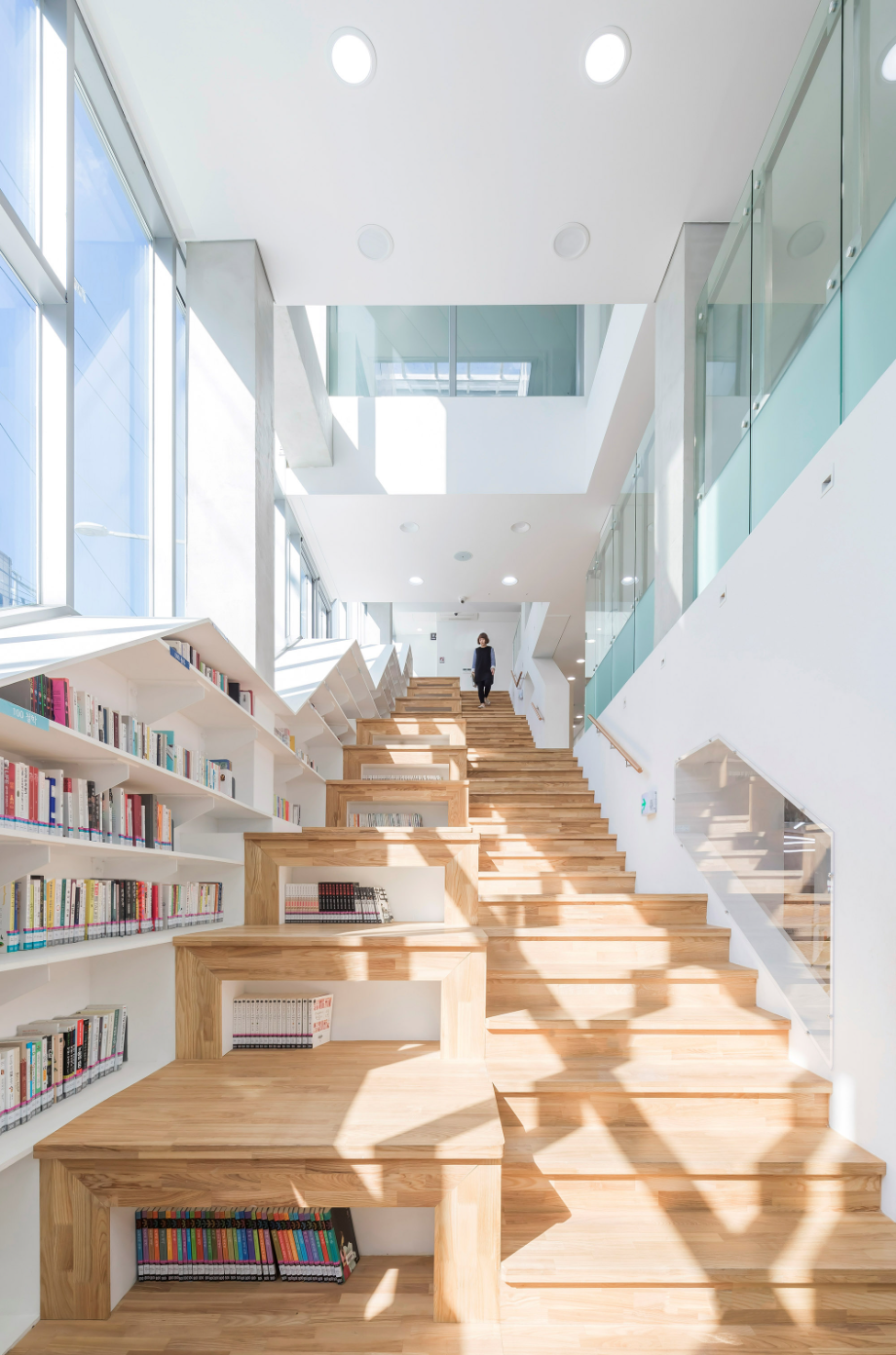 그를 위해 필연적인 수직적 이동동선인 3개층의 계단 넓이를 대폭 확대하고, 그를 이동 동선으로서의 계단을 겸한 독서계단으로 기획하여 계단의 난간과 스탠드내부를 책장화하는 동시에, 스탠드를 열람 좌석화해서 어떤 이용자도 수직 이동시에는 항상 시각적, 공간적으로 다양한 정보들을 자연스럽게 접촉할 수밖에 없도록 함으로써, 우연하고 자발적인 정보습득의 기회를 극대화하고자 했으며, 이 3개층이 연속된 거대한 지식의 계단언덕이 주민들의 화합적 만남의 장소이고, 어린이들의 학습적 놀이의 장소가 되기도 하는, 복합적 기능을 가진 주민 친교의 언덕이 될 수 있기를 기대했다.