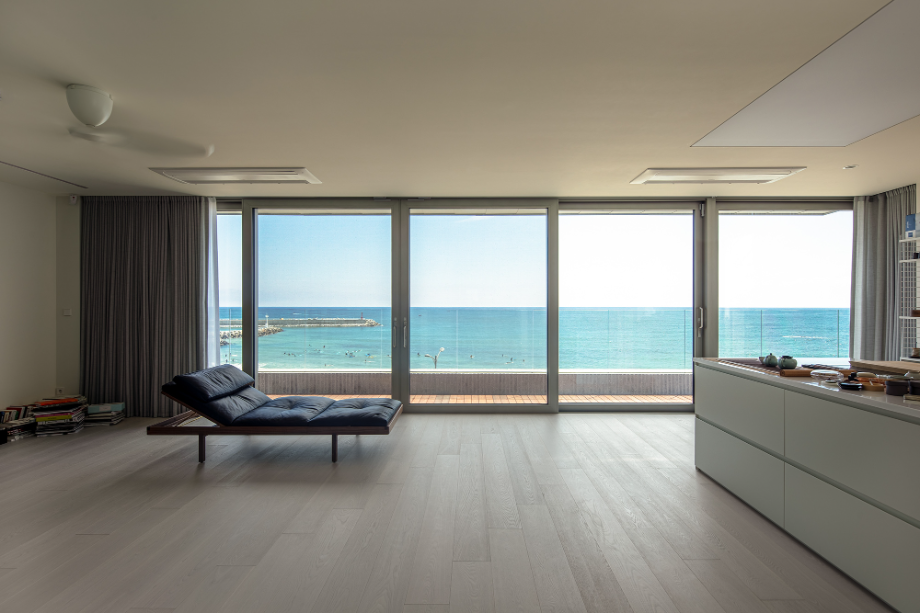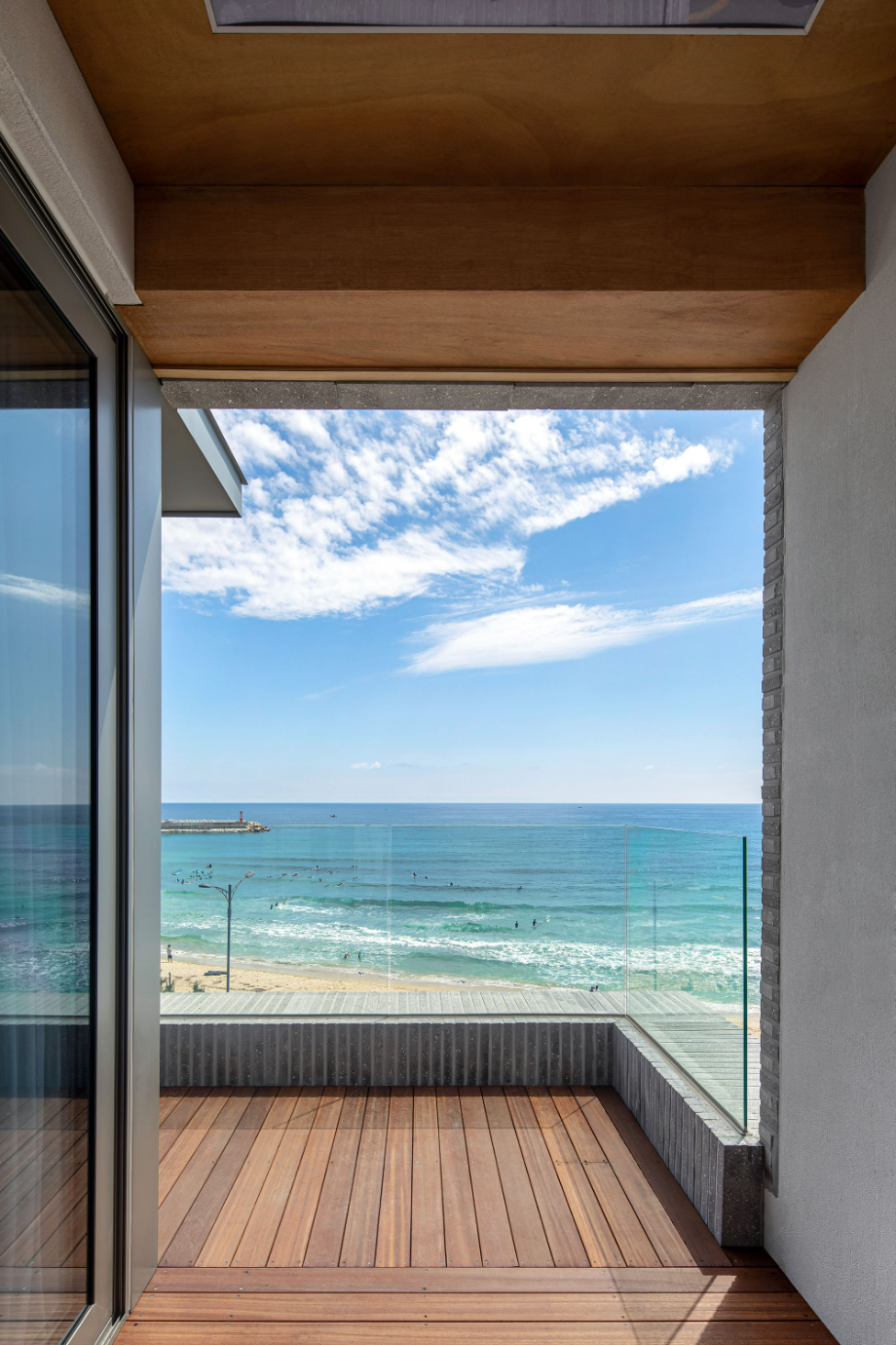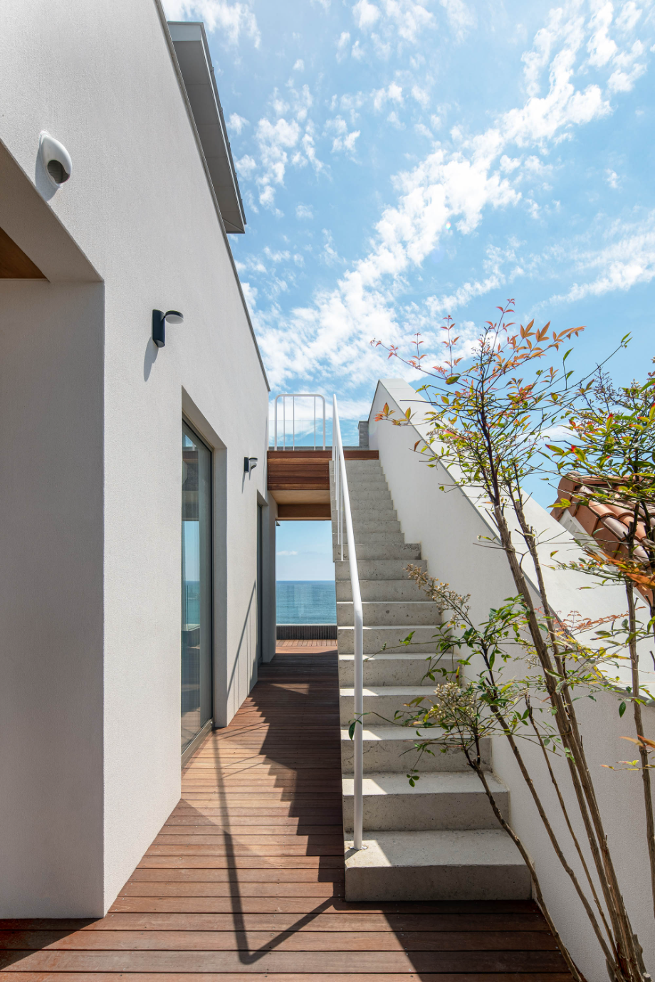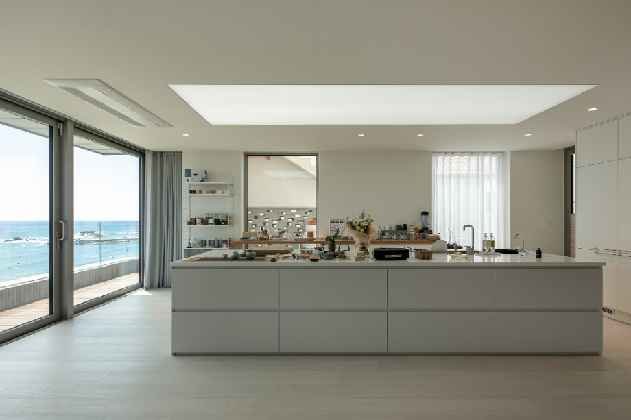 집 안팎의 공간은 원래 이 장소가 갖고 있던 풍경의 아름다움을 잘 드러나게 해주는 역할이다. 복도의 끝, 실내에서 보이는 큰 창, 발코니의 벽 프레임, 밖도 아니고 안도 아닌 계단홀...은 인구 해변의 빛과 날씨, 바람을 가장 극명하게 체감하게 한다.