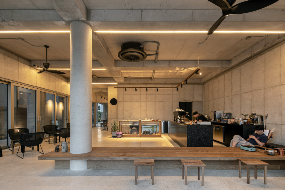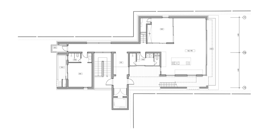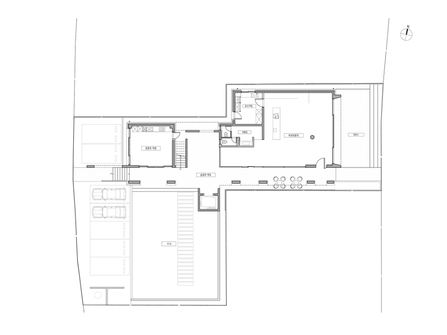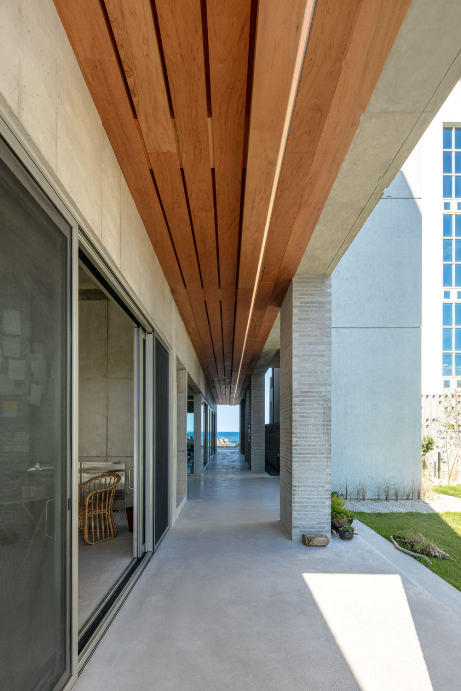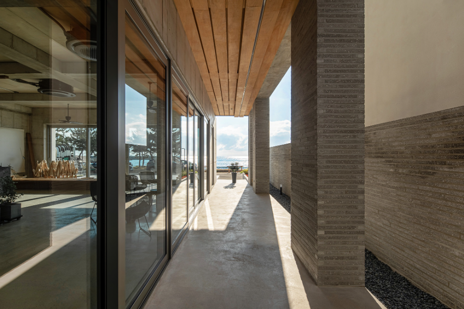 땅을 중심으로 해변 앞 도로와 이면 도로가 있었다. 집이 들어서면 두 도로를 가로지르며 오가던 동네 분들의 지름길은 사라질 것이고 해변의 풍경도 이면도로에서는 단절될 것이었다. 건물을 동서로 관통하는 40미터 길이의 1층 외부 복도는 오랜 시간 동네 사람들이 오가던 이 땅의 쓰임새를 지속하려는 건축주의 결정이었다. 외부 복도를 통해 사실상 카루나의 1층은 공공에 개방된다. 복도의 좌우엔 주차장과 정원, 공동키친과 계단홀, 커피 라운지와 접해있고 복도 곳곳엔 손님을 위한 쉴 자리가 마련되어있다.