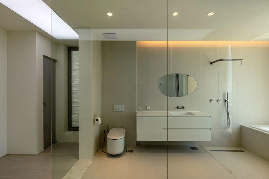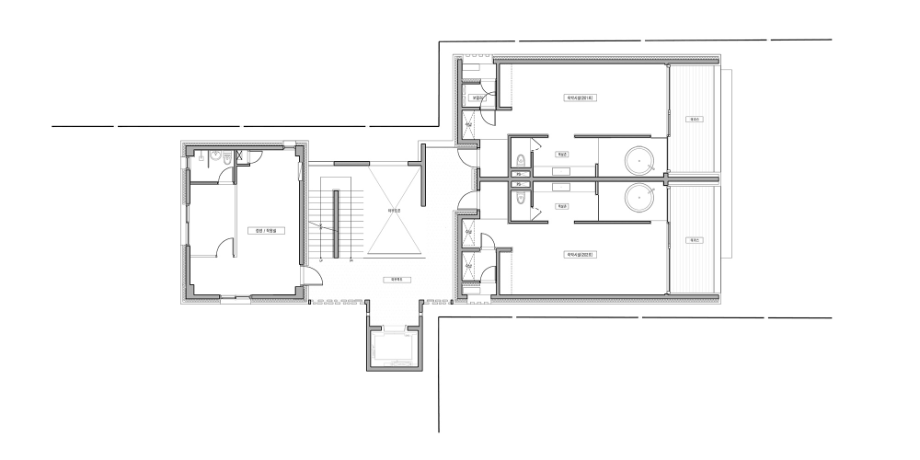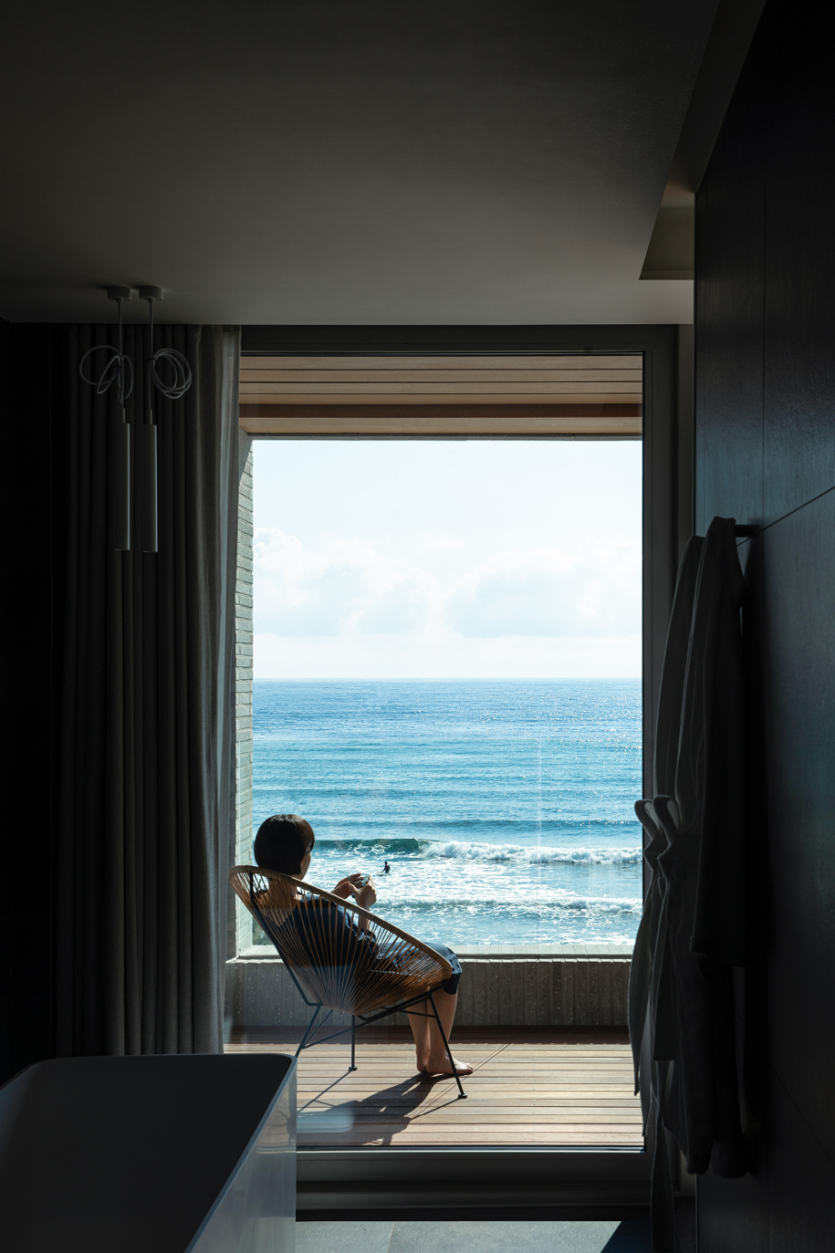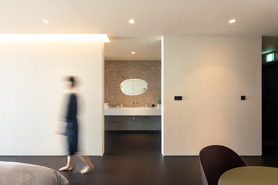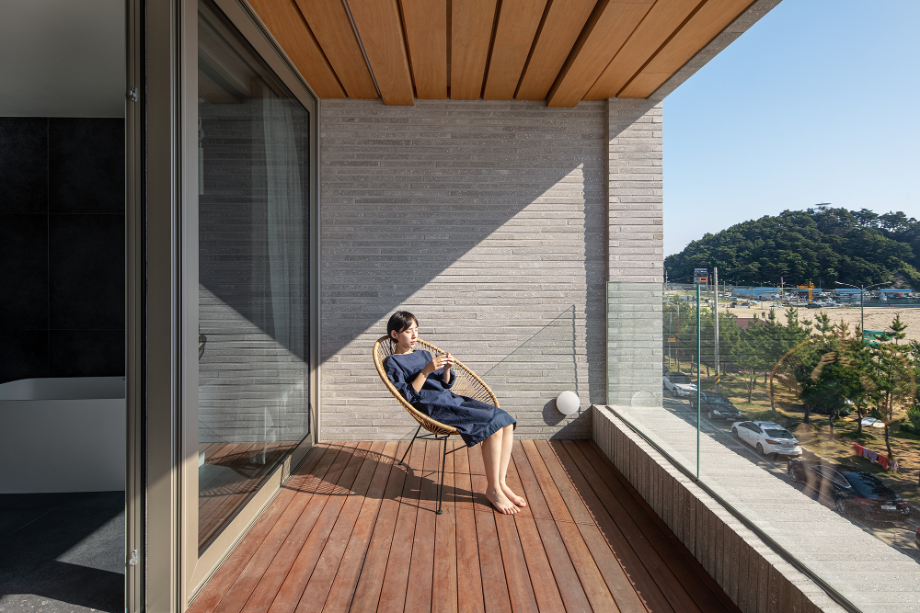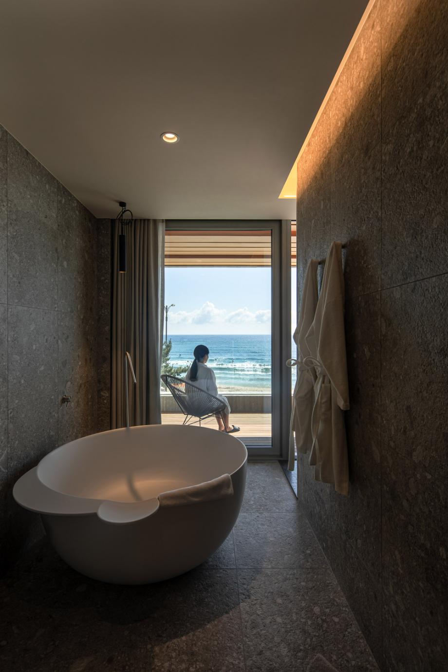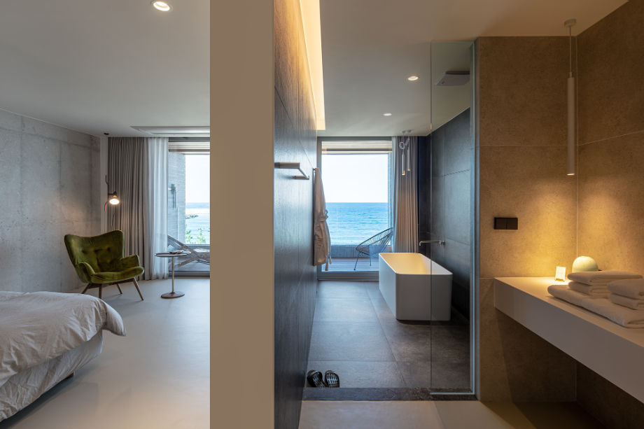 2~3층은 숙박 손님을 위한 스테이 공간이다. 객실은 최소한의 칸막이로 침실과 욕실을 구분하며 공간적으로는 하나로 연결되어 있어서 침실과 욕실에서 바다를 충분히 만끽할 수 있다.