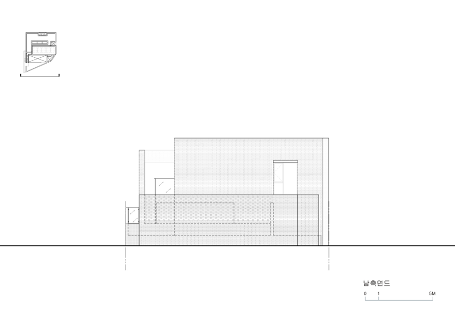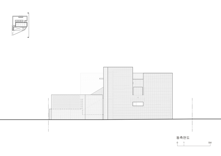 블록의 모서리에서 전면이 삼각형으로 구획된 집의 외형은 부정형의 경계를 따라 밝은 벽돌을 쌓아 올린 형태로 이곳의 장소적 특징을 드러낸다. 이와 함께 사생활 확보에 민감한 거주인을 위해 시선 차폐 역할을 하도록 들어 올려진 텃밭을 전면에 조성하고 이에 따라 높아진 경계벽의 위압감을 상쇄시키고자 다양한 위치에 'Slit'을 설치했다. 'Slit'은 높낮이가 제각각인 매스와 벽체 그리고 내부공간의 구석구석이나 건축의 세부요소들 사이에서 다양한 스케일로 등장하며 빛과 바람이 넘나드는 통로가 되고 실 환경을 제어할 수 있는 장치로서 기능한다.