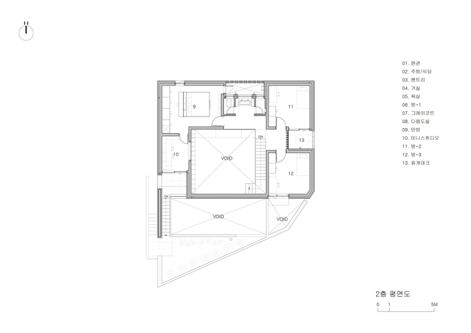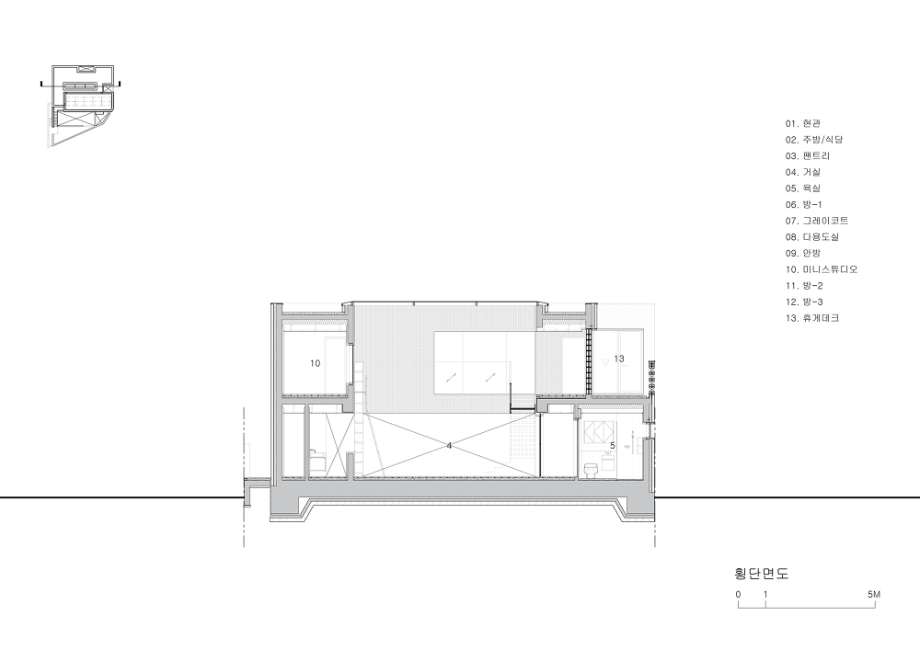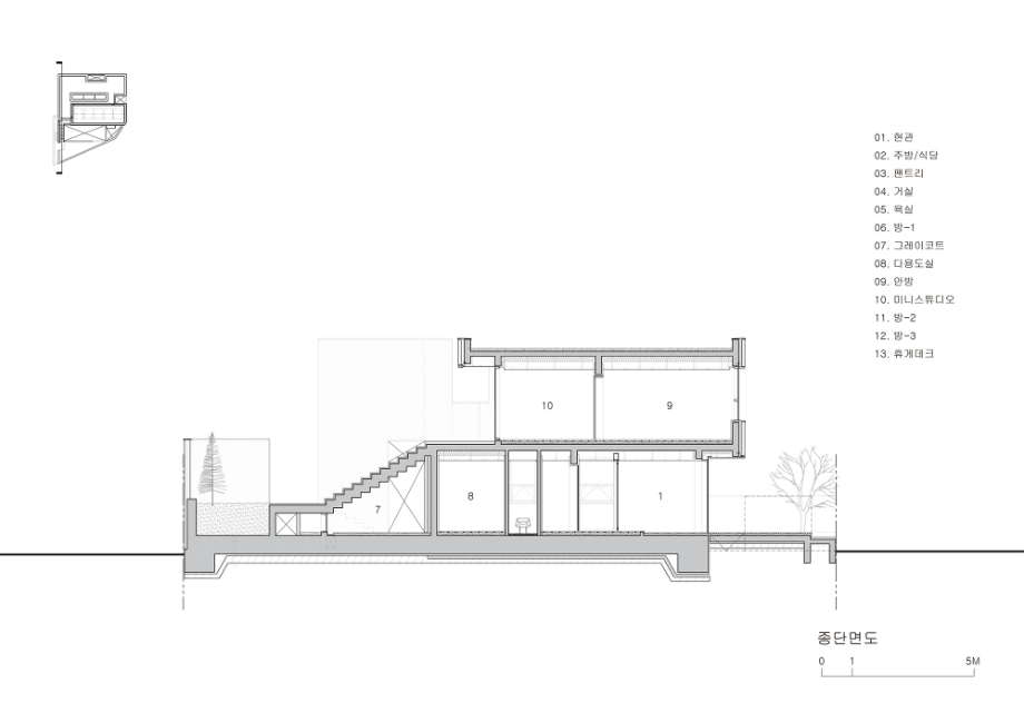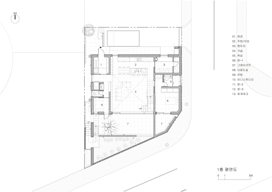 각기 다른 세 개의 성격으로 조성된 전면 옥외영역은 각각이 맞닿은 내부 실과 직접적 관계를 맺으며 거실의 연장, 텃밭, 명상적 공간으로 활용된다. 외부활동 시에도 사생활이 지켜질 수 있도록 눈높이 이상의 벽을 쌓고 'Slit'을 통해 빛과 바람이 자유롭게 드나들 수 있도록 하였으며, 내, 외부 동선이 순환하는 막힘없는 공간으로 계획했다.