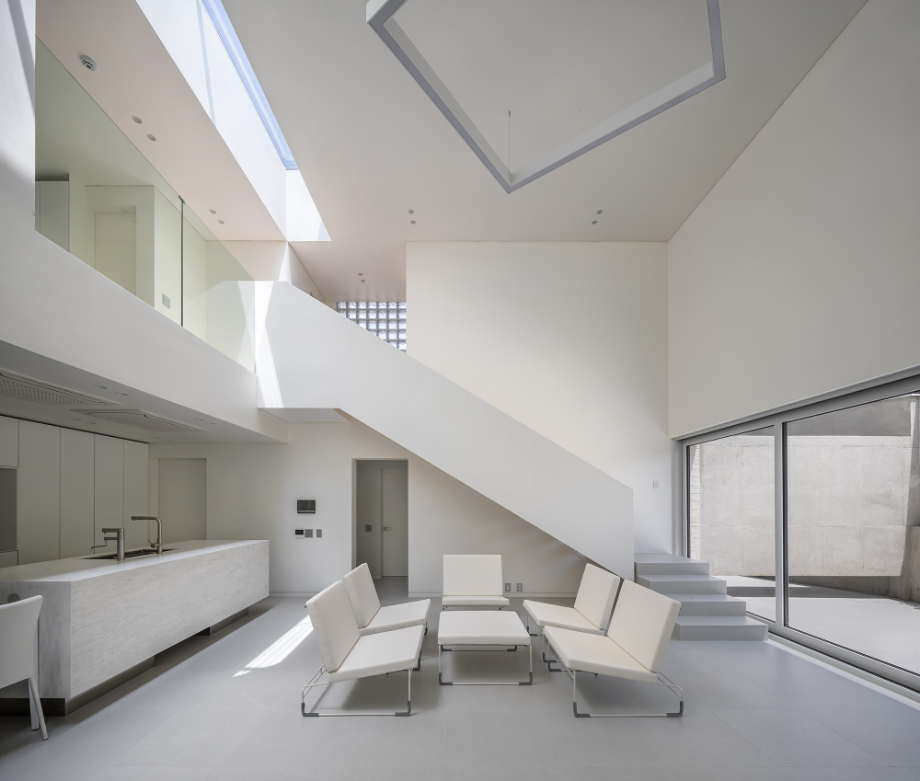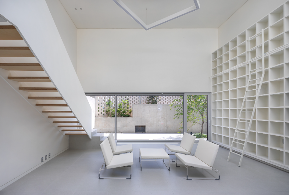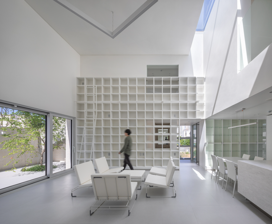 간결한 조형, 비 일상의 내재화, 스트레스 없는 집과 같은 요구조건을 기점으로 하는 이 집의 설계는 'LDK(Living, Dining, Kitchen)'로 명명되는 거실과 주방, 식사 영역을 집의 중심에 두고 진행됐다. 'LDK'는 1층의 전면마당과 측 후면의 서비스영역, 2층의 침실 공간들에 위요된 구조로 집의 전체 분위기를 이끌어 간다. 가장 넓은 체적을 점유하고 있는 이곳은 대화와 책 읽기를 선호하는 가족들의 모임 장소이며 마당과 주방, 식탁, 2층까지 시선이 닿아 아이들이 부모의 관심 안에서 마음껏 뛰거나 소리 내며 발산의 자유를 누리는 곳이다. 이를 위해 소파와 TV를 배제하고 벽면 가득 찬 서고를 제작했으며 자연광을 적극적으로 유입해 밝고 활기찬 분위기로 조성했다.