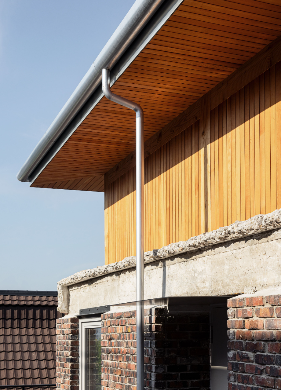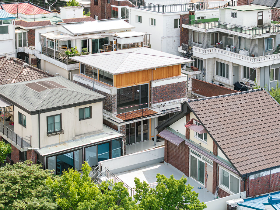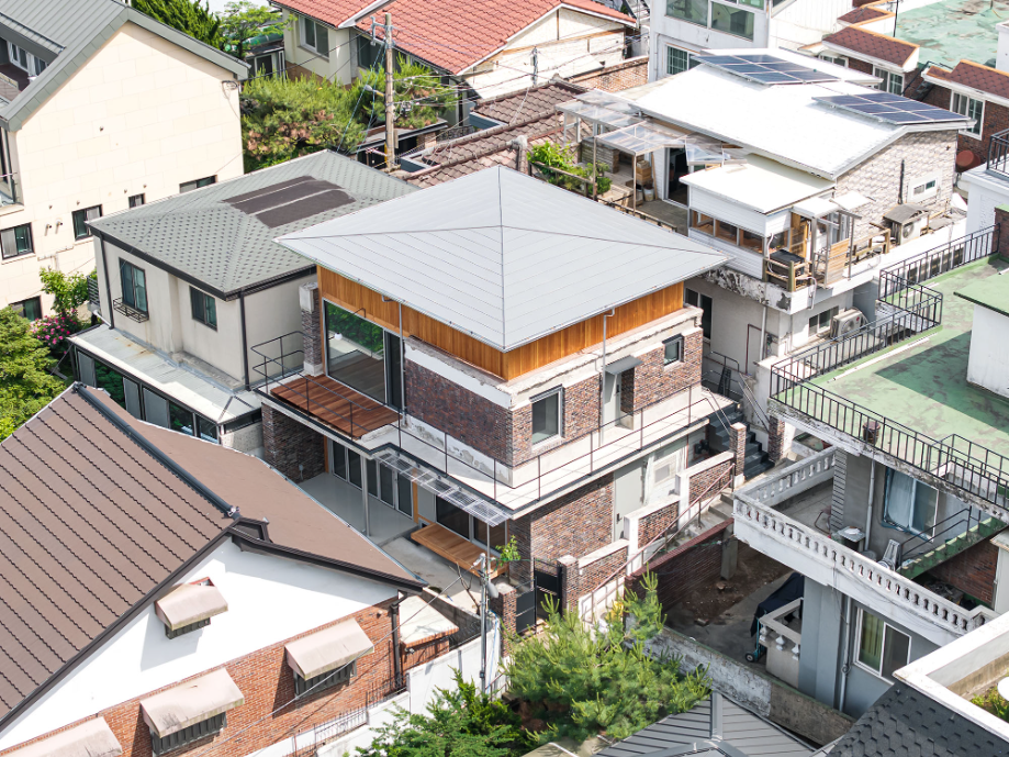 의뢰인은 이 집에서 10년 거주. 산책 중에 에이코랩 사무소의 선홈통이 마음에 들어 설계를 의뢰하였다. 지금의 골목 풍경과 옆집의 조망권이 유지되길 바랐다. 의뢰인은 뭐든 쉽게 버리는 것을 원하지 않았다. 쓰던 낡은 화장대와 옷장, 값싼 이케아 등도 다시 쓰기를 원했다. 평생을 검소하게 살며 모은 돈으로 짓는 주택 겸 작업실이다. 차는 꼭 필요한 날만 20년 넘은 아반테 투어링을 탄다.