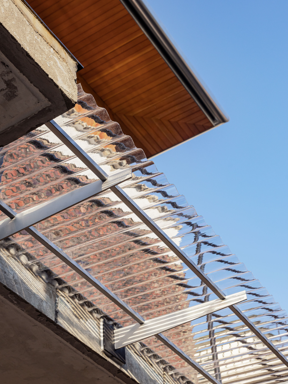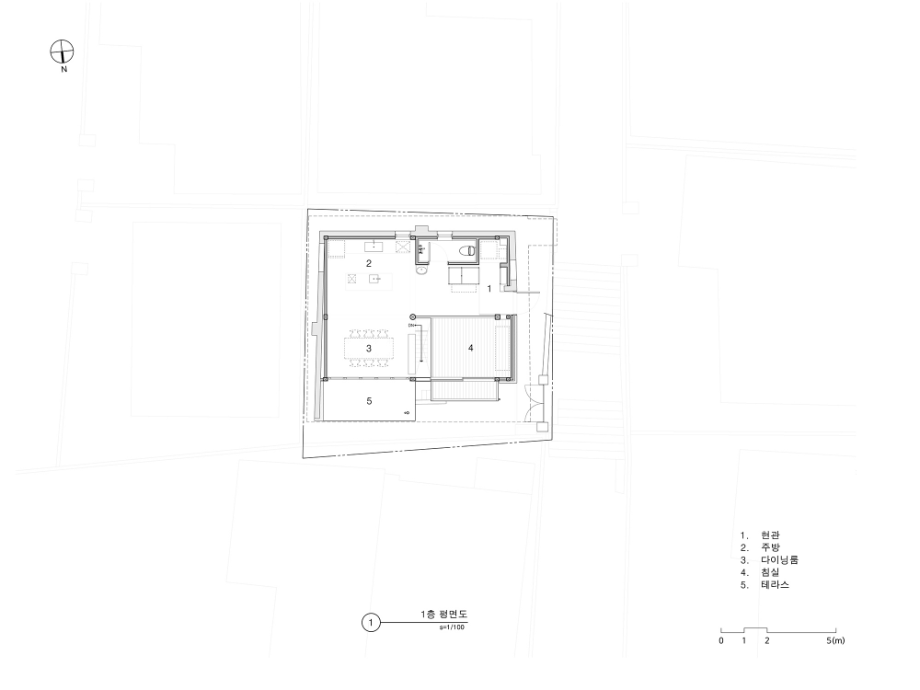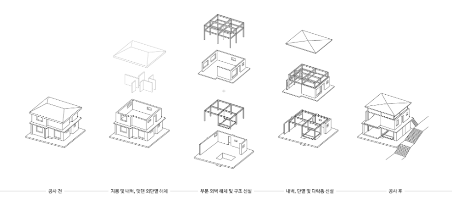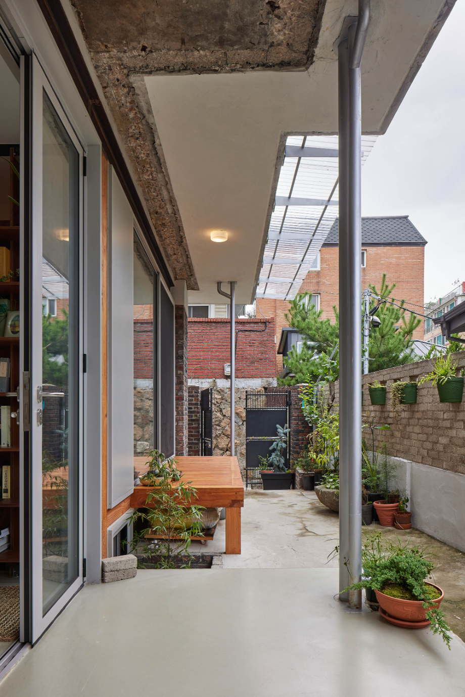주어진 조건에서 최소의 손길로 해답을 찾고자 했다. 외벽을 해체하고 보강하면서, 전면 외벽을 후퇴하여 못쓰던 마당과 테라스를 확장했다. 후퇴한 외벽을 대신하여 기존 2층 바닥의 역보를 유지하고, 역보 하부에 선홈통과 기둥을 결합하여 물 처리와 구조 보강을 동시에 충족시켰다. 1층 구조 보강 기둥에 보를 걸어 지하 상부에 띄워진 평상을 만들고 지하를 1층과 한 공간으로 조성했다.