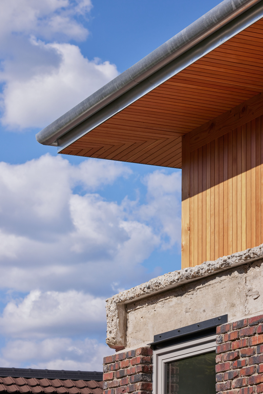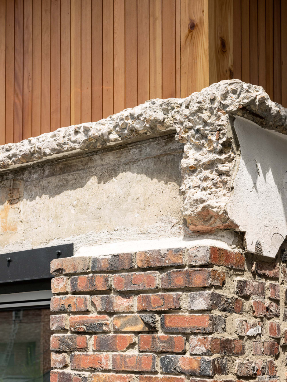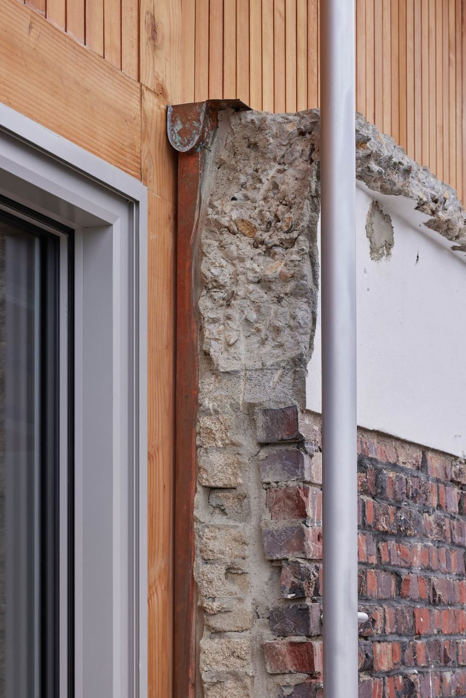 도로 측 입면을 위해 벽돌을 구하던 중 마침 자주 오가는 길에 재개발이 진행 중이었고, 본 주택과 같은 외장의 건물을 찾아 치장 벽돌을 해체 및 수거하고 몰탈을 떼내어 본 주택에 사용했다. 새로운 벽돌 벽과 기존의 벽이 만나는 부분을 톱니 형태로 기존 치장 벽돌을 해체하여 조적을 시공했다.