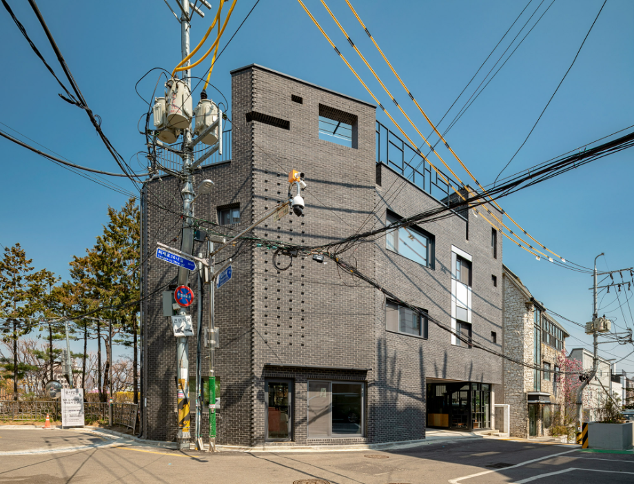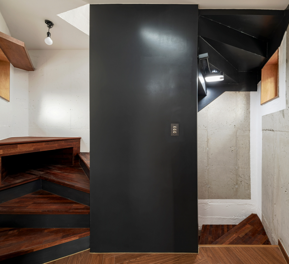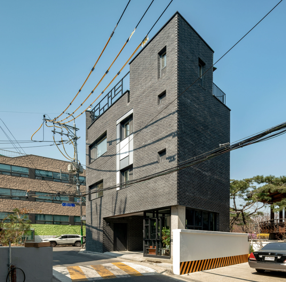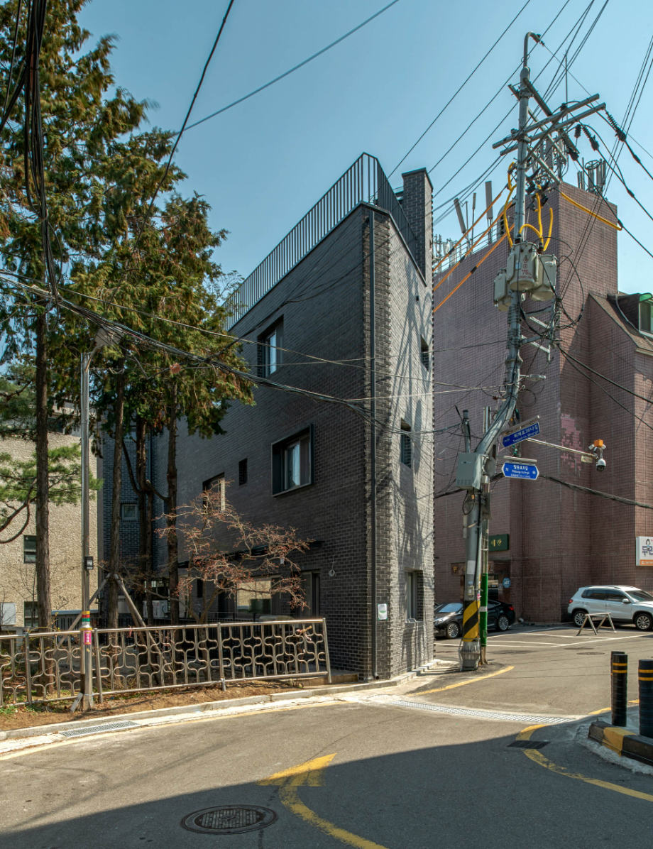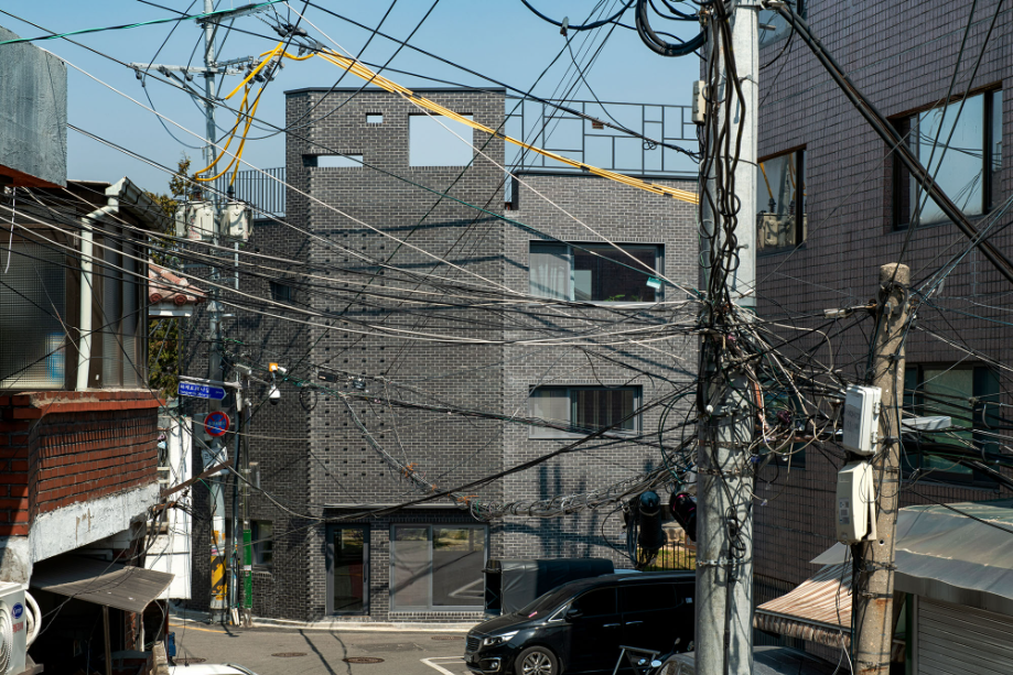 그런데 대지의 형상 때문에 반듯한 형태의 건물이 나올 수는 없었고, 그는 땅에 어울리는 집을 설계해 달라고 우리를 찾아왔다. 일단 각 층의 가용 면적이 50㎡가 채 되지 않고, 용도도 모두 달랐다. 대지의 위치 때문에 서울시에서 의무로 부여한 각종 심의까지, 마치 이리저리 꼬아 만든 수학문제를 풀듯 수많은 제약 조건도 해결해야 했다. 어느 각도에서의 사진도 피하지 못한 복잡한 전깃줄은 이 집이 겪었던 지난한 시련을 상징하는 듯 하다.