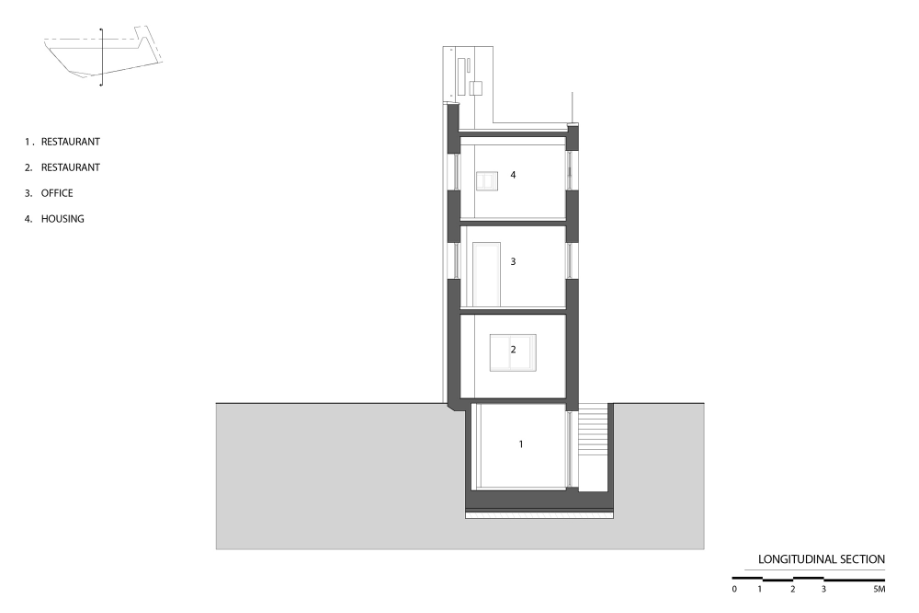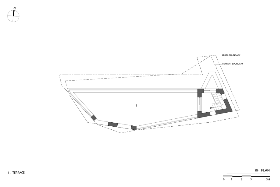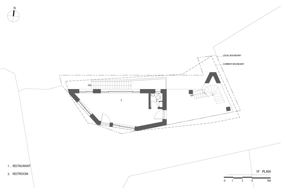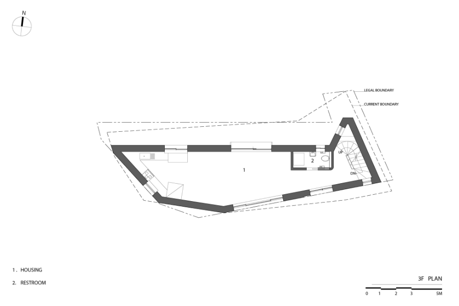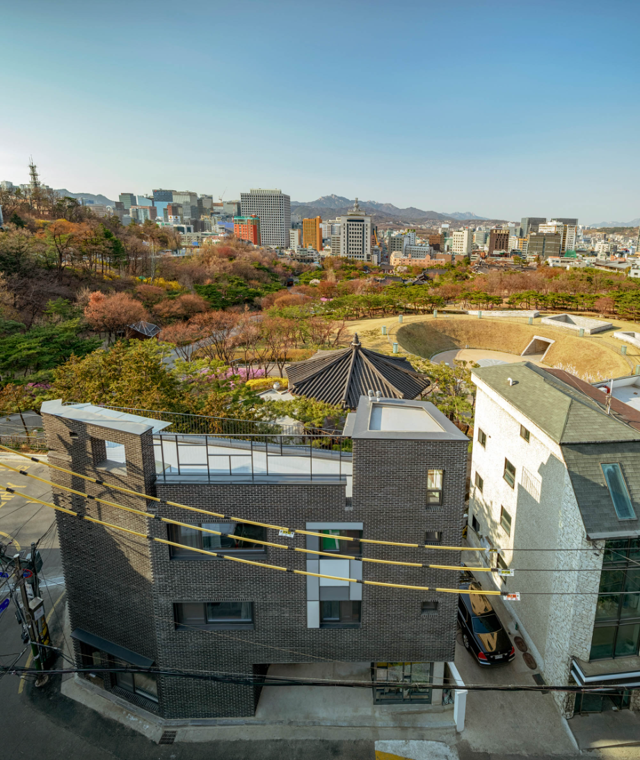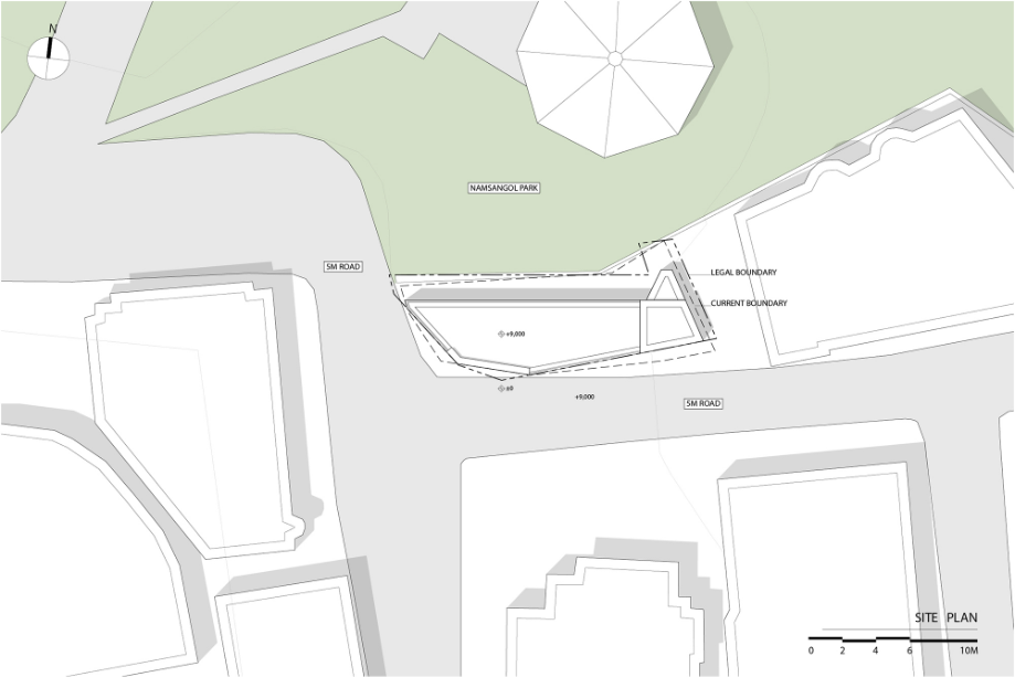 서울 한복판에서 이렇듯 자연과 도시, 그리고 역사적 유산의 경계가 직접적으로 맞닿는 곳은 드물다. 건축가로서는 도전하기에 매력적인 곳이었지만, 지적도상의 대지 형태와 실제 대지 모양이 달랐다. 두 조건을 모두 충족시키는 배 같기도 하고 칼 같기도 한 뾰족한 다각형의 평면이 먼저 구성되었다.