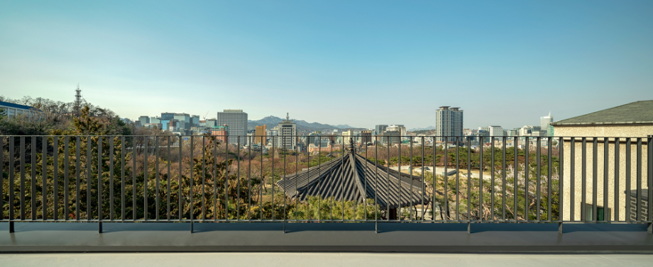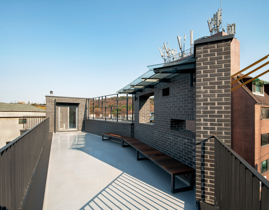 옥상 부분은 양쪽 단순히 난간을 설치한 것이 아니라 양쪽 벽을 올려 계단실로서의 기능과 더불어 성의 망루 같은 역할을 부여했다. 난간도 전통건축의 '평난간' 형태를 모티브로 하여, 좀더 은유적으로 한국 건축의 부분 요소를 담는 건축으로 완결지었다.◼︎