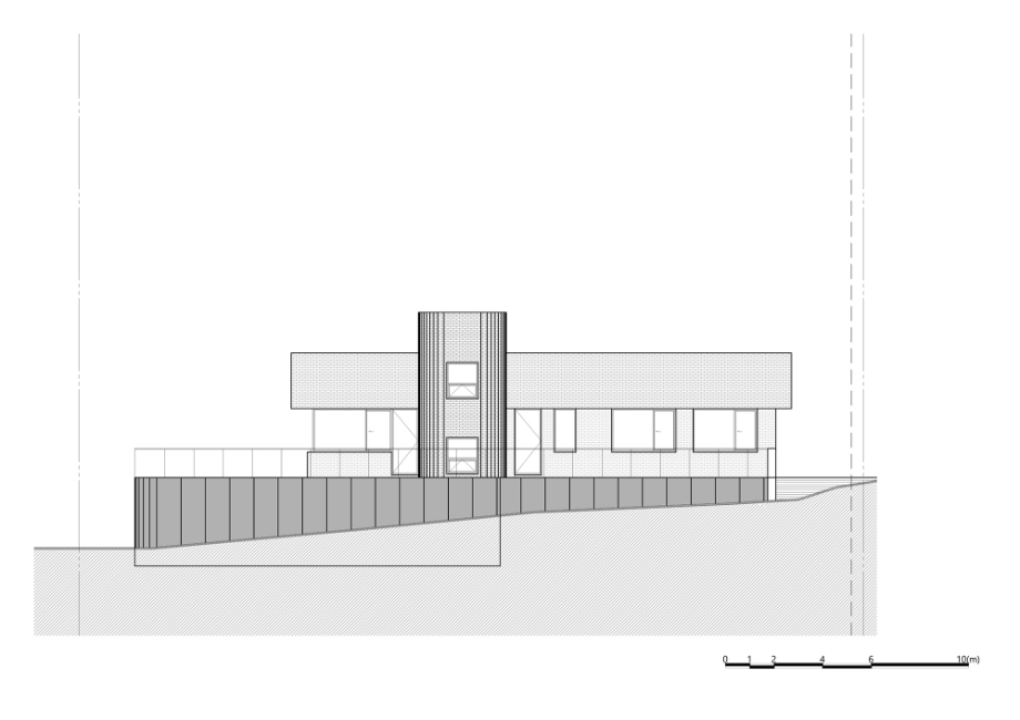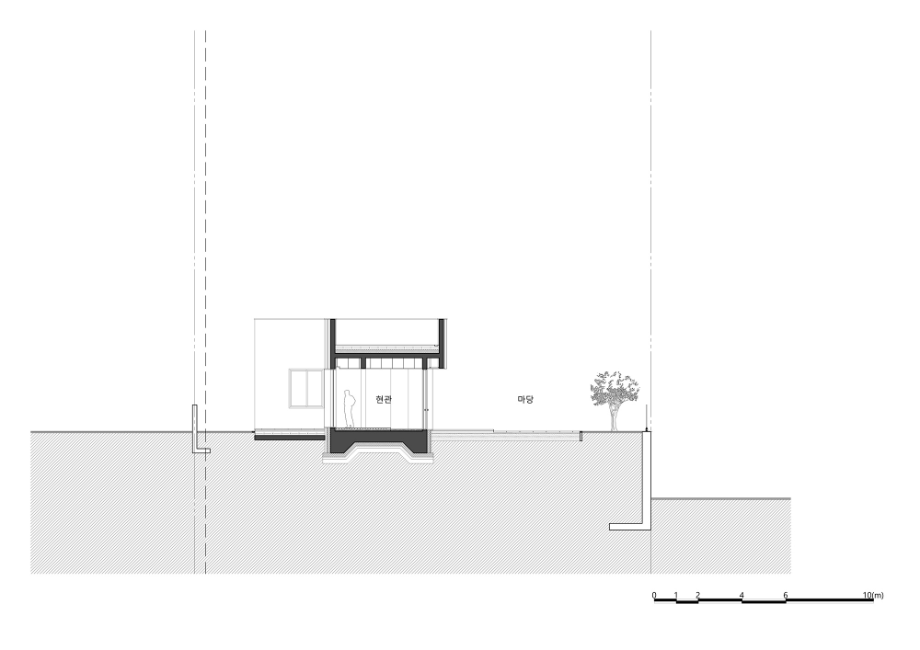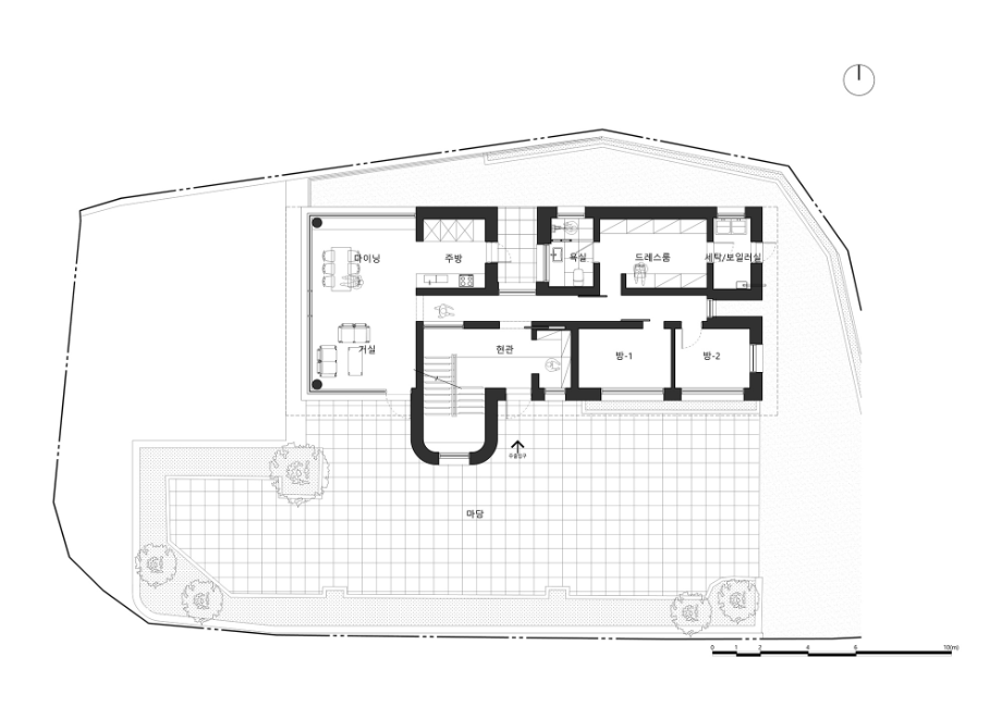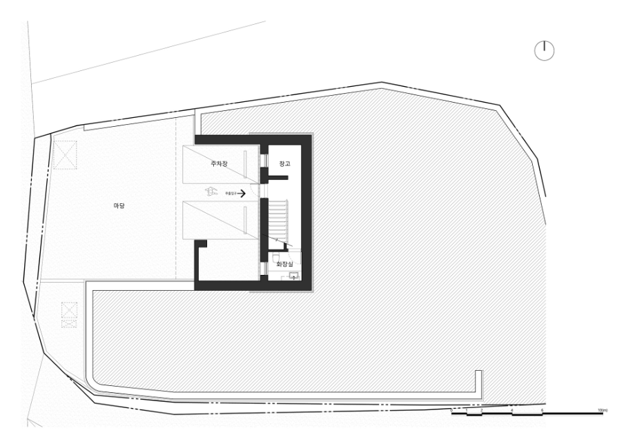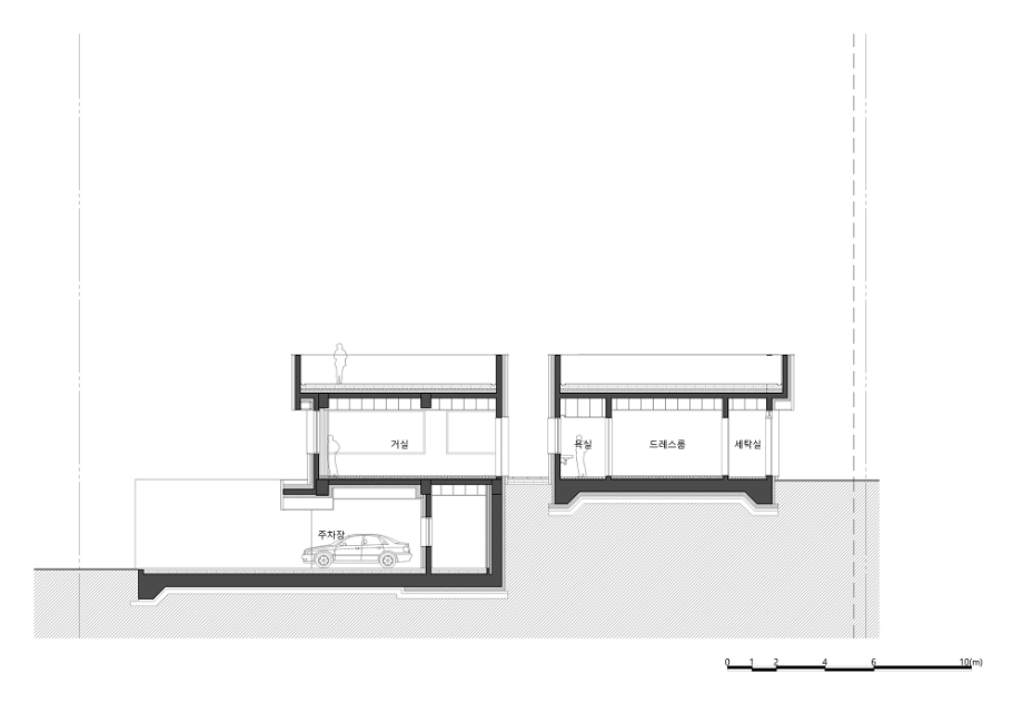 건축주는 대부분 차량으로 이동하기 때문에 주차장에서 내부를 통하여 현관으로 진입할 수 있는 내부 동선을 계획했다. 대지의 고저차를 활용하여 지하 1층과 지상 1층 모두 주차가 가능하다. 현관으로 진입 시 정면에는 창을 통한 외부의 모습이 보이며, 왼쪽(서쪽)으로 보면 거실, 주방 등 공용공간이 위치하여 있으며, 오른쪽(동쪽)으로는 드레스룸, 안방 등 사적인 공간들을 배치했다. 거실과 주방, 다이닝을 건물의 남쪽, 서쪽으로 배치하여 채광 확보와 서쪽 뷰를 바라볼 수 있도록 했다. 거실과 주방, 다이닝 공간은 천장까지 창을 연장하여 외부를 더 잘 느낄 수 있도록 계획했다.