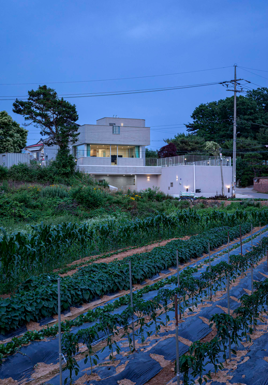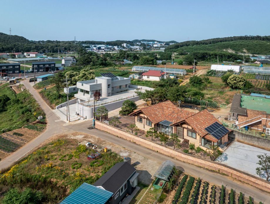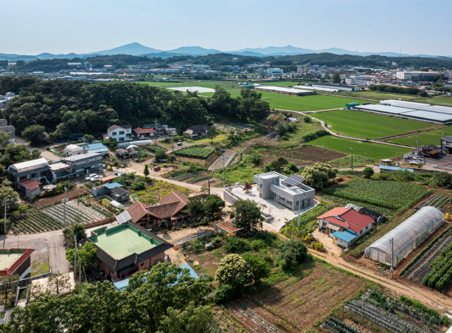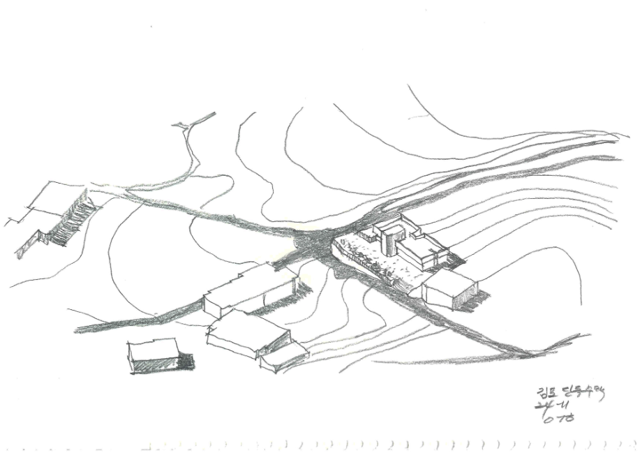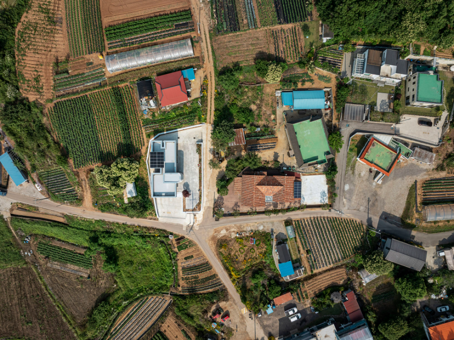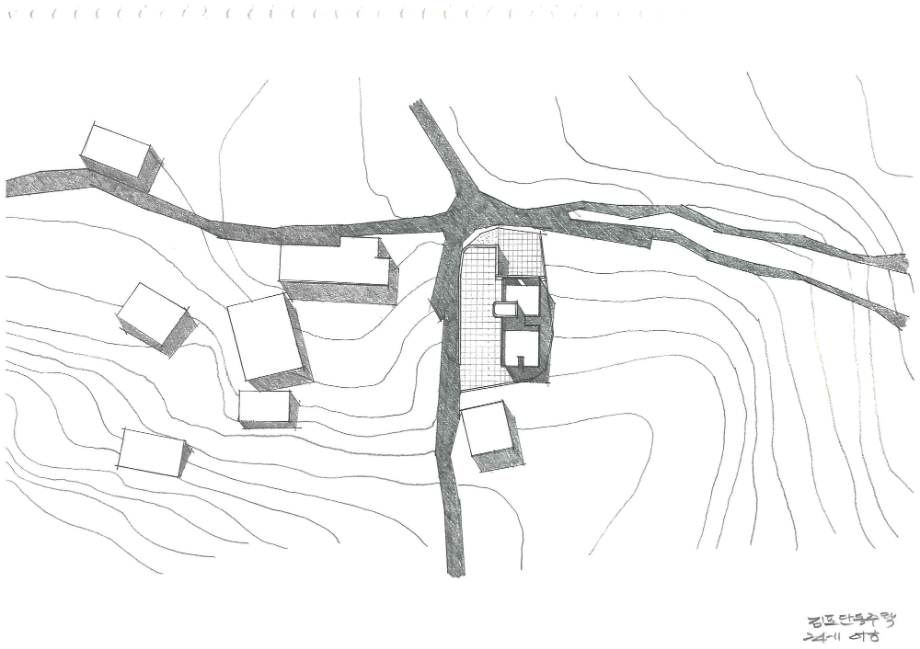 큰 도로에서 좁은 길로 들어오다 보면 논밭이 보이는 사거리에 동서 방향으로 길쭉한 모양으로 되어있는 필지가 있다. 주변의 건물들은 서쪽면을 긴 방향으로 배치가 되어있는데 이는 서쪽으로 경사가 낮게 되어있는 지형의 특징을 반영한 것으로 보인다. 이러한 지형의 특징으로 인해 우리는 남측의 채광과 서쪽의 뷰를 모두 확보해야 한다는 조건이 자연스럽게 생겼다.