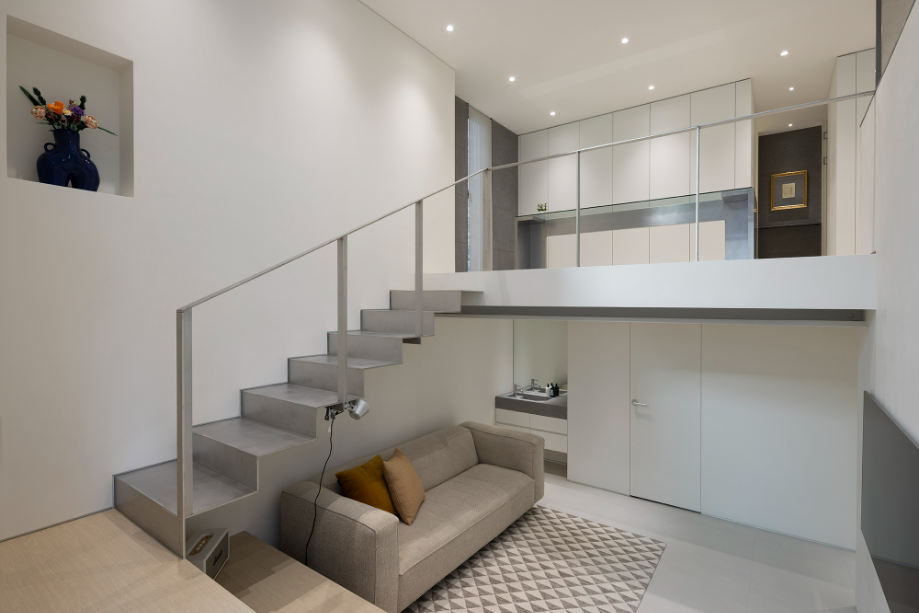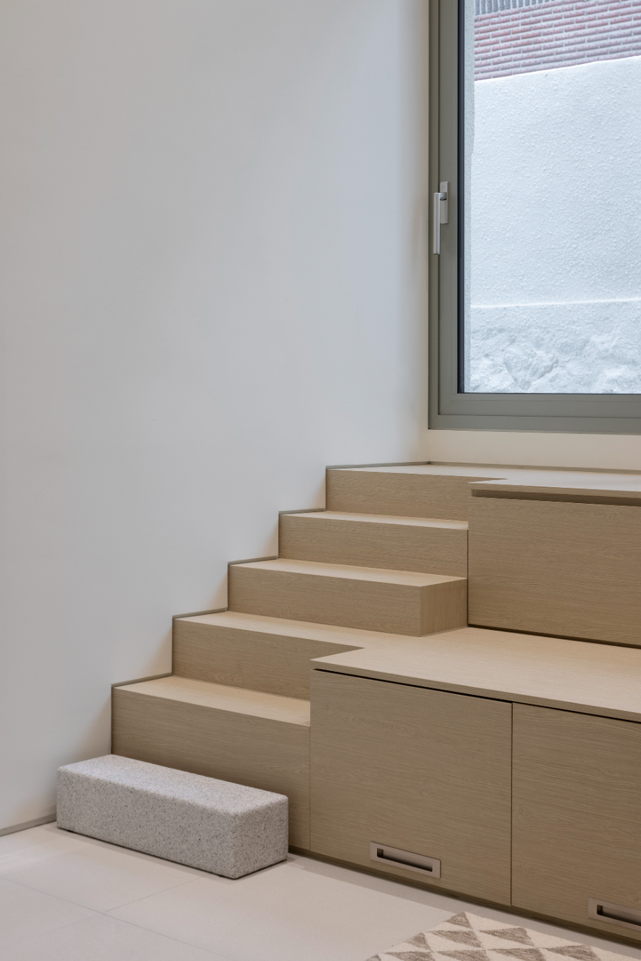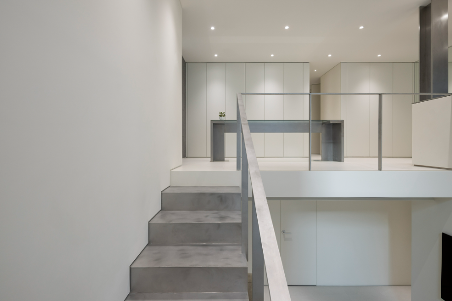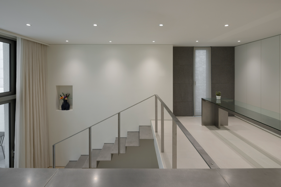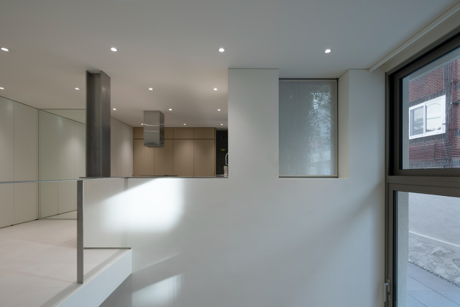지하층에서 1층으로 올라가는 계단의 절반, 즉 반지하와 외부로 연결되는 창까지의 계단은 공간 전체를 아우르는 계단을 조성했다. 어둡고 좁을 수 있는 지하공간이 마치 외부와 자연스럽게 연결된 1층의 공간처럼 보일 수 있도록 했다. 다시 창에서 1층으로 올라가는 나머지 반 개층의 계단은 금속의 경량함을 살릴 수 있는 가벼운 느낌의 계단으로 계획해 좁은 공간을 답답하지 않도록 했다.