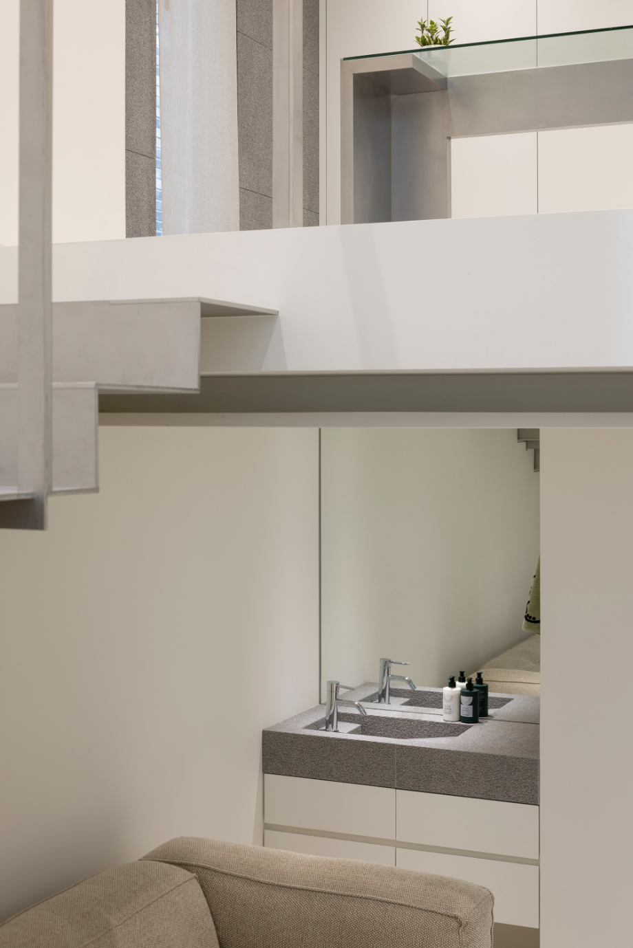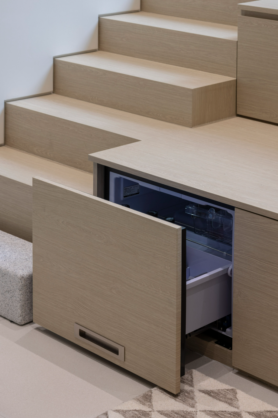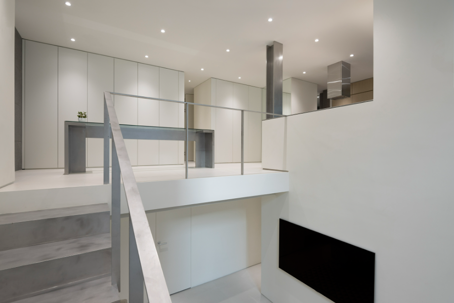 지하층에서 1층으로 올라가는 계단의 절반, 즉 반지하와 외부로 연결되는 창까지의 계단은 공간 전체를 아우르는 계단을 조성했다. 어둡고 좁을 수 있는 지하공간이 마치 외부와 자연스럽게 연결된 1층의 공간처럼 보일 수 있도록 했다. 다시 창에서 1층으로 올라가는 나머지 반 개층의 계단은 금속의 경량함을 살릴 수 있는 가벼운 느낌의 계단으로 계획해 좁은 공간을 답답하지 않도록 했다.