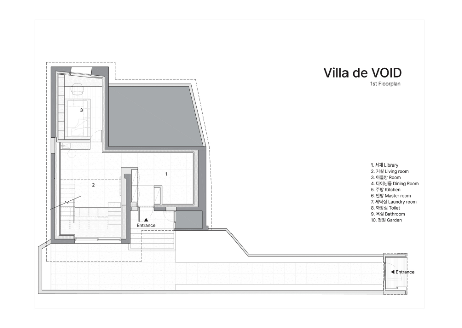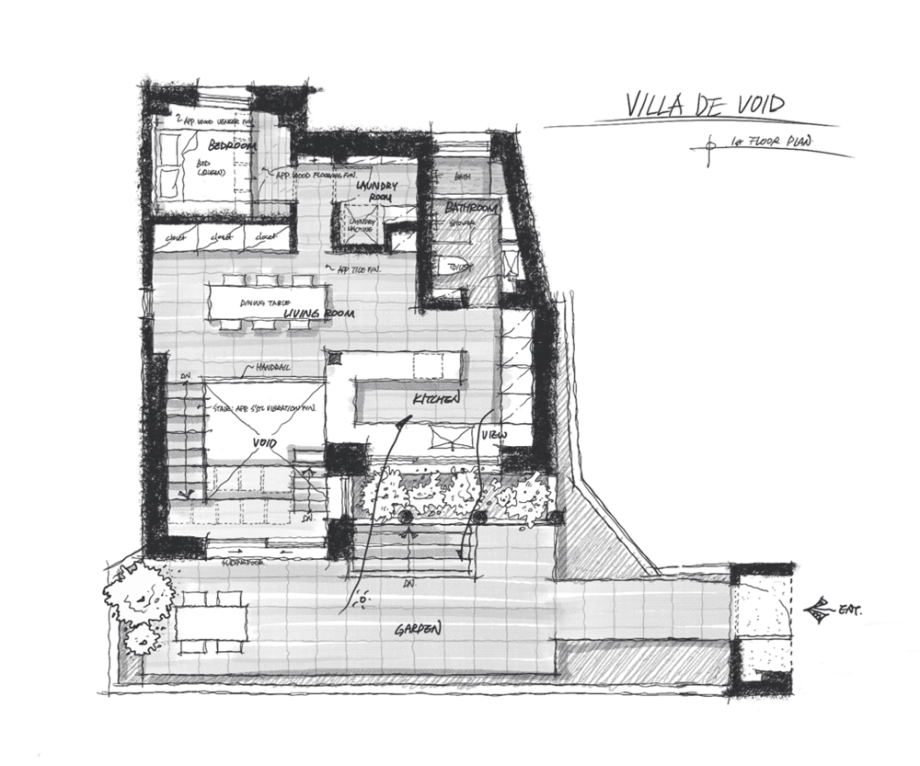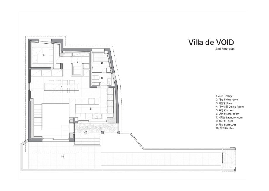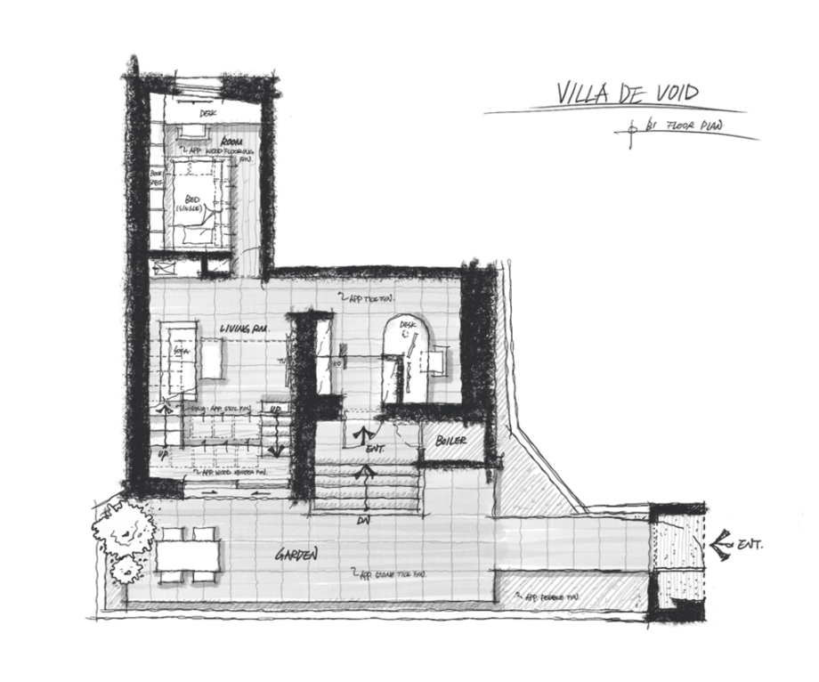 공간 언어에서 'VOID(보이드)'는 덜어냄의 미학을 보여주는 물리적 방법 중 하나이다. 'Villa de VOID' 프로젝트는 지하층과 지상층을 하나로 연결하는 보이드 공간을 구심으로 해석한 공간이다. 비움으로써 비워진 공간은 전체 공간의 흐름의 주축이 되는 구심점의 공간이 되고, 이곳으로 가족 구성원의 움직임이 모여들고 그리하여 다시 채워지는 공간을 상상했다.
