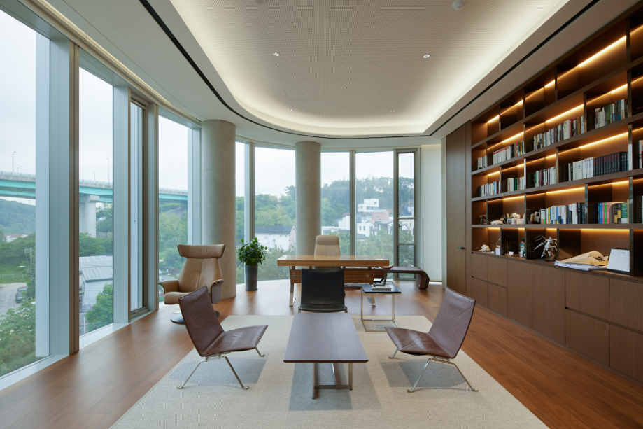 북측 입면은 디지털 미디어 파사드를 통해 낮에는 조형적 입면으로, 밤에는 미디어 아트의 캔버스로 기능하며, 도시와의 또 다른 소통을 만들어낸다. 내부에서는 자연광을 적극 도입하고 시야를 열어, 외부의 자연 풍경이 실내 경험의 일부가 되도록 했다.