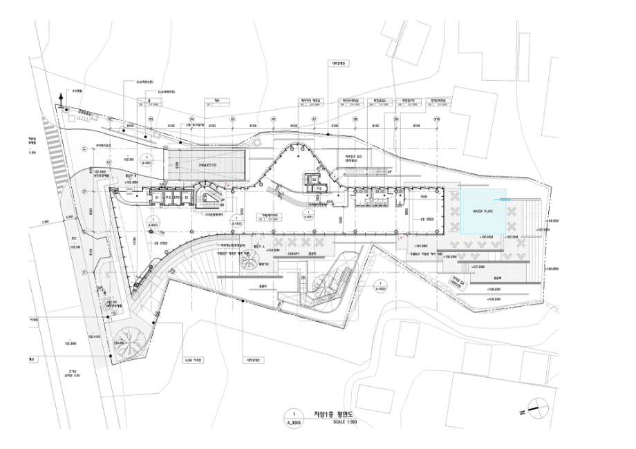 대지는 용인 고기리의 경사지고 불규칙한 지형 위에 자리잡고 있으며, 서쪽으로는 산, 동쪽으로는 고가도로, 남쪽으로는 다양한 상업시설과 접한다. 이러한 맥락 속에서 건축은 대지의 흐름을 따르는 매스를 길게 배치하여 자연과 만나는 접점을 넓혔고, 외부 공간은 작은 숲처럼 조성하여 주변 환경과 부드럽게 연결되도록 했다. 건물의 전면부는 인지성을 확보하면서도 열린 곡면의 입면을 통해 방문자에게 환영의 제스처를 전한다. 특히 1층 카페는 다양한 외부 마당과 유기적으로 연결되며, 일상 속 자연과의 만남을 유도한다.