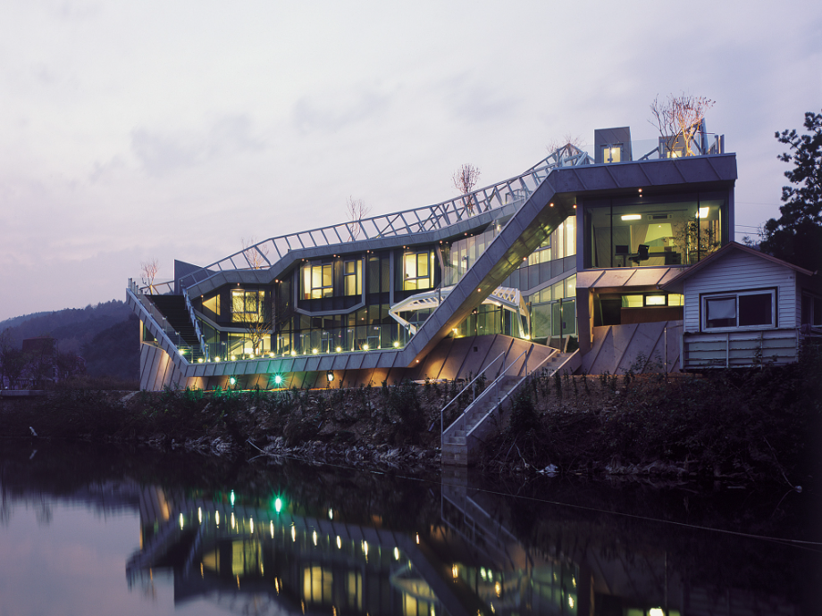 불규칙한 다각형 대지 형태를 따라 형성된 콘크리트 매스와 금속망으로 구성된 '산형' 형태는 계단순환식으 로 형성된 단면개념과 형태적으로 연합되어, 기존 강변을 둘러싸고 있는 '산'들을 닮은 '건축적 산'의 이미지를 구사하게 되면서, 주변 맥락의 일부가 되려는 초기 의도가 형태적으로 구현된 것이다.