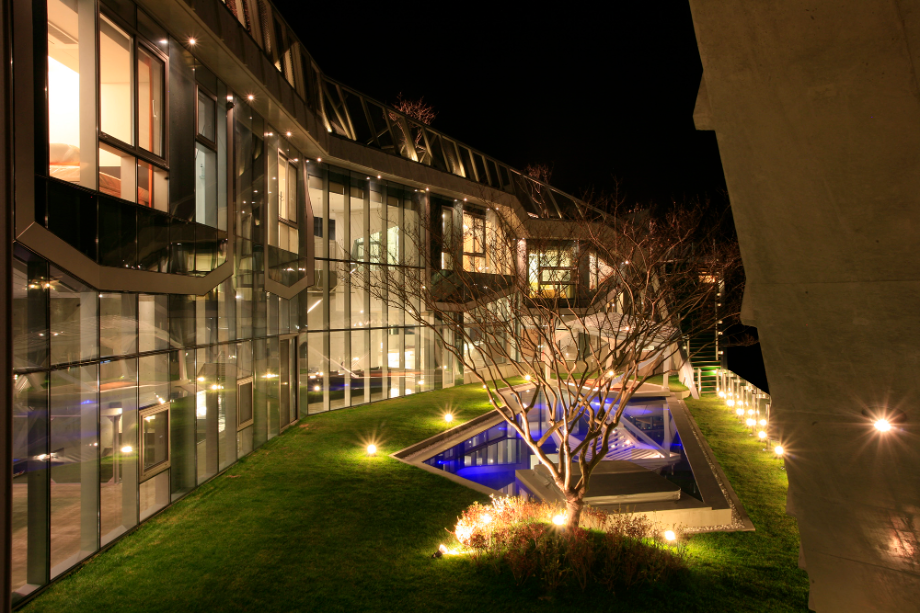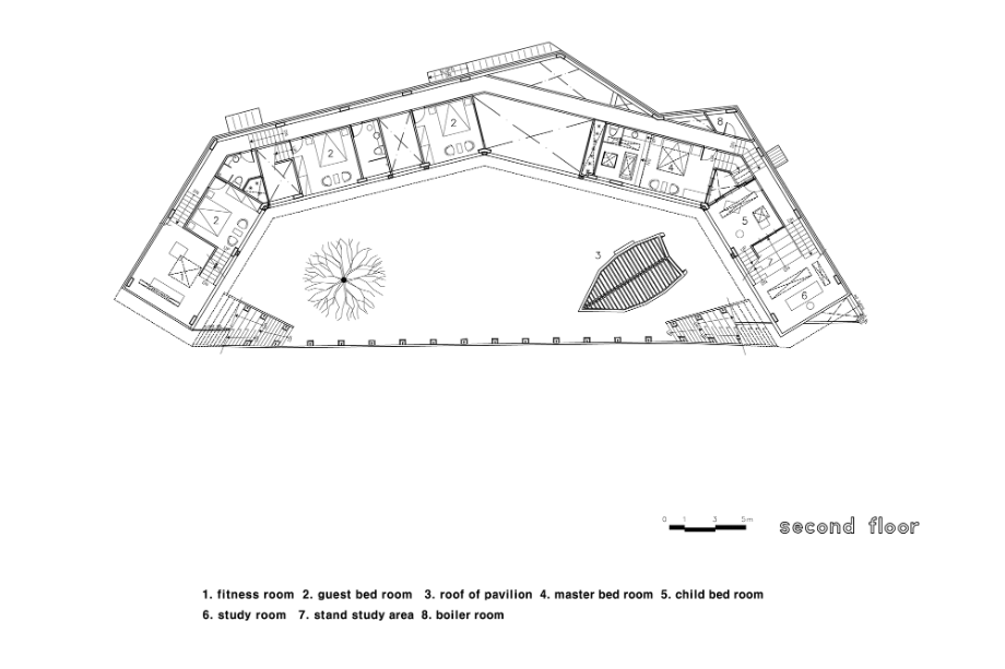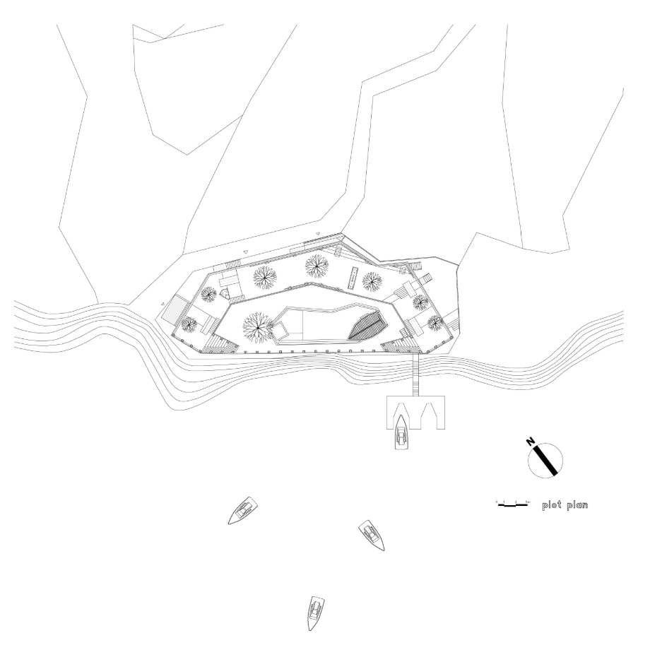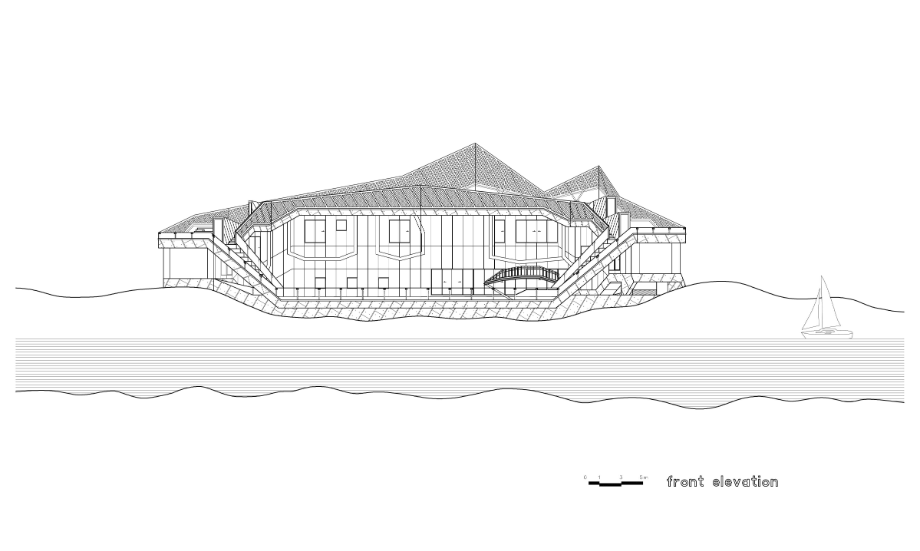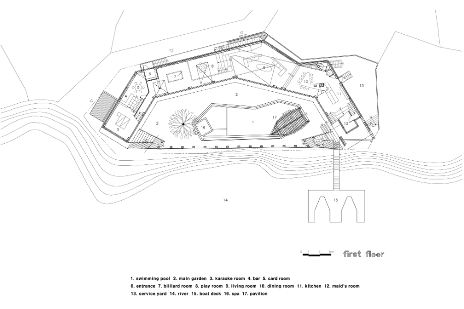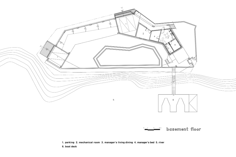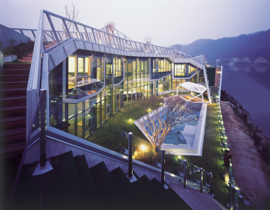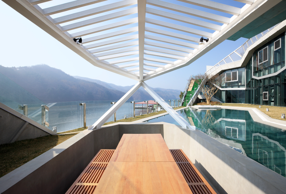 토지이용효율을 극대화하면서, 다각 부정형의 대지 형태를 따라 수영장이 있는 마당을 품어 안은 길다란 콘 크리트 매스의 배치가 구성되어, 물과 녹지로 채워진 이 마당은 '건축화 된 자연'이며, 강과 건축을 소통시키는 '연장된 강'으로서의 중심적 휴양공간이다.
