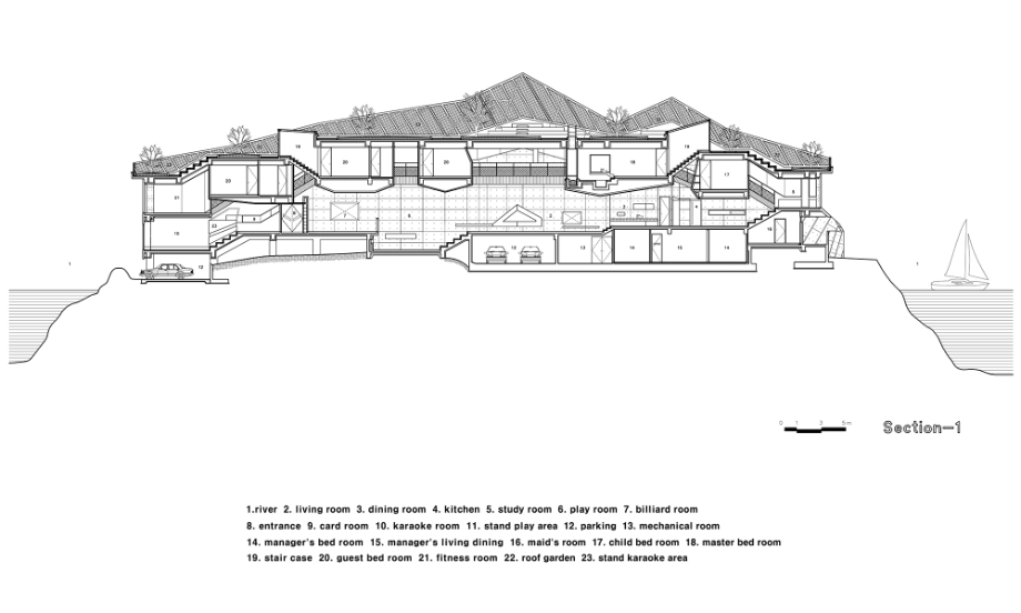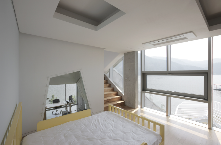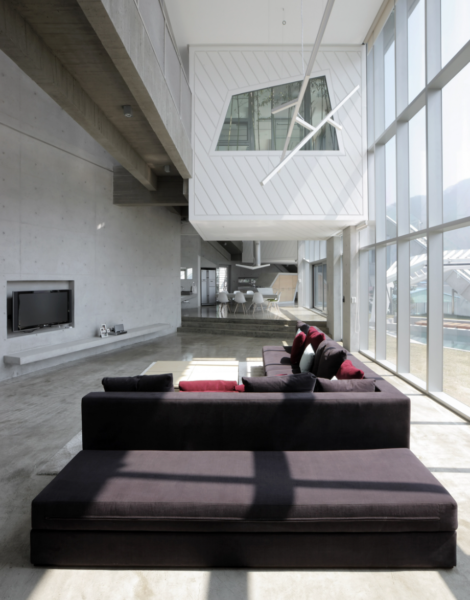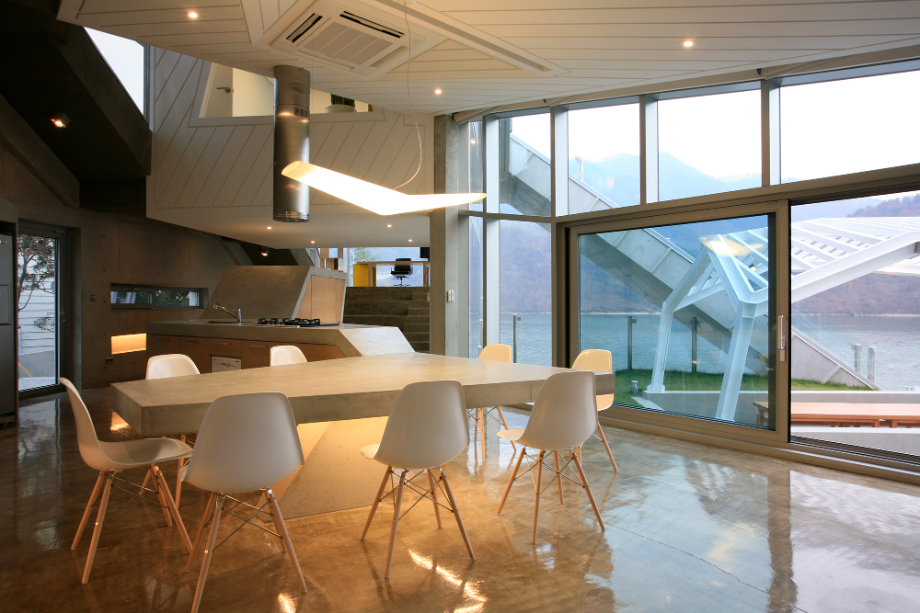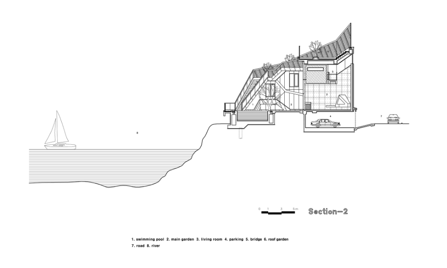 당연히, 이 대지 형태의 매스 속 모든 실들은 강으로 향해 회화적 산수의 풍경을 흠뻑 즐길 수 있도록 적극적인 풍경 지향적 배치가 되어있으며, 상부 계단식 옥상정원의 바닥 레벨들이 만들어내는 실내 경사 천정 선과 안마당의 바닥 선으로 구성되는 거실의 거대한 전면창의 프레임을 통해 회화화된 파노라믹한 전면의 산수풍경은 이 집의 대표적 인상이 되고 있다.