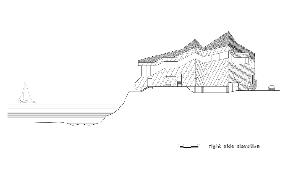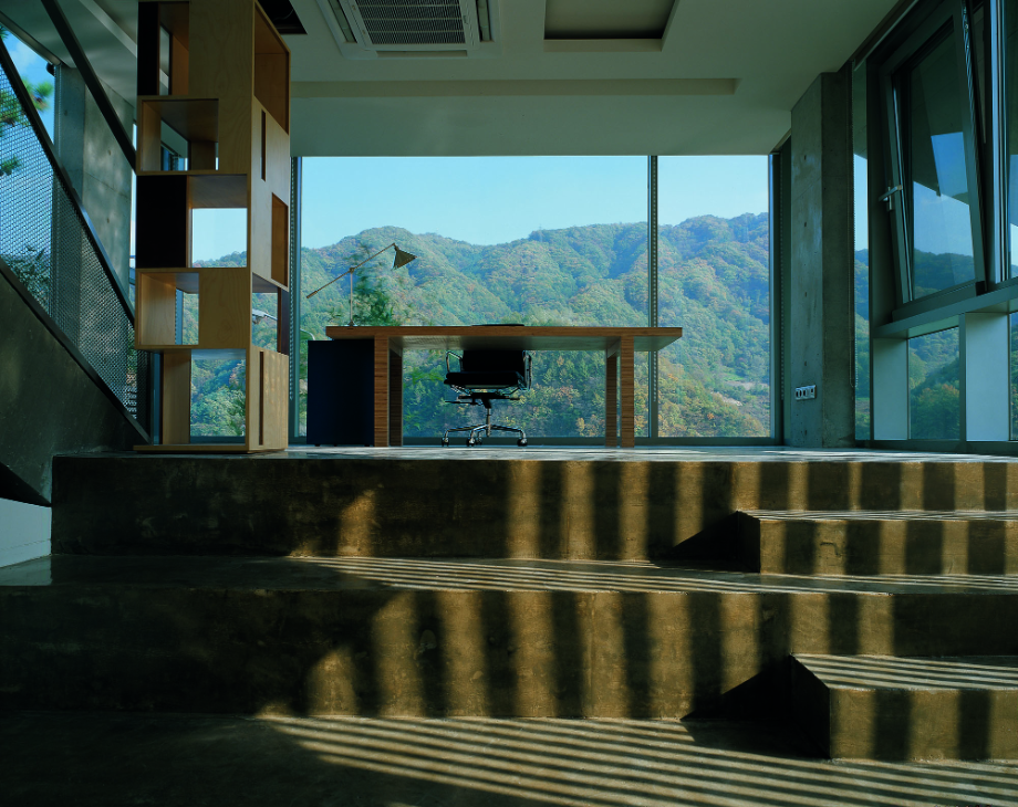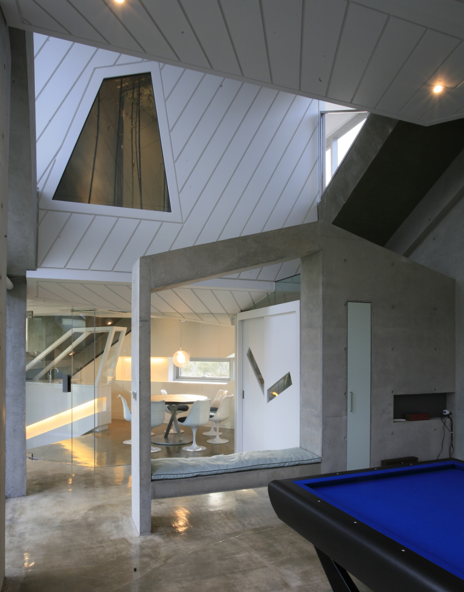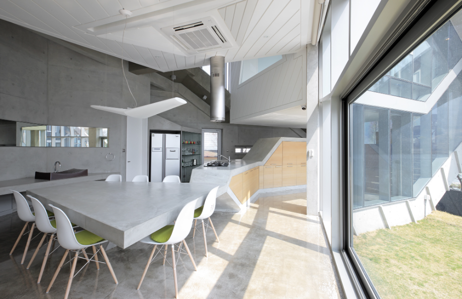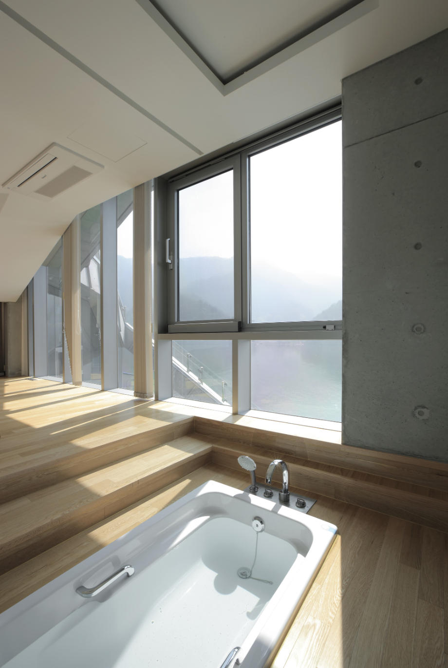당연히, 이 대지 형태의 매스 속 모든 실들은 강으로 향해 회화적 산수의 풍경을 흠뻑 즐길 수 있도록 적극적인 풍경 지향적 배치가 되어있으며, 상부 계단식 옥상정원의 바닥 레벨들이 만들어내는 실내 경사 천정 선과 안마당의 바닥 선으로 구성되는 거실의 거대한 전면창의 프레임을 통해 회화화된 파노라믹한 전면의 산수풍경은 이 집의 대표적 인상이 되고 있다.