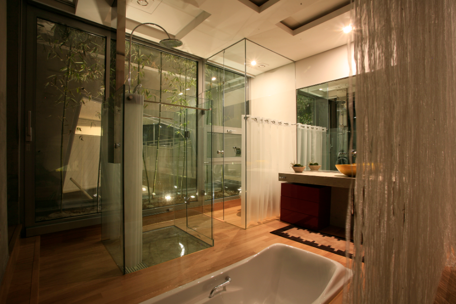 내부 공간은 반 층 레벨로 연속 순환되게 함으로써, 유연하고 변화로운 흐름의 공간을 연출하며, '건축화된 자연'으로서 떠 있는 대나무 화단을 내장하고 있는 여러 개의 침실, 욕실의 백색 다면체의 매스들을, 1층 상부공간에 다양한 높이로 부유하게 함으로서 수직적 공간성의 다양한 이야기를 수록하게 하고 있다.