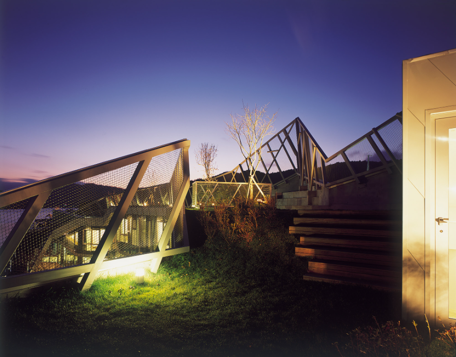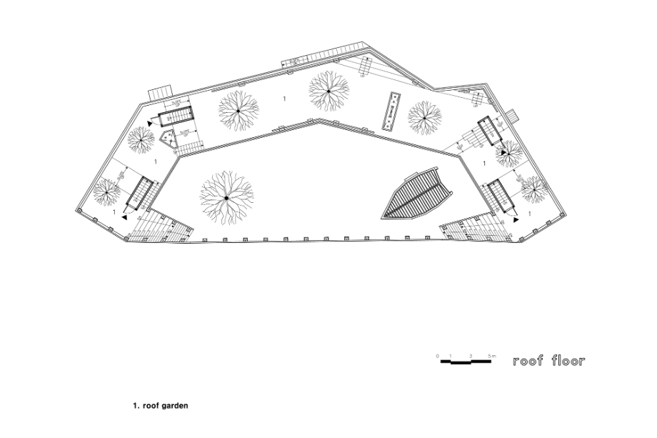 매스의 옥상부분 전체는 계단식으로 움직이고 상승하며 다양한 레벨로 옥상정원화 되어 상층부 각 레벨의 침 실들과 직접 연결되면서, 전체적으로 1층 안마당의 양측면으로 최종 접속되어, 수영장과 녹지가 있는 안마당과 계단식 옥상정원 전체가 하나의 연속된 조경적 장소로서 순환되도록 구성됐으며, 이곳에는 물과 꽃과 과실수가 있는 '건축화된 자연'으로서의 개념이 의미되어 있다.