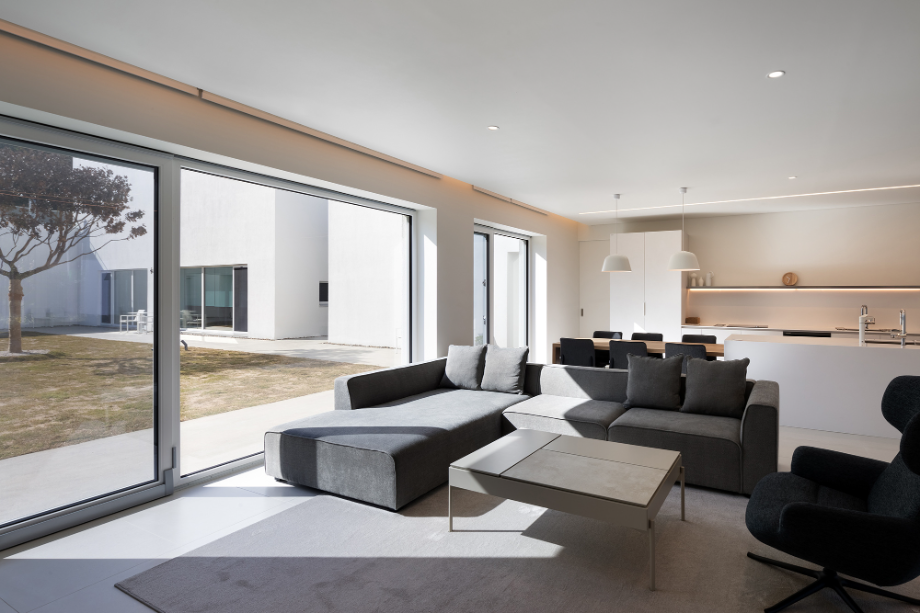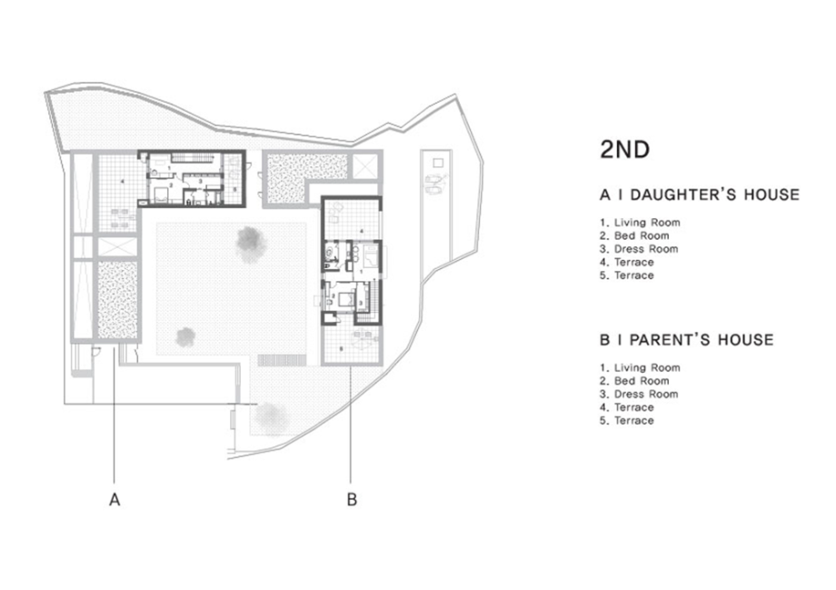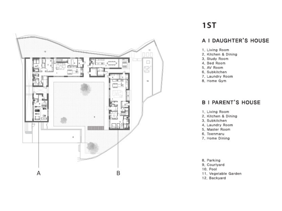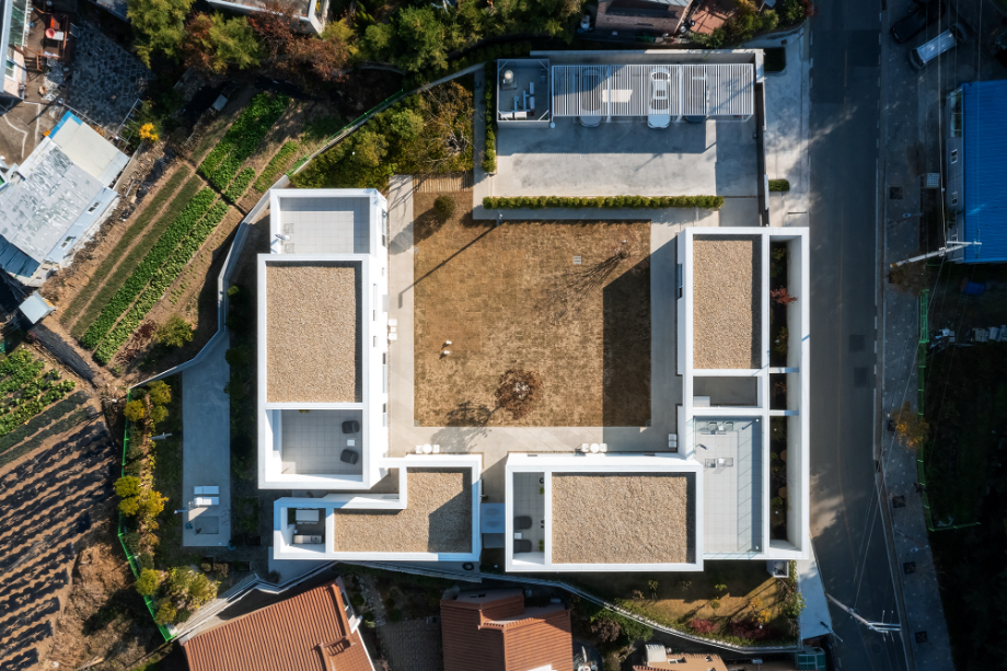 부모님 집과 자녀 집은 분리하여 2채로 나누어 짓고, 그 사이에 대식구가 함께 모일 수 있는 홈 다이닝 공간과 운동 시설인 홈짐을 'ㄷ' 자 형태로 배치하고 가운데에 너른 잔디 마당을 두었다. 부모님 집은 남향으로 배치해 해가 잘 드는 따뜻한 집으로, 자녀 집은 손주들을 위해 성장하는 빛과 기운이 잘 들도록 동향으로 앉혔다.