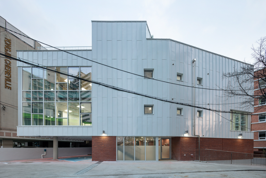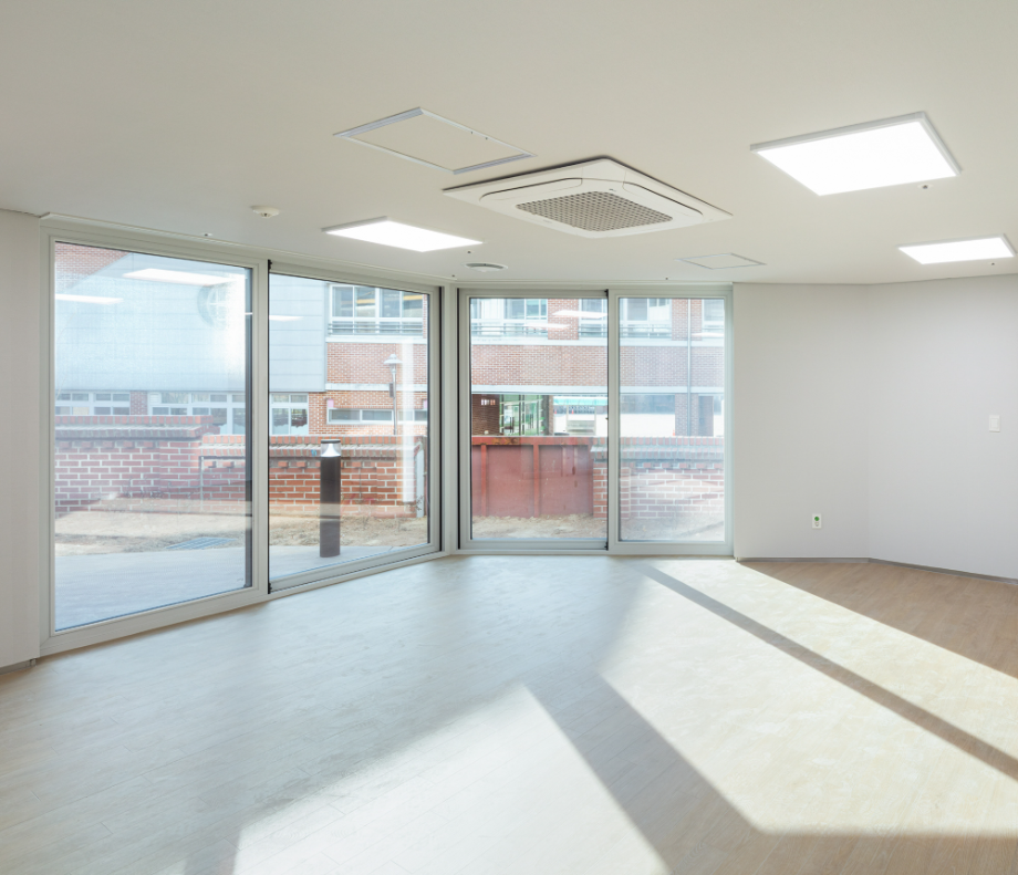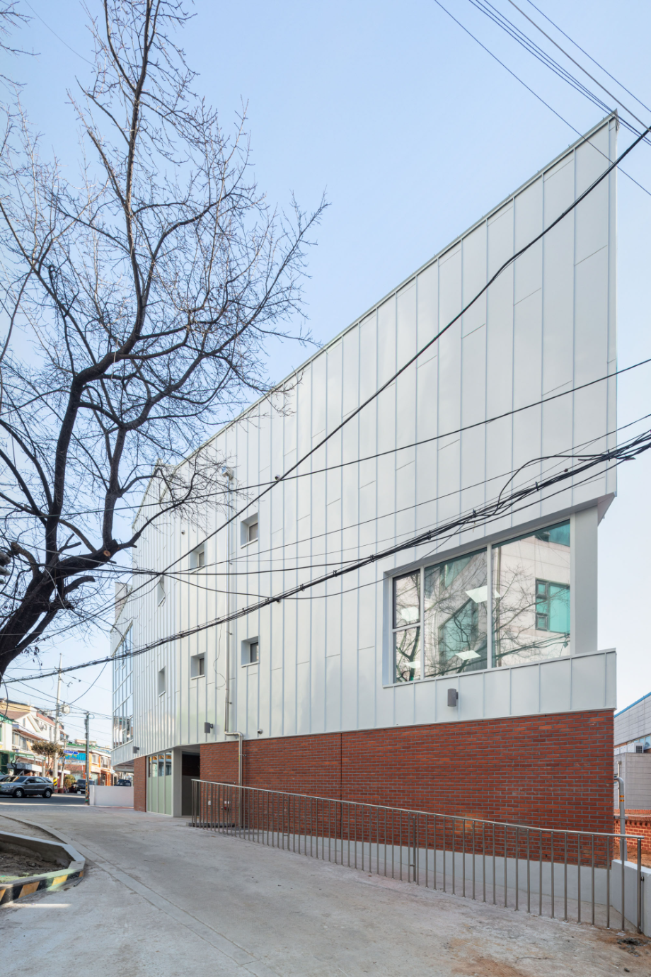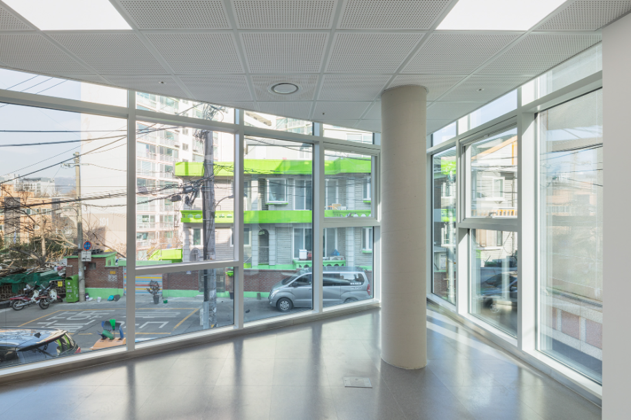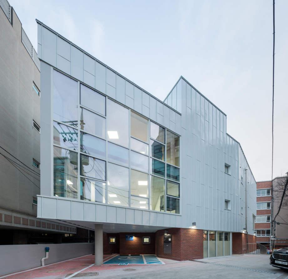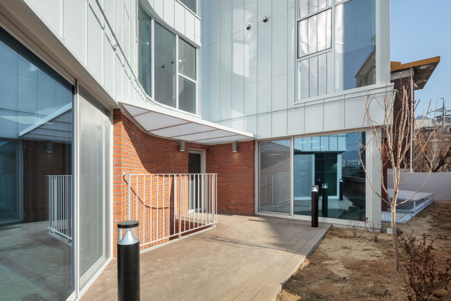 건물 외장 재료는 경로당으로 대표되는 1층의 경우 어르신들에게도 친숙한 재료인 점토벽돌을 사용하여 주변 환경과 잘 어우러지게 했다. 사무실과 교육실의 2~3층은 큰 볼륨의 매스 느낌을 완화 시키면서 낙후된 지역에 밝고 경쾌한 느낌을 주기 위해 백색 코팅 금속패널을 사용했다. 코로나로 인한 공사비 상승으로 인해 기존 설계공모안에서 계획되었던 휴게 옥상마당 시공은 현재 이뤄지지 못해 아쉽지만, 추후 보완되어 활발하게 사용되는 공간이 될 거라 기대해 본다.
