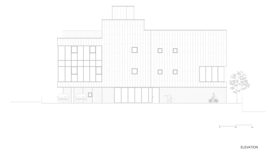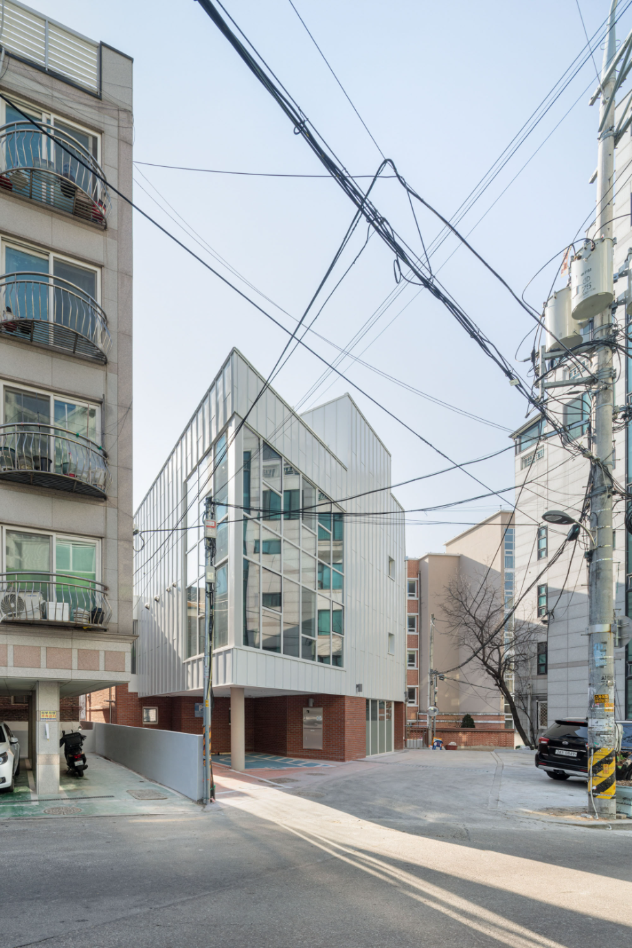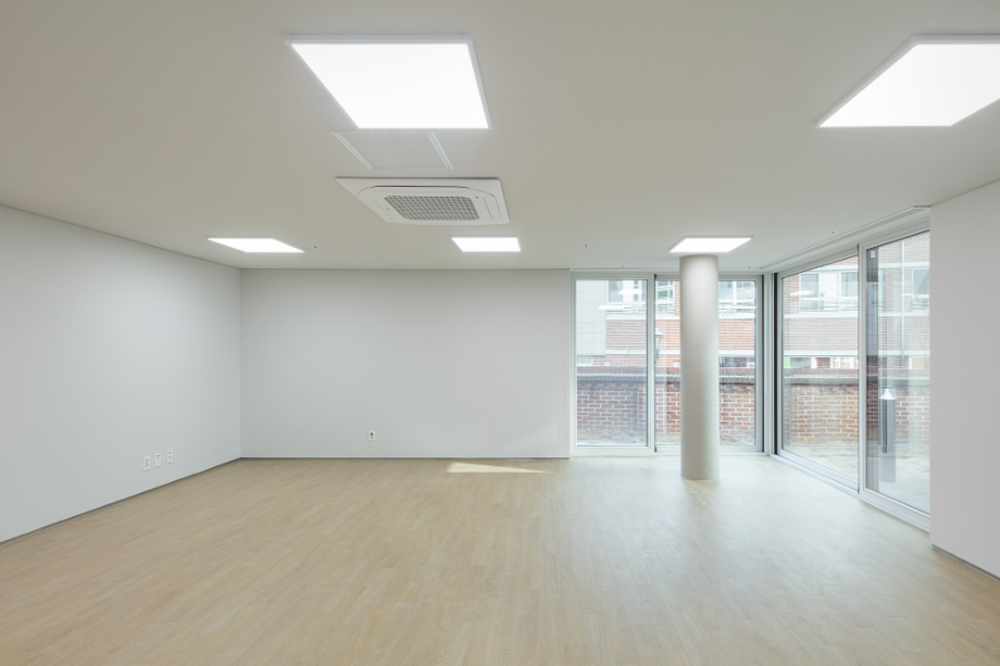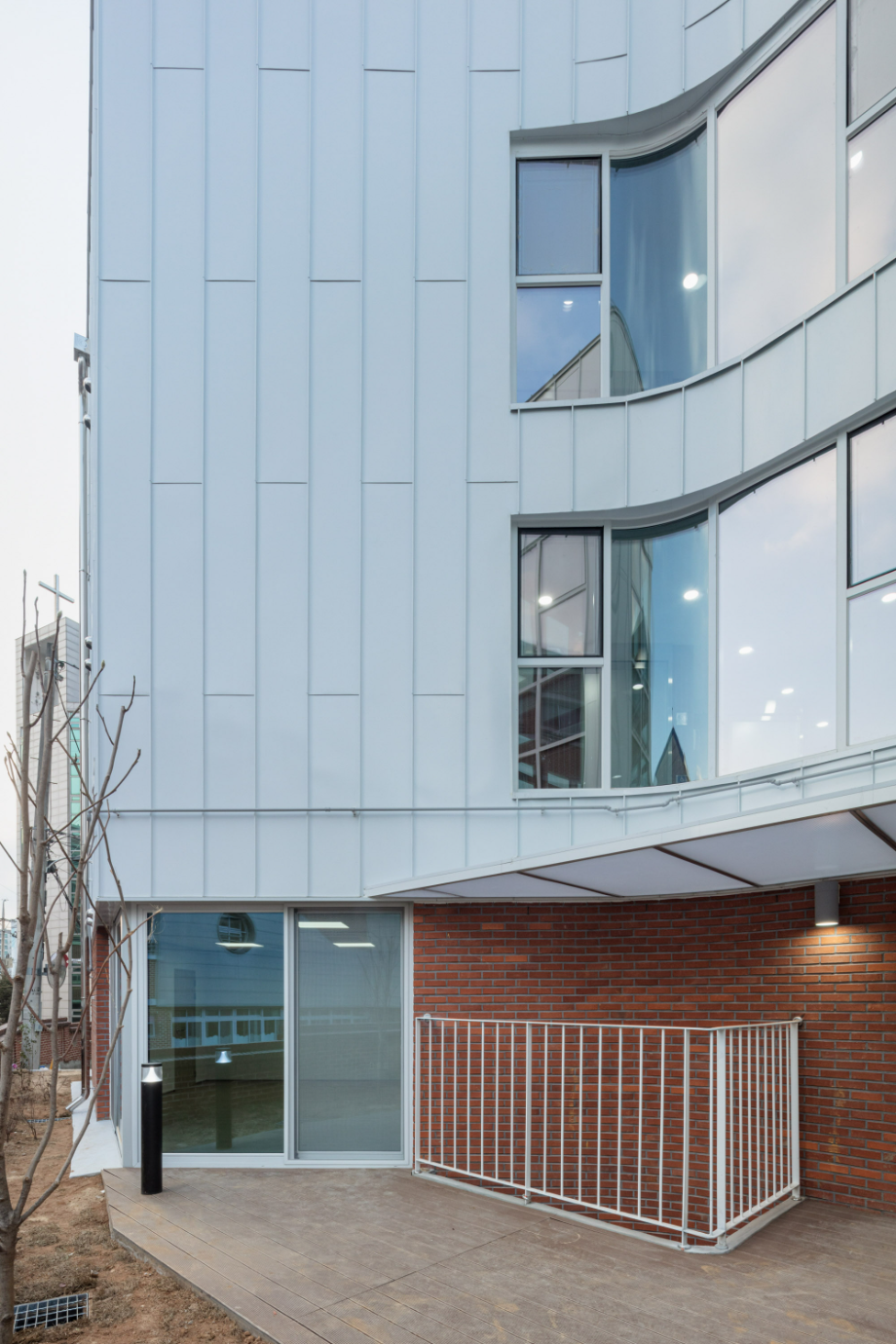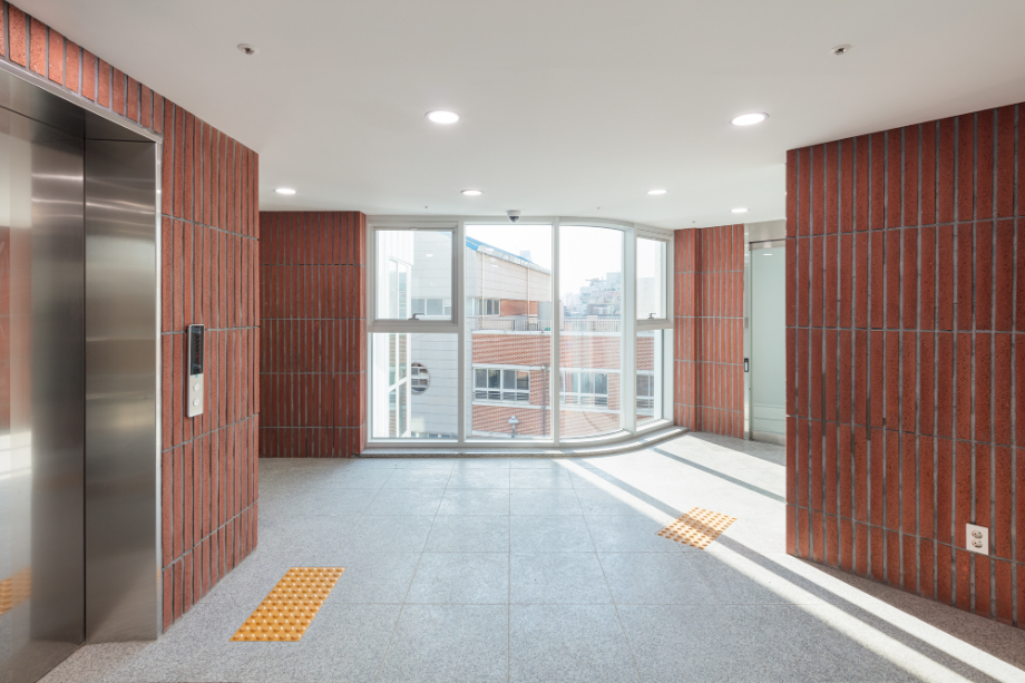 건물 외장 재료는 경로당으로 대표되는 1층의 경우 어르신들에게도 친숙한 재료인 점토벽돌을 사용하여 주변 환경과 잘 어우러지게 했다. 사무실과 교육실의 2~3층은 큰 볼륨의 매스 느낌을 완화 시키면서 낙후된 지역에 밝고 경쾌한 느낌을 주기 위해 백색 코팅 금속패널을 사용했다. 코로나로 인한 공사비 상승으로 인해 기존 설계공모안에서 계획되었던 휴게 옥상마당 시공은 현재 이뤄지지 못해 아쉽지만, 추후 보완되어 활발하게 사용되는 공간이 될 거라 기대해 본다.
