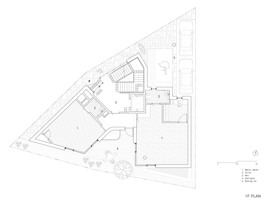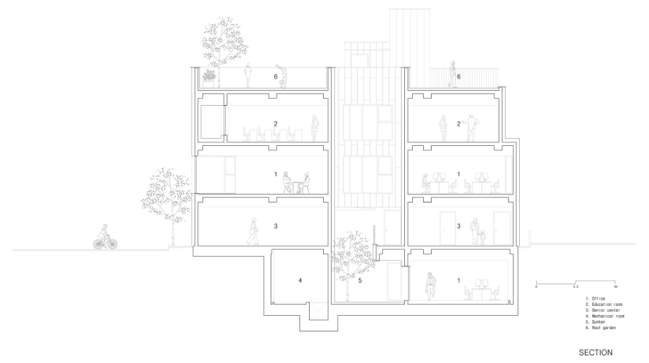 1층 경로당은 할머니 방, 할아버지 방에서 중정마당인 실버그라운드로 바로 나갈 수 있게 연계하여, 어르신들이 안전하고 편안하게 실외로 공간을 확장하여 활동할 수 있도록 했다. 또한 초등학교 담벼락과 면해있는 남측으로 조망을 확보하여 초등학생들이 뛰어노는 모습을 볼 수 있도록 배려했다. 자활센터로 사용되는 2층 사무실과 3층 교육실은 가운데 공용공간을 중심으로 우측 대공간과 좌측 소공간으로 구분하여 프로그램의 용도에 맞게 활용할 수 있도록 계획했으며 타공 흡음패널을 천장과 벽에 사용하여 소음 발생에 신경을 썼다. 지하라는 태생적 한계를 가진 지하1층 사무실은 썬큰과 D.A 계획으로 채광 및 환기가 쉽게 가능한 실내 여건을 만들어 줬다.