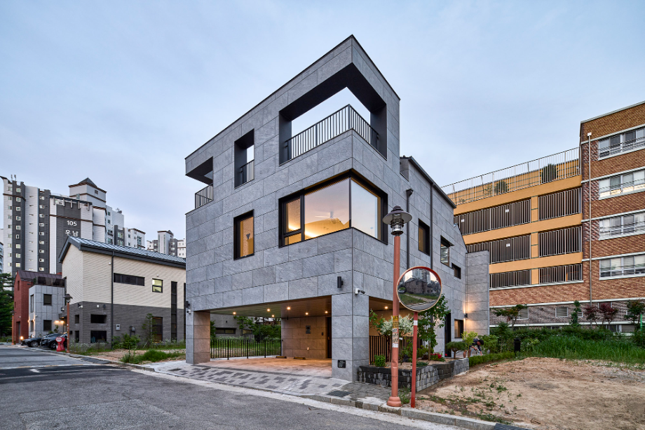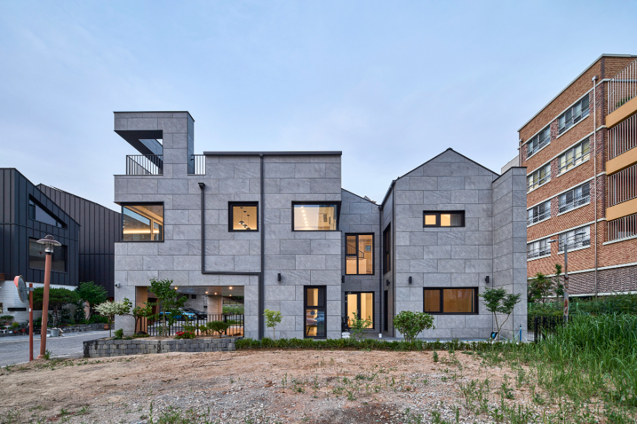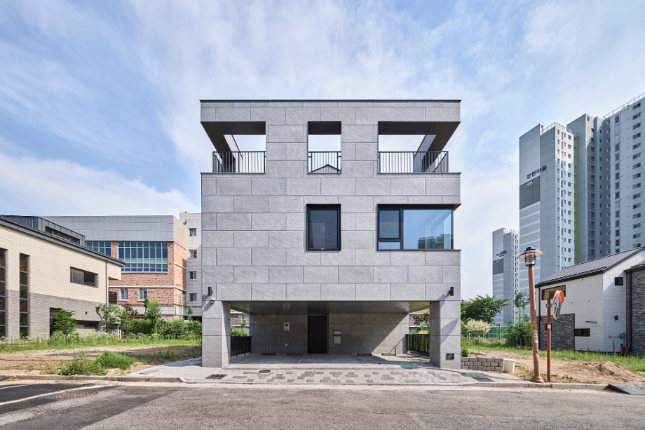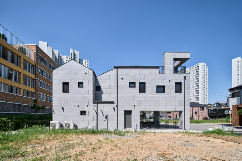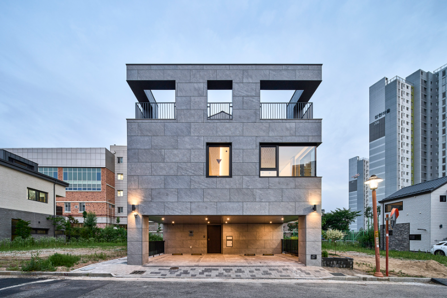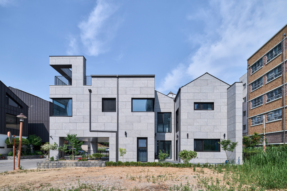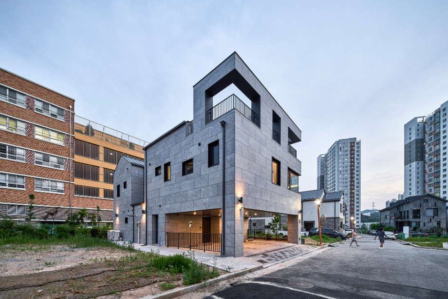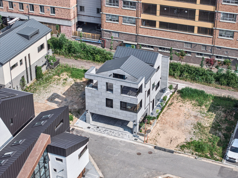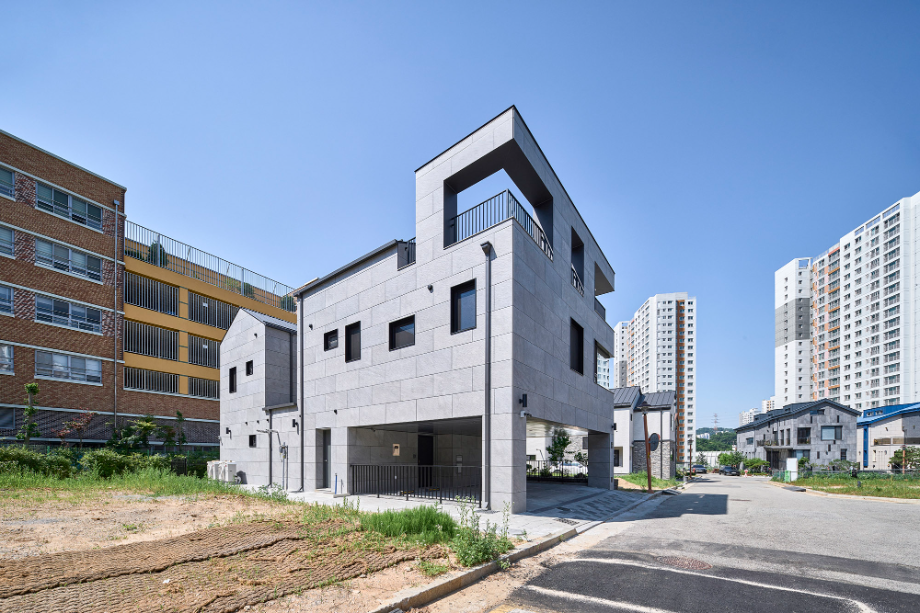 각각의 공간들과 연결되는 외부공간들을 고민하며 1층을 띄워 필로티 공간을 구성하고, 삶에서 잠시나마 여유를 느낄 수 있는 중정, 다락에서 연결되는 공원조망 테라스 등 대지의 조건에서 최대한 외부와 관계 맺을 수 있는 비워진 공간들을 삽입시켰다. 비워진 공간들에서 빛이 스며들고 바람이 드나들 수 있게 하고, 가족들의 다양한 삶의 모습들이 채워지길 바라며 공간을 구성했다.