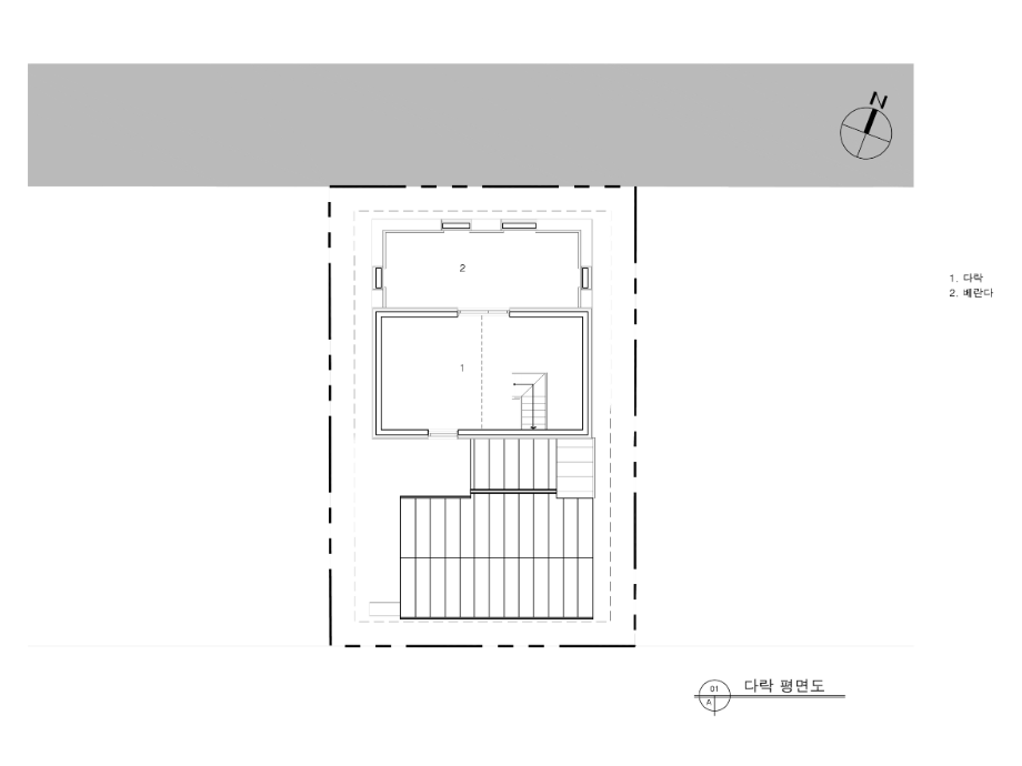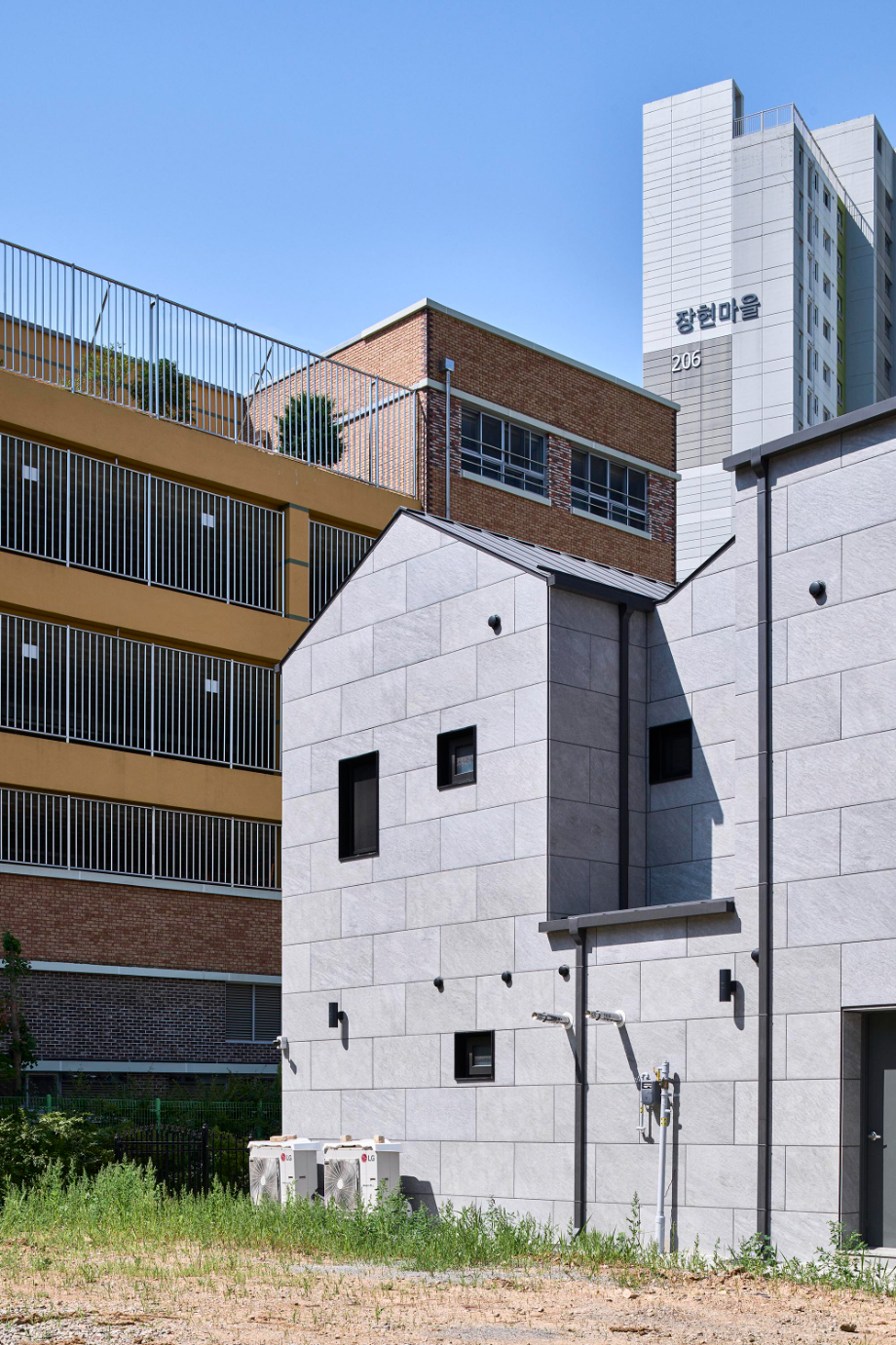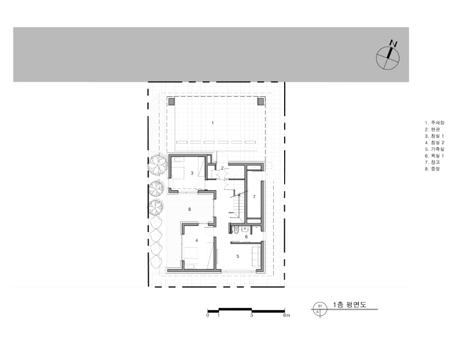 대지는 북측으로 주택단지 내 도로, 남측으로 보행자도로, 고등학교에 면해있었다. 북측으로 공원을 향해 갈라진 도로가 있어 공원으로의 일부 조망이 가능했다. 남측으로는 고등학교가 바로 면해있어, 소음과 시선으로부터 프라이버시를 확보하는 것이 필요해 보였다. 건축주 가족은 4인 가족으로, 20대의 자녀와 부부의 공간을 구분하길 원했고, 추후에 장성한 자녀들이 출가하는 것도 염두하고 있었다. 또한 취미생활을 즐길 다락과 필로티 주차공간을 요구했다.