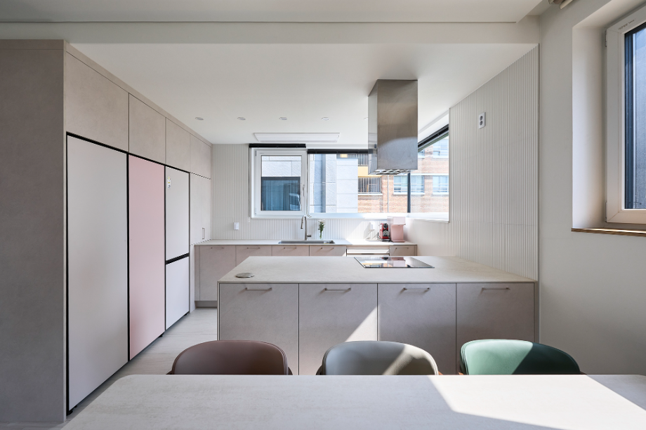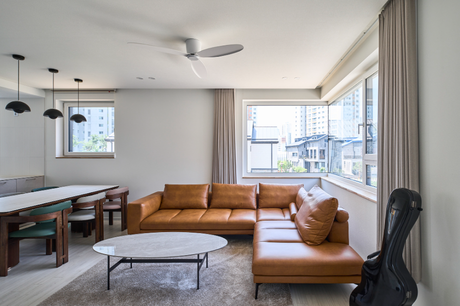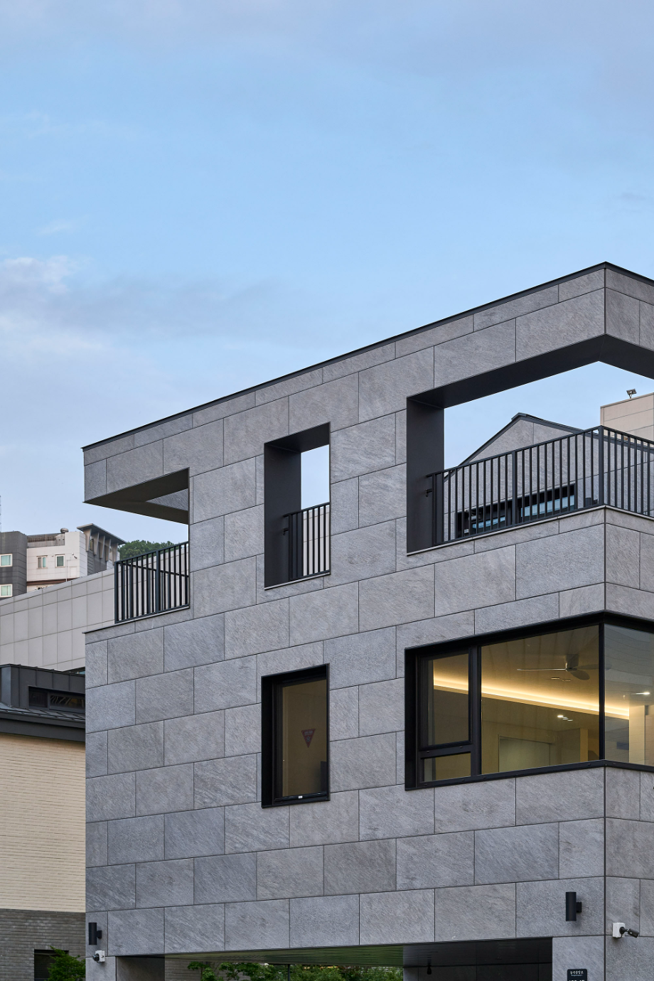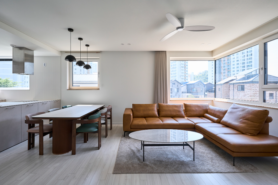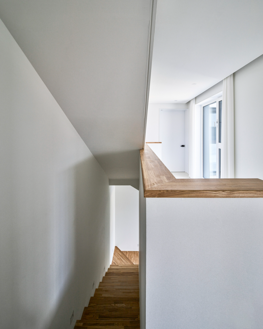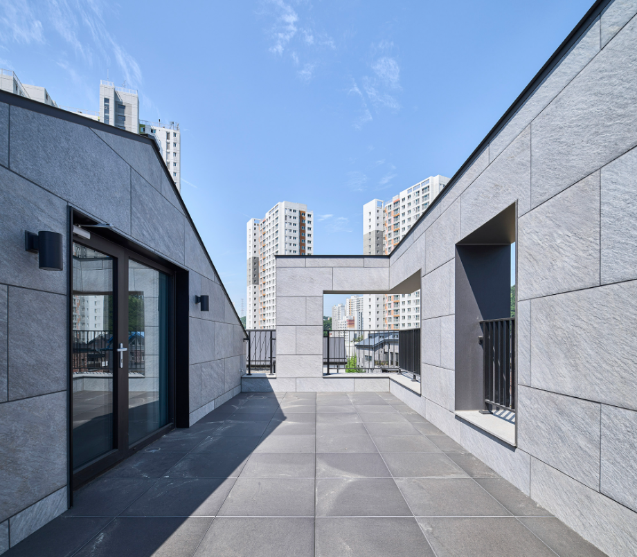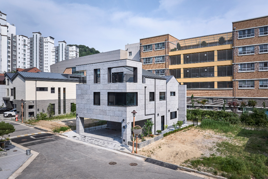 북측 공원 조망을 최대한 담기 위해 거실에 코너창을 설치하고, 중정을 향해 창을 내어 채광과 조망을 해결했다. 또한 남측으로 면한 공간에는 고창을 설치하여 고등학교로부터의 시선을 차단함에 따라 프라이버시를 확보했다. 다락 테라스 공간의 영역을 형성하는 옥상 구조물을 디자인하여 외부 시선도 일부 가려줄 뿐만 아니라 가로변에서의 외관을 강조할 수 있도록 계획했다.