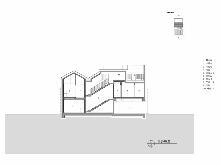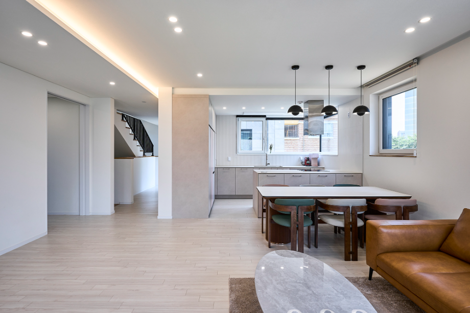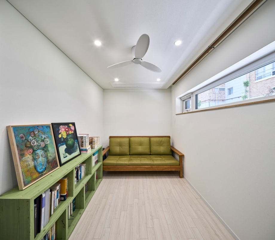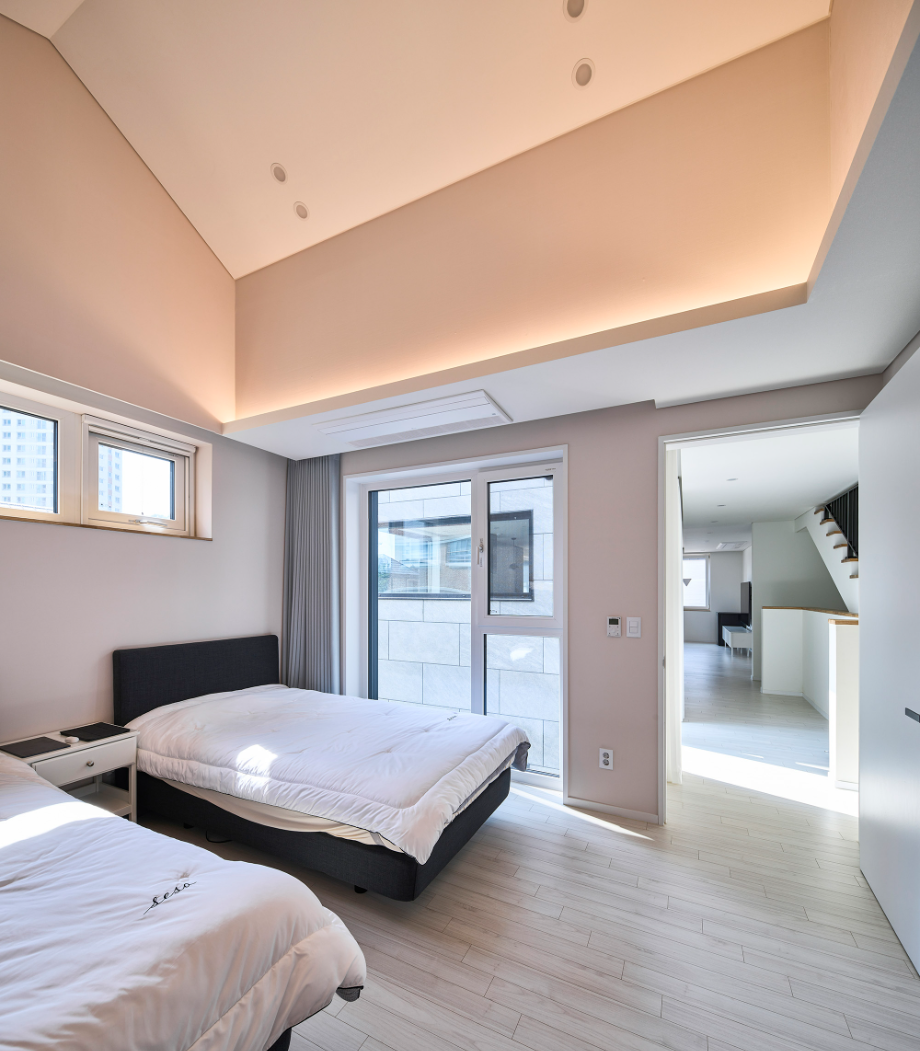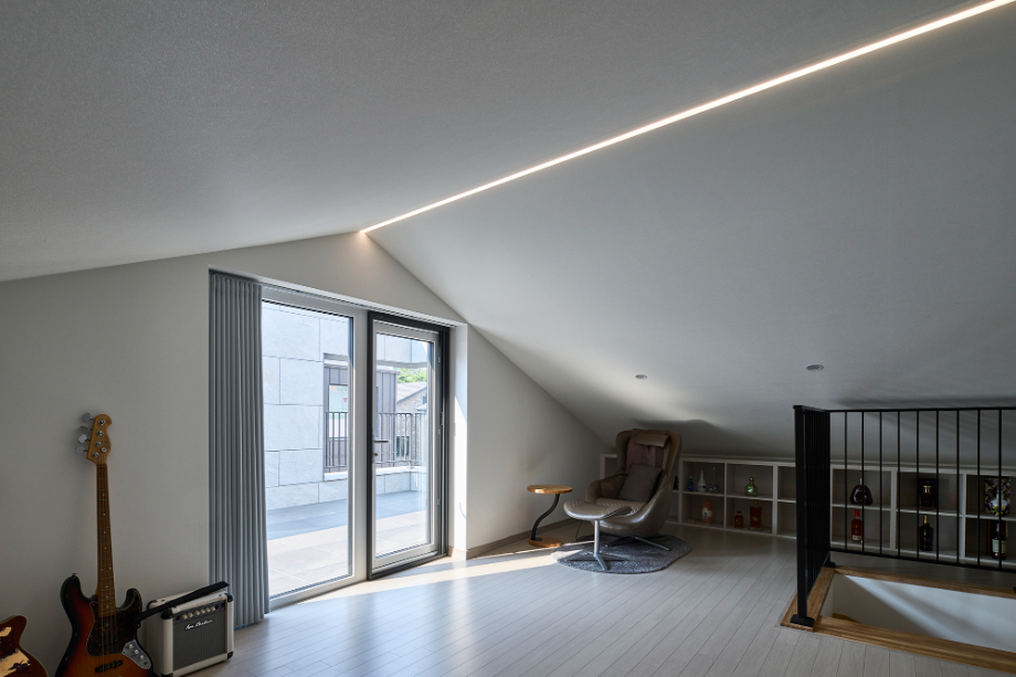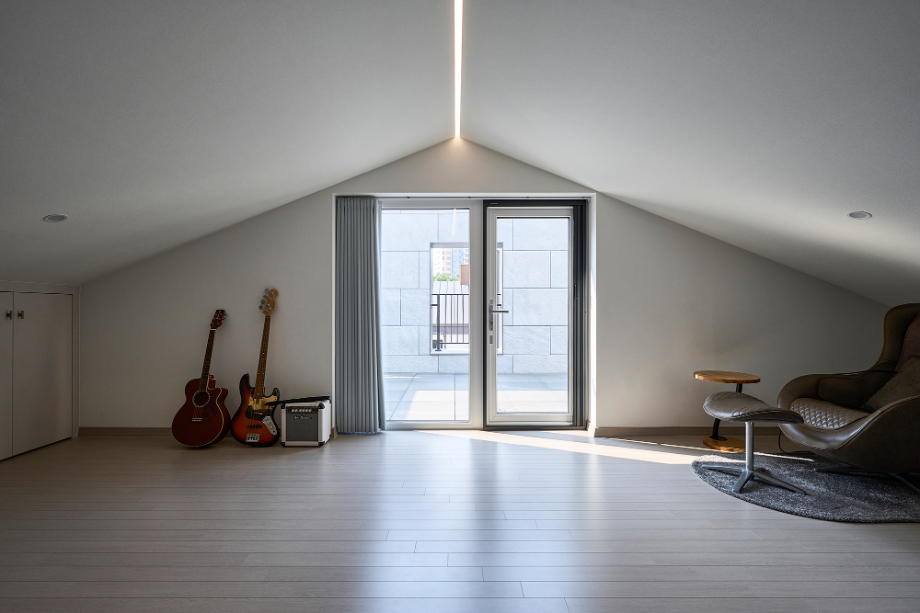 1층에 필로티 주차공간과 현관, 자녀방, 가족실을 배치하고 2층을 메인공간으로 구성하여, 거실과 식당, 주방, 다용도실 등을 하나의 공용공간 공간으로, 부부안방을 비롯한 드레스룸, 욕실 등의 마스터존을 다른 하나의 공간으로 구성했다. 2층 마스터존에서 다락으로 올라가면 음악활동을 취미로 가진 건축주만의 공간이 펼쳐지고 테라스에서 휴식을 취할 수 있도록 계획했다.
