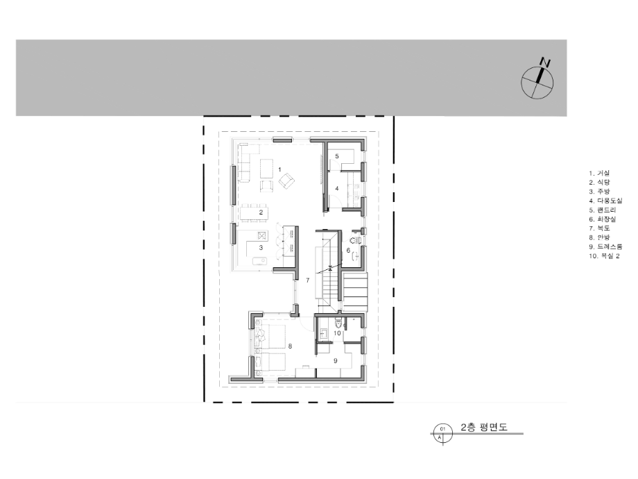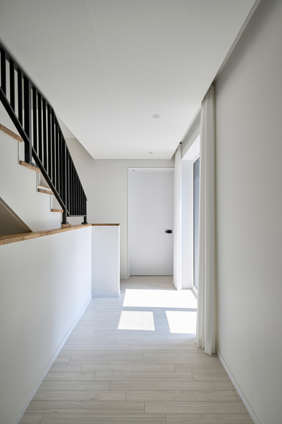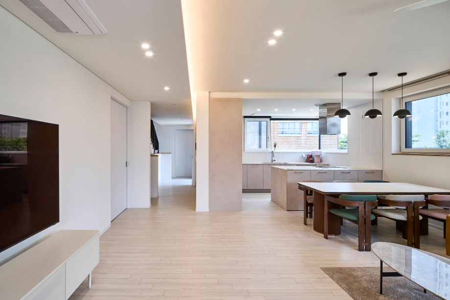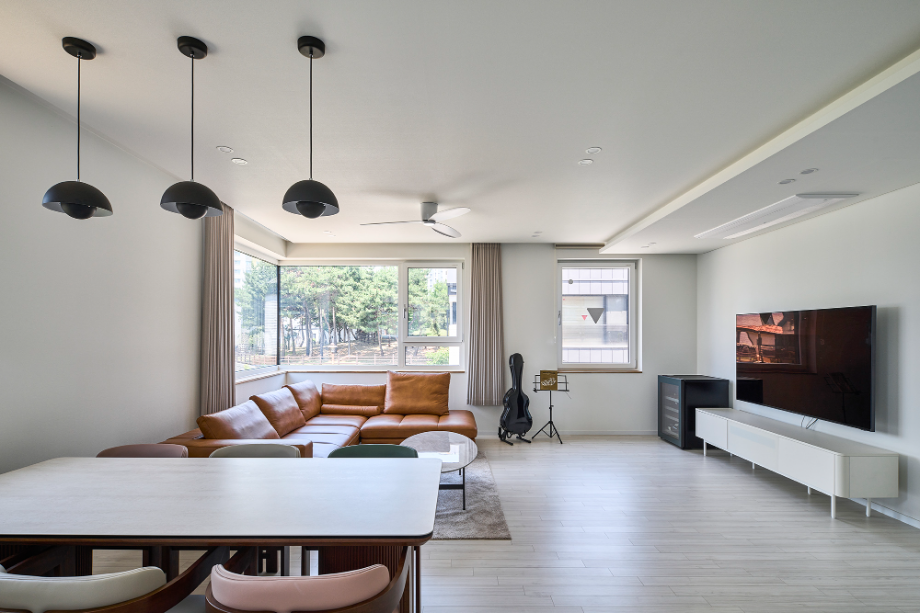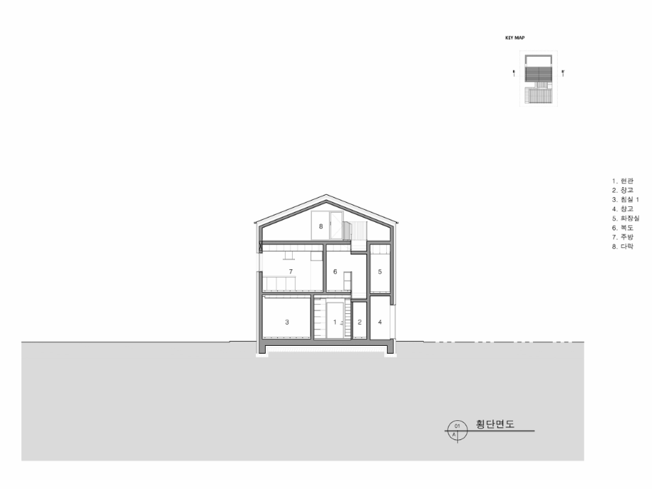 1층에 필로티 주차공간과 현관, 자녀방, 가족실을 배치하고 2층을 메인공간으로 구성하여, 거실과 식당, 주방, 다용도실 등을 하나의 공용공간 공간으로, 부부안방을 비롯한 드레스룸, 욕실 등의 마스터존을 다른 하나의 공간으로 구성했다. 2층 마스터존에서 다락으로 올라가면 음악활동을 취미로 가진 건축주만의 공간이 펼쳐지고 테라스에서 휴식을 취할 수 있도록 계획했다.